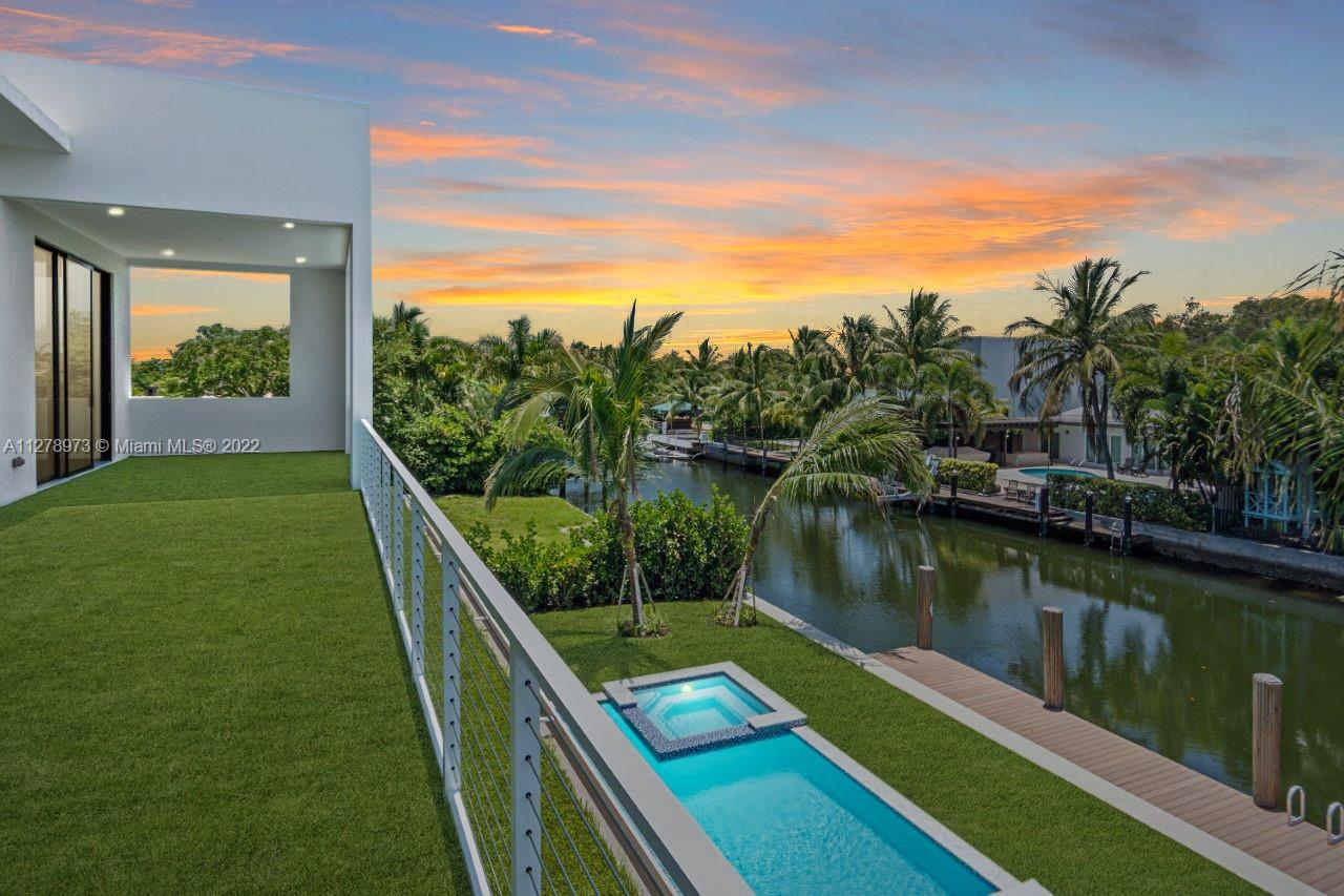 Just finished! Move in Immediately. NEW Modern 2 Story Waterfront Pool Home w/Ocean access, No bridges to Bay. 5 bed & 5 Baths (5th room set us as den/office/upstairs sitting area) on quiet cul-de-sac street. 1st and 2nd floors are solid concrete. Features: New synthetic Dock with 75 ft on the water, Quick ocean access! Water views from many rooms. Open floor plan with soaring high ceilings, impact/Hurricane rated glass and 10ft floor to ceiling glass, natural gas, and 2 car garage. Primary bedroom features huge balcony overlooking the pool and water. All closets built out! New Heated pool with inlayed waterfall Jacuzzi. Located in 24 hr guard gated Islands of Keystone Point, Miami, Florida.