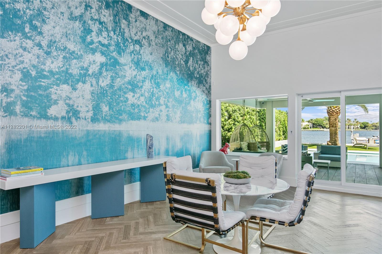 Incredibly scenic views across the wide water and onto the magnificent estate properties of Billionaire's Bunker on Indian Creek! Watch the yachts sail by while enjoying beautiful sunrises and sunsets. Spectacular mid-century modern with an elegant and charming interior that's been finished to the nines and adorned with fine touches from Britto Charette, porcelain-wood herringbone floors, Lutron and Sonos technologies, and so much more. A boater's paradise equipped with a lift for boats/jet skis, heated saltwater pool and BBQ area, the home is great for families and prefect for entertaining. One of Miami’s very few gated island communities with all waterfront properties. Ideal location nearby schools, a multitude of dining options and shops, and just minutes from the white sand beaches.