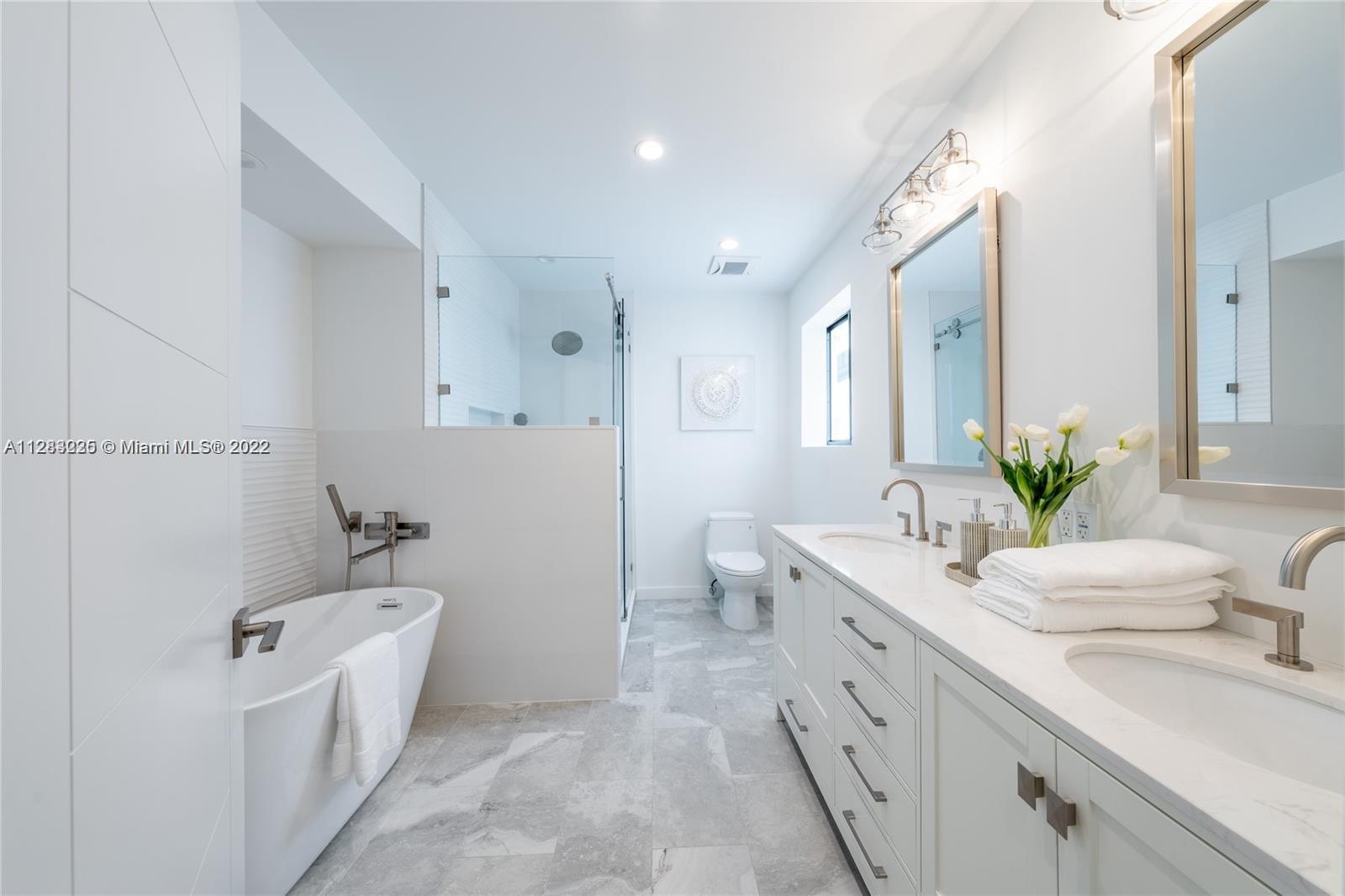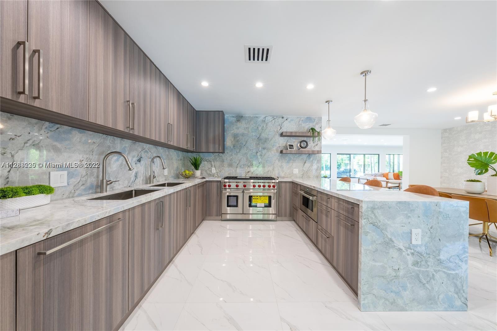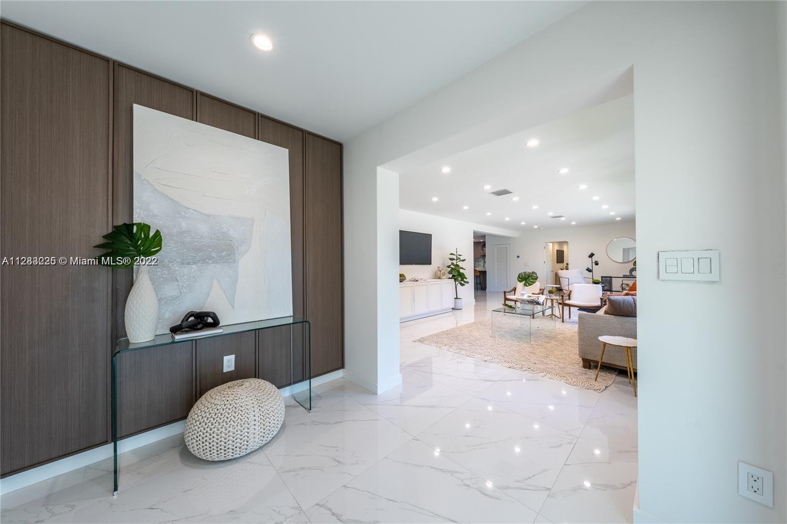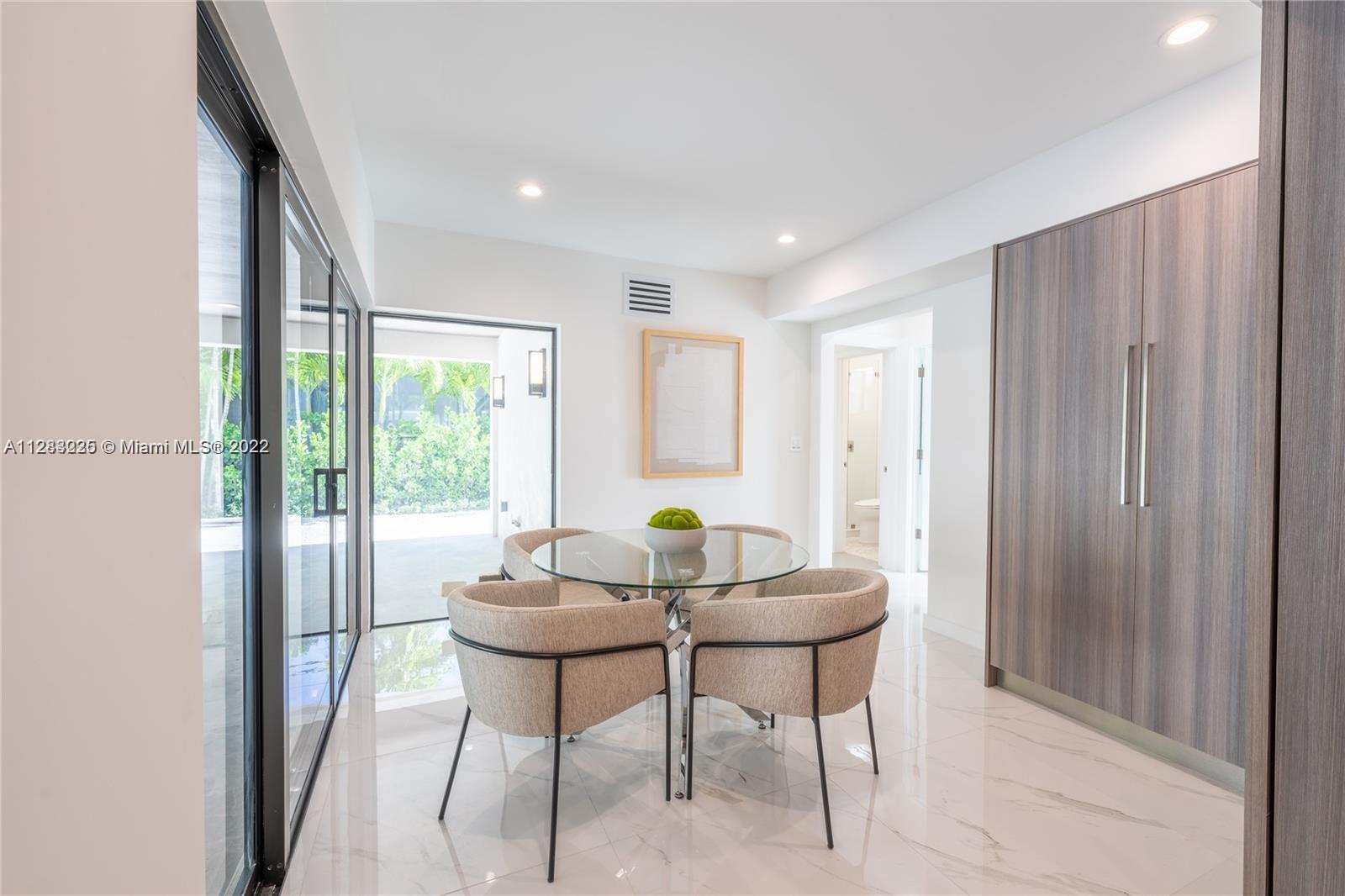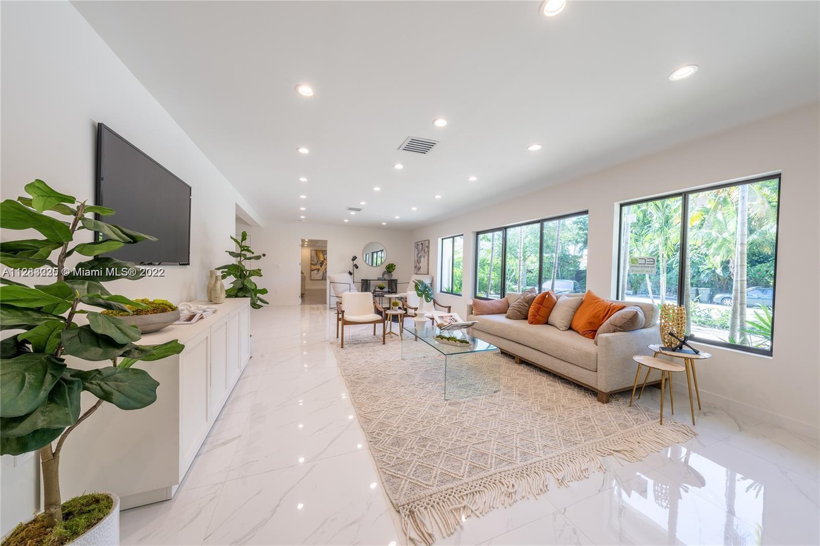 Fine design meets resort luxury with this beautifully redesigned Bay Harbor Islands home. Completed in July 2022, it features 4 bedrooms + a den and 4.5 bathrooms on an oversized 10,938 ft.² lot. The fabulous floorplan connects the generous living room, sun-filled dining room, and high-end open kitchen with rich wood cabinetry, quartzite stone countertops, and Wolf & Dacor appliances, including an oversized gas stove. Relax, refresh, and entertain in style with a new patio and saltwater pool surrounded by lush palms. The home has high-impact windows & doors, new plumbing & electric, gas water heater & dryer, and a control 4 smart home system. Living area is 3,324 Sq.Ft