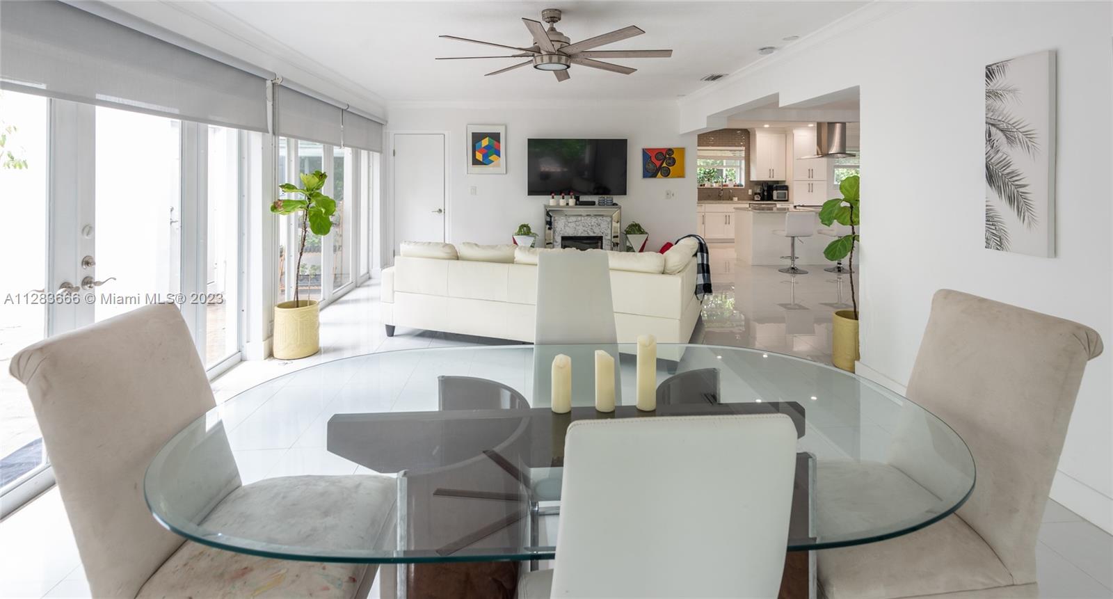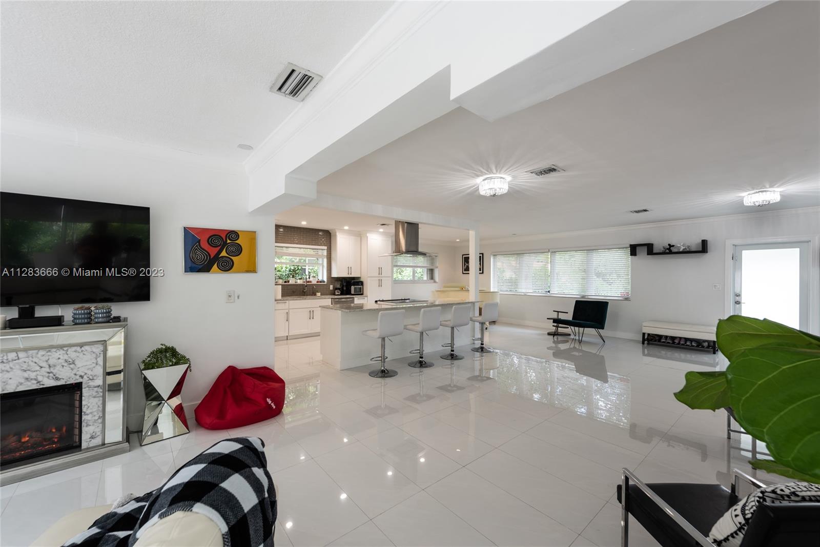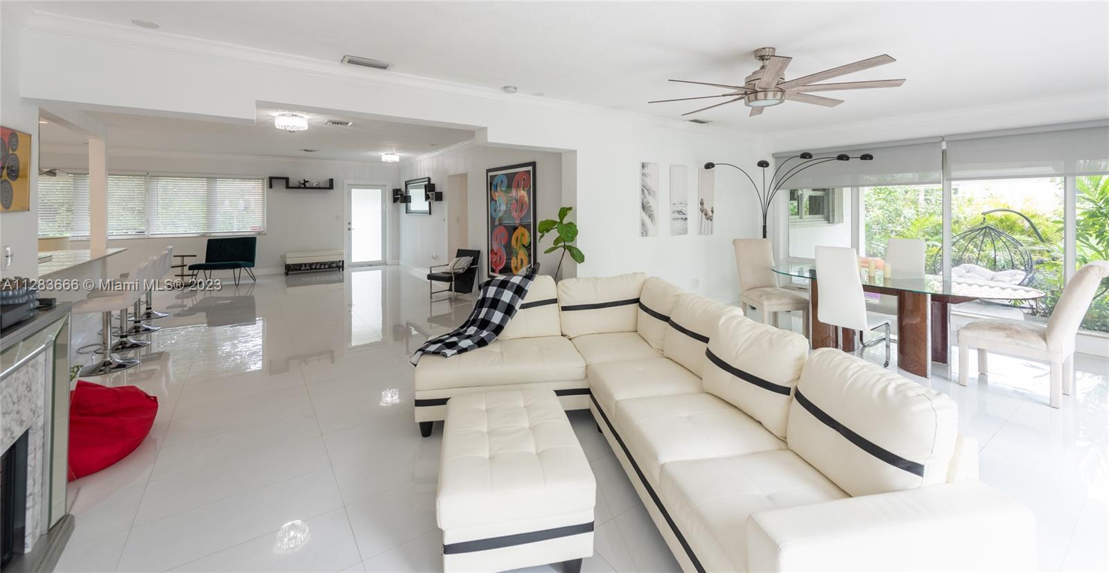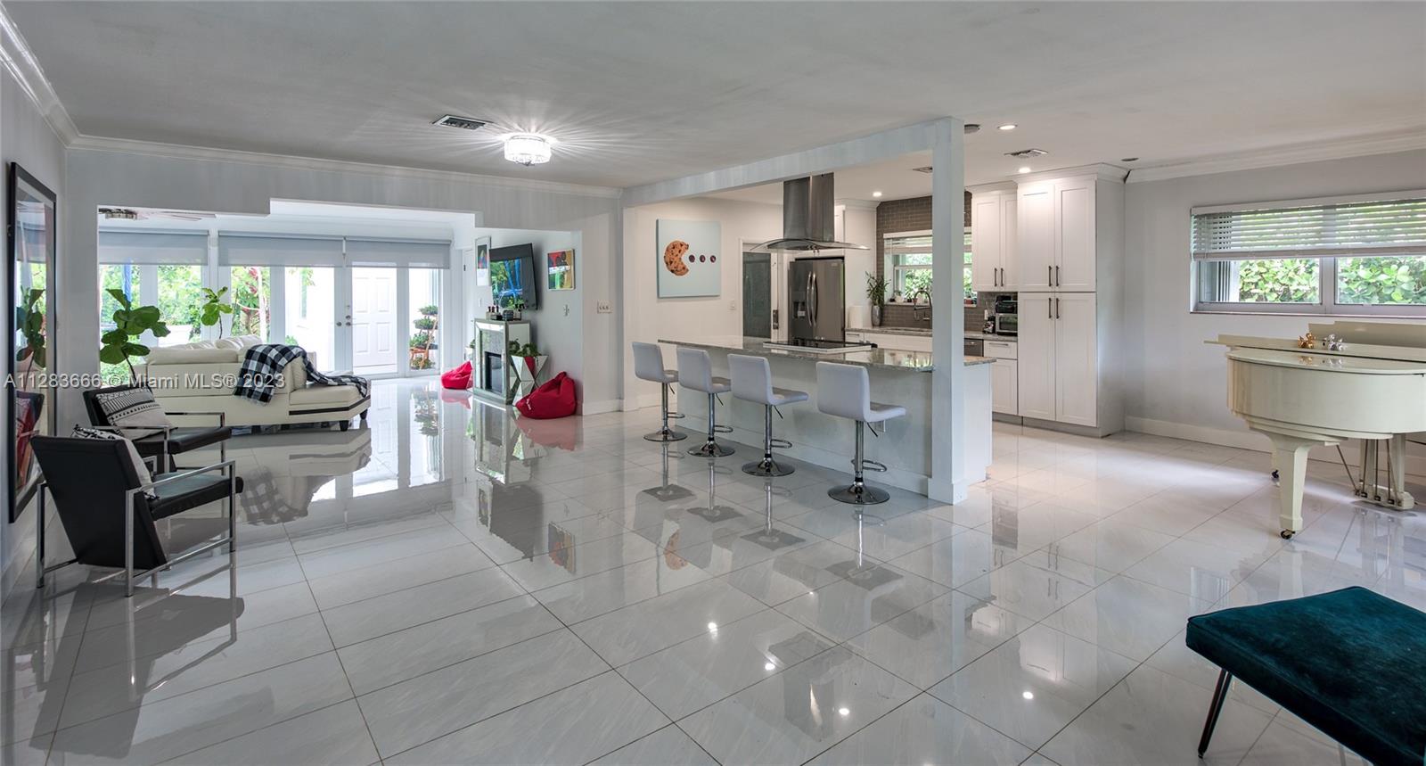Light and bright just-updated 4/2 in serene and quiet pocket of super-sought-after Miami Shores. Beautiful home with open floor plan and lots of light. Many updates include sleek white porcelain flooring throughout, lots of impact windows uniting interior with tropical garden, new chic white kitchen with quartz counters, and stylish baths. Amazing backyard with outstanding landscaping and plenty of room for a pool. A great value in a super-desirable location.