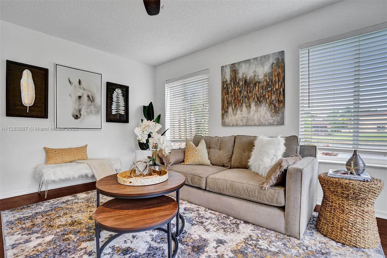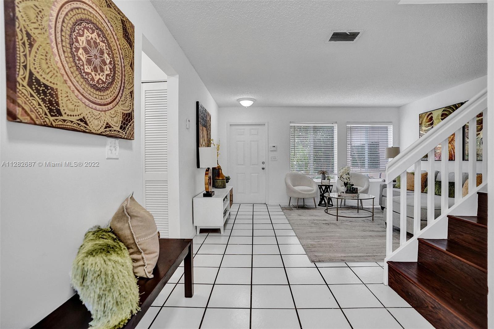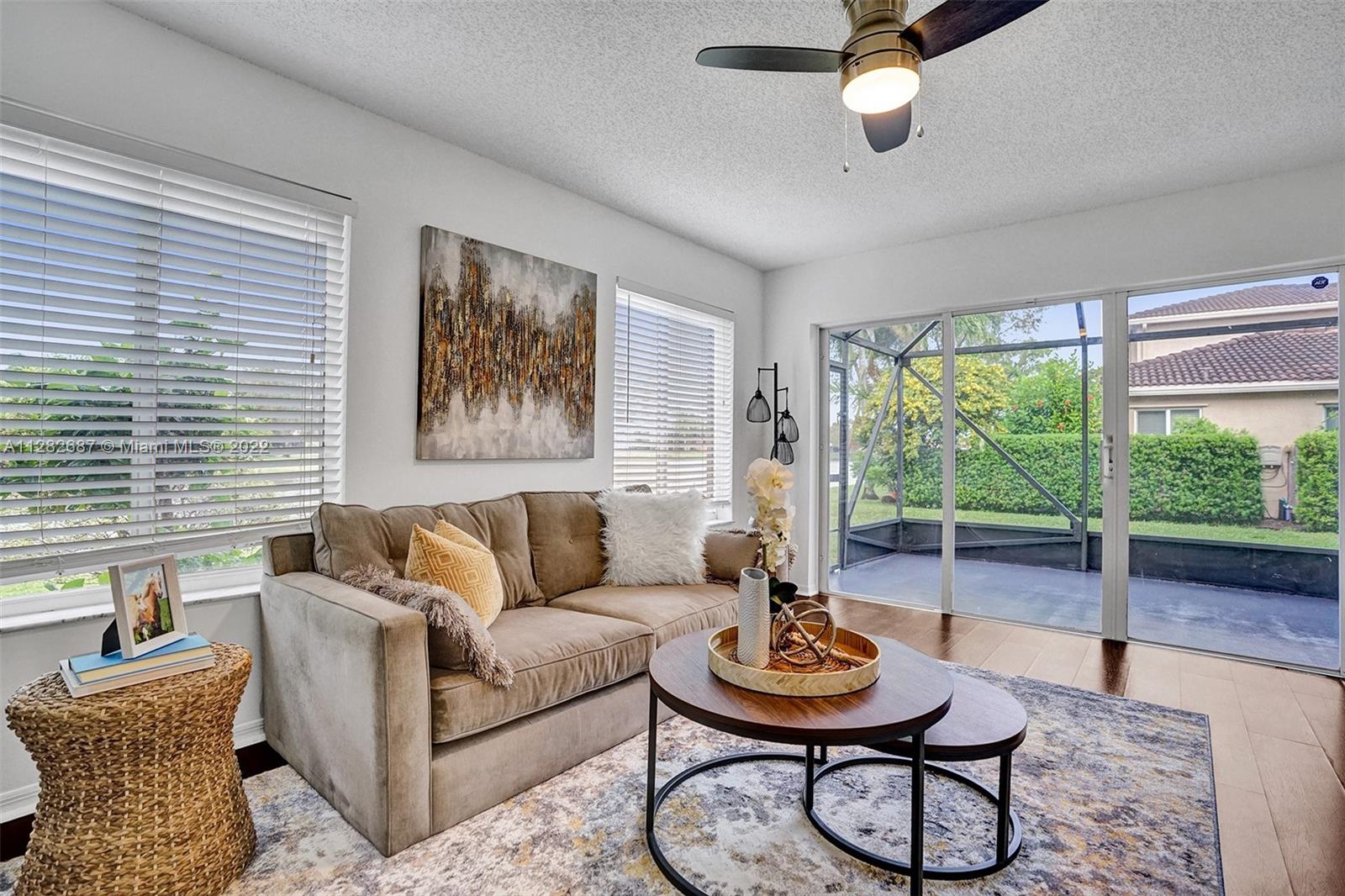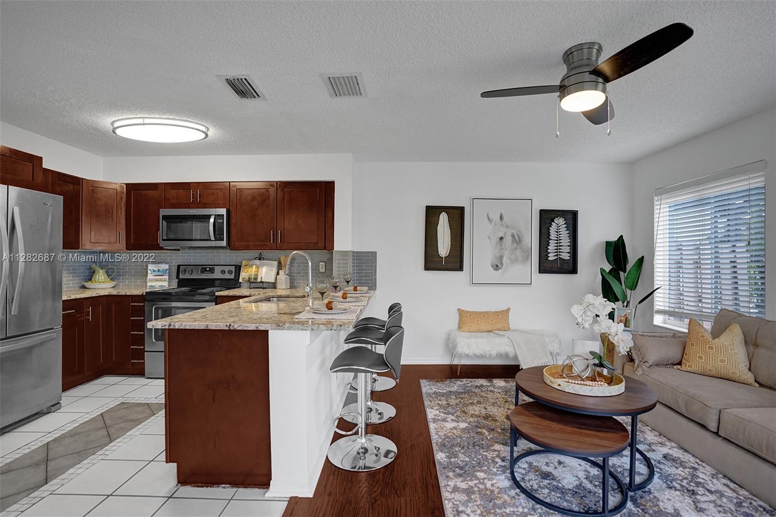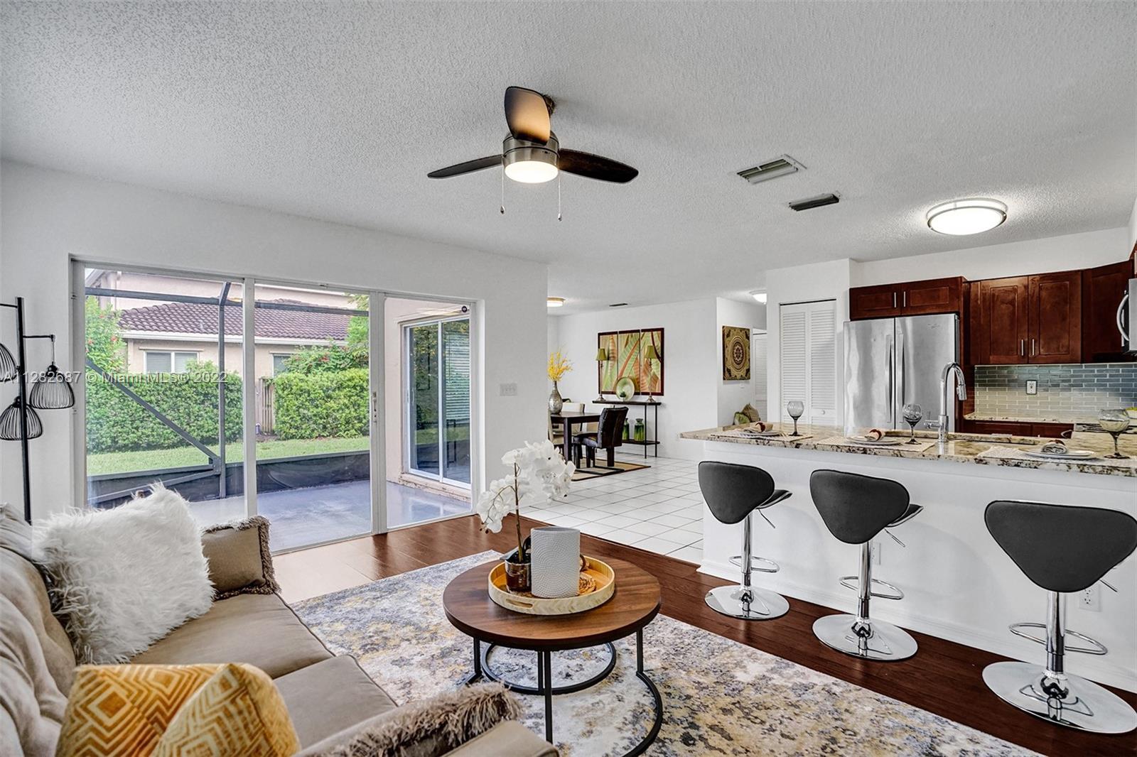 Looking for a place to call home, where you will actually meet your neighbors and children still play outside, then welcome to The Village at Harmony Lake !!! Spacious 4 bed, 2.5 bath townhome in Davie over 1800 sqft w/garage. Located on quiet cul de sac with peaceful water views & screened porch. This light and bright unit features upgraded granite kitchen and stainless steel appliances with breakfast bar overlooking large family room with water views. The dining room accesses the screened porch, perfect for family barbecues! Large master suite with updated bathroom and walk-in closet. Newer laminate flooring in all bedrooms. New A/C. Hurricane shutters in garage. Low HOA $472 quarterly. Community pool and playground. Superior schools. A pet friendly community perfect for your family!