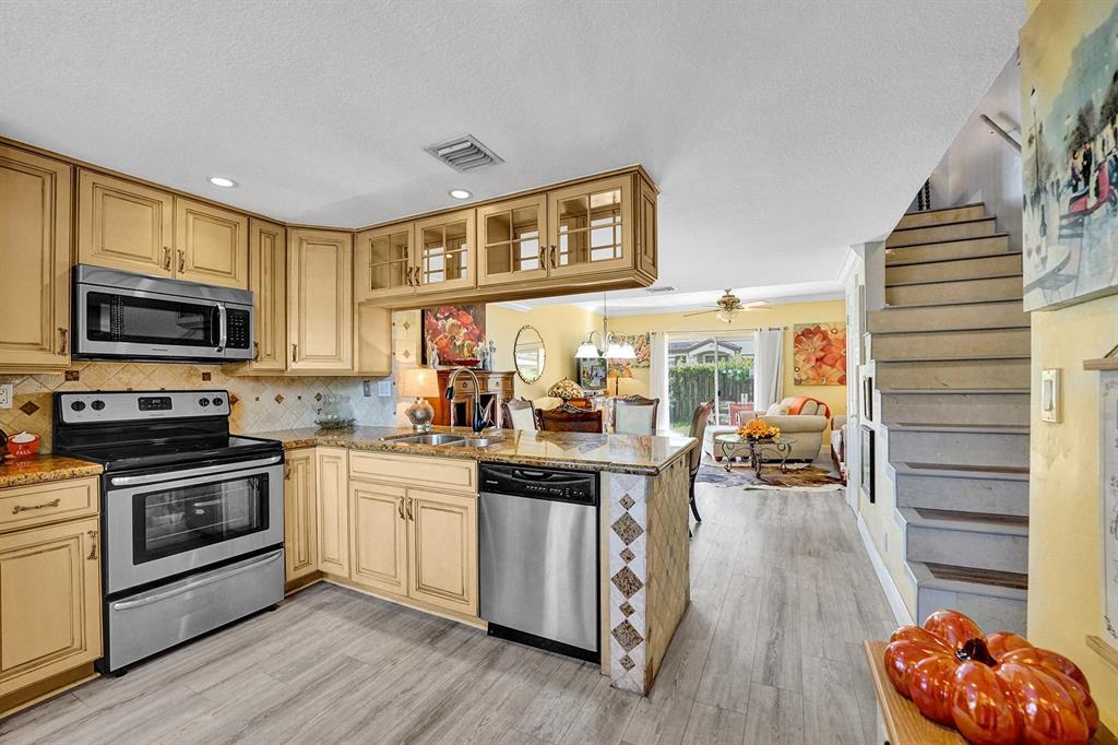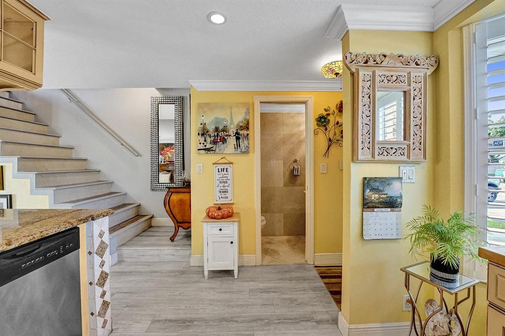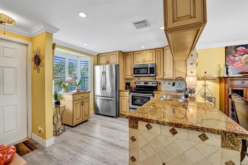 Experience the best of beach area living in this fully renovated east pompano beach townhome. Updates include white oak wood laminate floors, marble tiled bathrooms, stainless steel appliances, granite kitchen countertops with wood thomasville cabinetry providing lots of additional storage are just to name a few. Moveable butcher block kitchen island. Upstairs you'll find double master bedrooms with en-suite baths, additional storage closets and a stackable washer/dryer. Natural light pours into each bedroom with builder added option vaulted ceilings. Even more storage in large attic with pull down stairs. The half bath downstairs is convenient for guests and features floor to ceiling marble. The back patio has plenty of room for your guests and is great for pets with a private grass area.