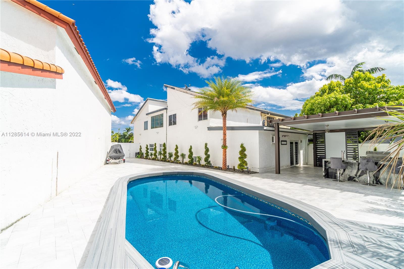 You don't want to miss this completely remodeled 3/2.5 one of a kind Gem, with over $300,000 in upgrades! This home is ready for a family to enjoy the extras, like the large outdoor area that includes a Pergola, Exterior Granite kitchen with a build-in Grill next to a Gorgeous Pool. You will also find hurricane impact windows with the highest rating throughout the whole home, and a new kitchen that has never been used and ready for some new recipes! Large master bedroom with high ceilings, a luxurious large master bathroom, porcelain Tiles throughout the entire home, Marble stairs with glass, This is a must see home! Motivated seller
