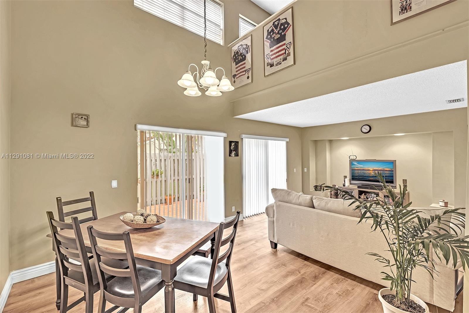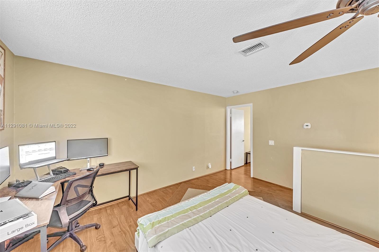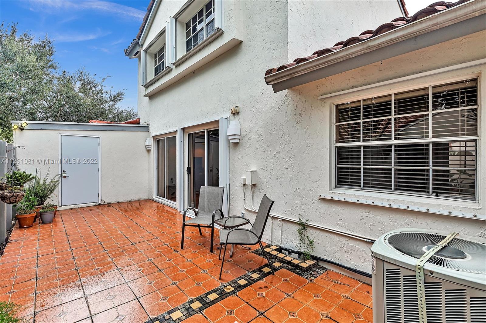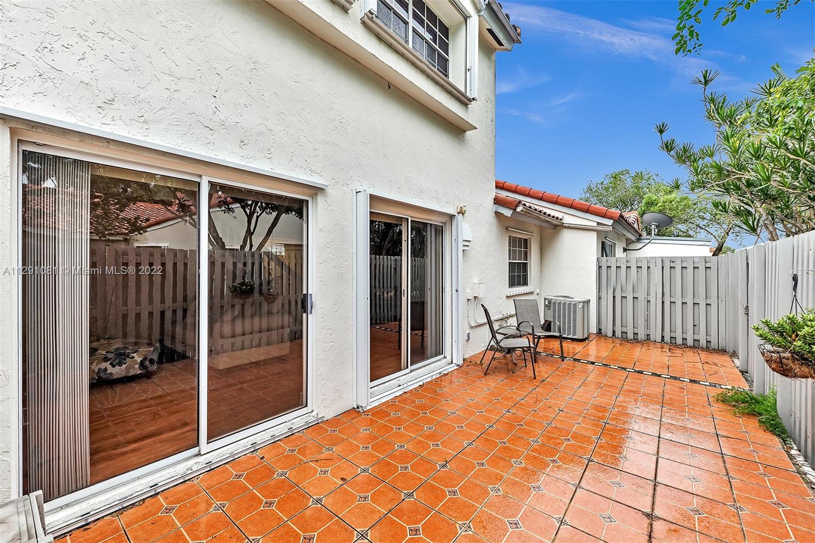 Exceptional townhouse offering two bedrooms two bathrooms plus a spacious loft and fenced yard. Private view overlooking green area. Enter the great room and experience the 2 story volume ceiling which provides lots of natural light and open feeling. Eat-in kitchen has cozy breakfast area. Floor plan flows with 2 master suites, one upstairs/one downstairs, each with direct access to bathroom and large walk-in closets. Additional features include waterproof vinyl flooring downstairs and laminate in bedrooms and loft, full size front loader washer and dryer, large storage shed, accordion shutters upstairs and panels downstairs. Pets are welcome! Investors welcome! Certain trucks are permitted. Unit has 2 assigned parking spots. Steps to community pool, parks and shopping.