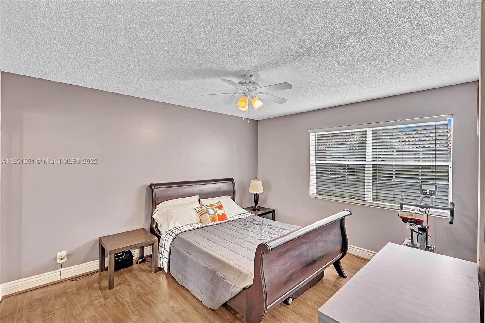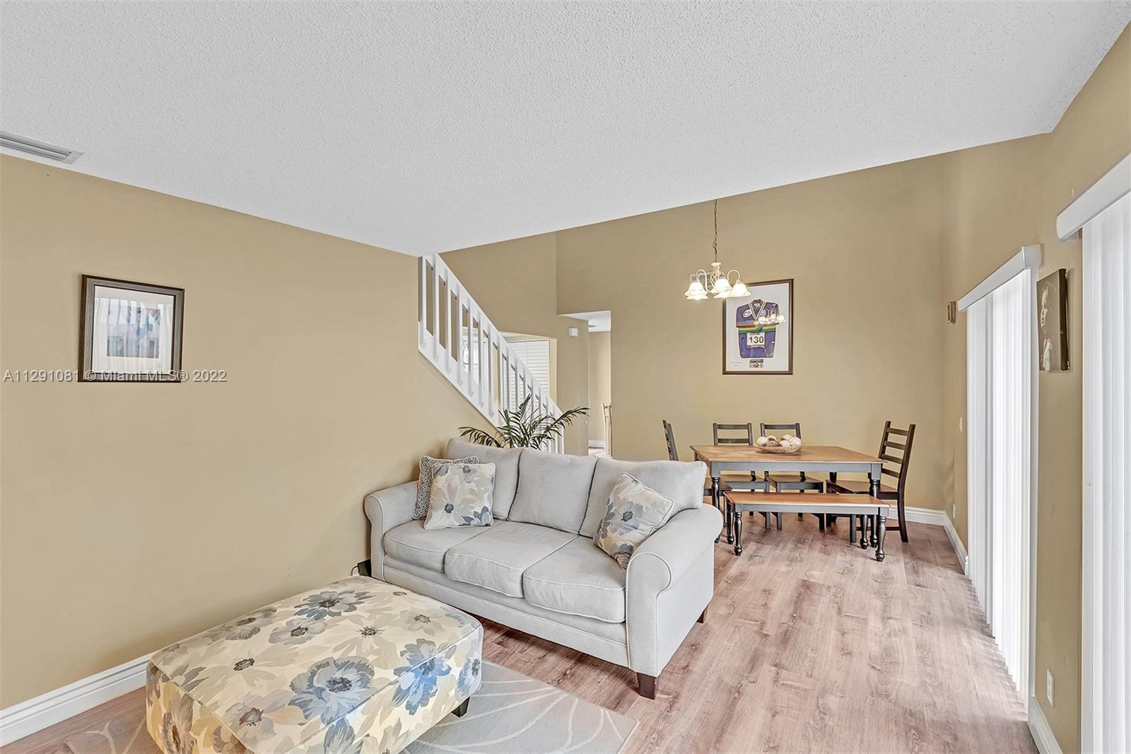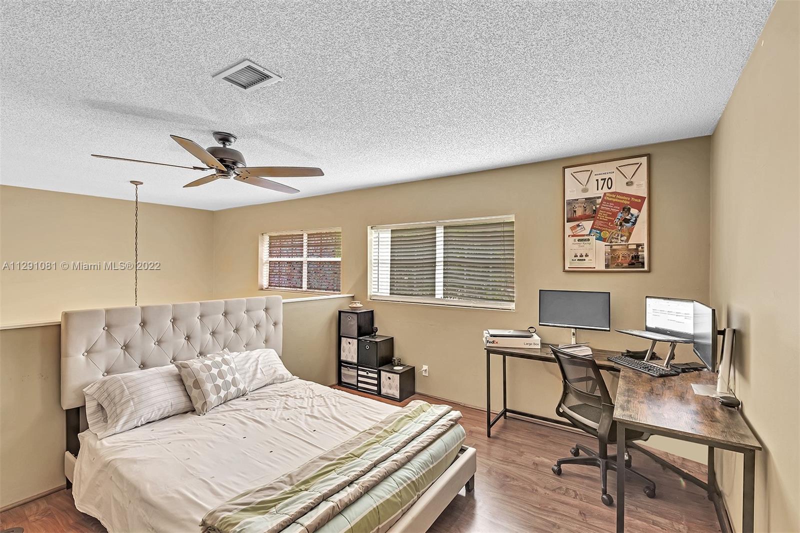 Exceptional townhouse offering two bedrooms two bathrooms plus a spacious loft and fenced yard. Private view overlooking green area. Enter the great room and experience the 2 story volume ceiling which provides lots of natural light and open feeling. Eat-in kitchen has cozy breakfast area. Floor plan flows with 2 master suites, one upstairs/one downstairs, each with direct access to bathroom and large walk-in closets. Additional features include waterproof vinyl flooring downstairs and laminate in bedrooms and loft, full size front loader washer and dryer, large storage shed, accordion shutters upstairs and panels downstairs. Pets are welcome! Investors welcome! Certain trucks are permitted. Unit has 2 assigned parking spots. Steps to community pool, parks and shopping.