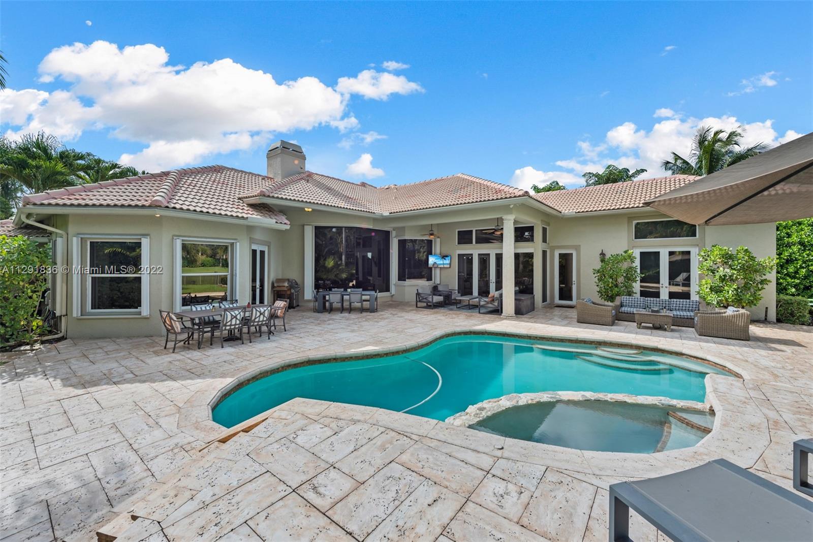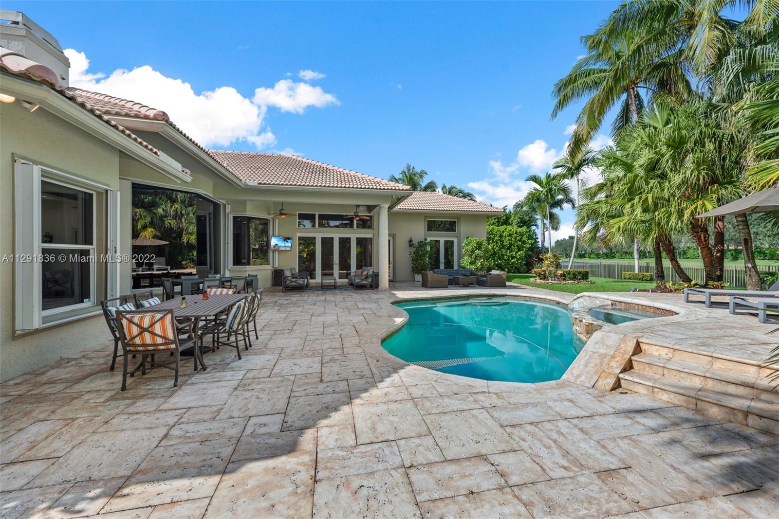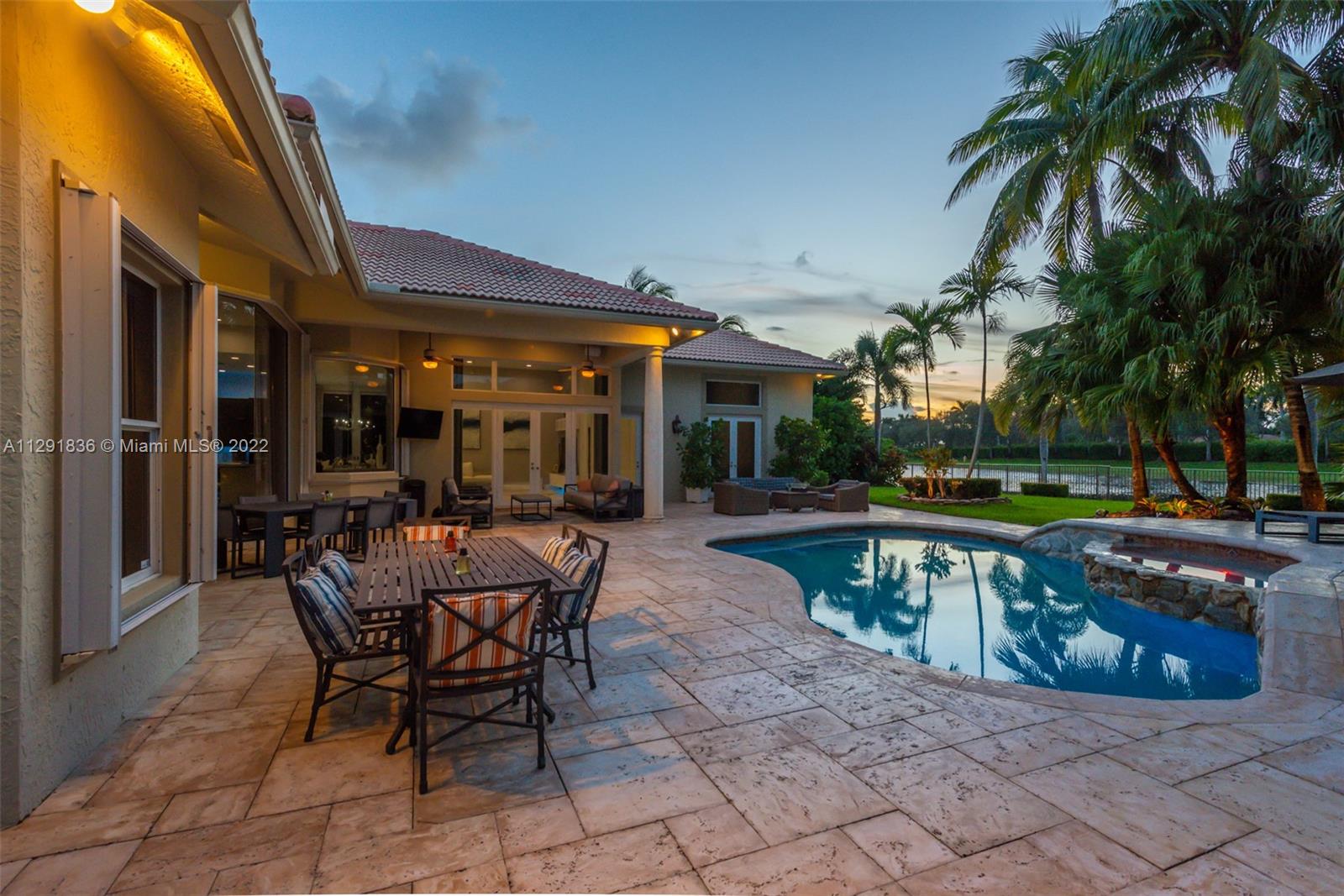 Corner Waterfront Property located in the coveted community of The Landings in Weston. 23,174 sq.ft. lot the property offers sweeping water views. Recently remodeled the living spaces seamlessly connect to the thoughtfully conceived lush outdoor areas including the covered terrace and heated saltwater pool/spa with plenty of space for lounging in the sun. The home features 4BR/4.5BA+Custom Office/Library, Large Den, Formal Dining room & 3-car garage. Entertainer’s kitchen, volume coffered ceilings, wet bar, wood burning fireplace and light filled interior are among the many modern conveniences to be enjoyed and perfect for the discerning Buyer.