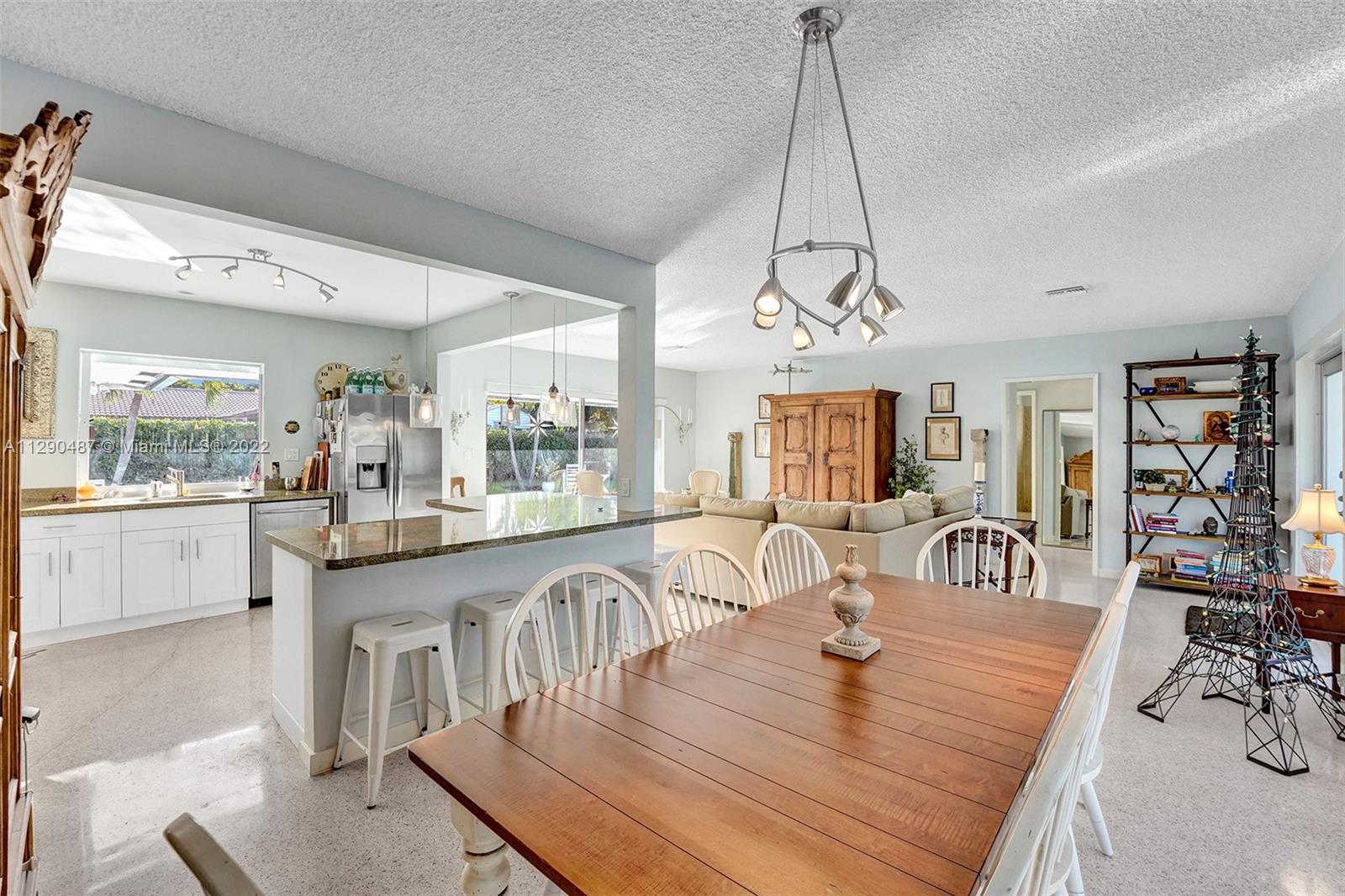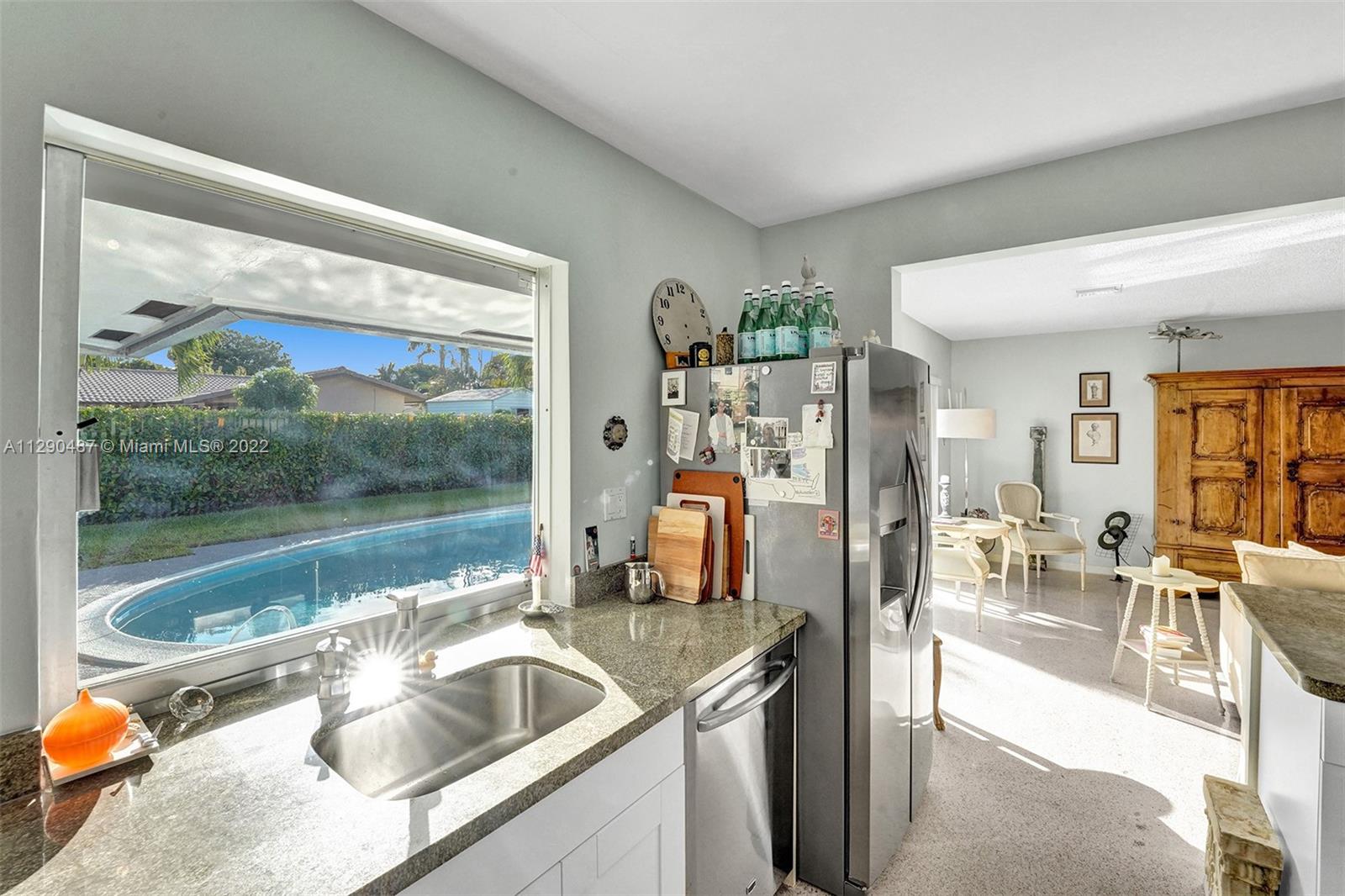 Immaculate 3/2 pool home in move-in condition. Many recent upgrades including white kitchen, SS appliances, granite counter, marble bathroom, glass shower, original gleaming Terrazzo floor, open floor plan w/pool garden view, private master wing with access to pool, walk in closet, guest wing w/private bath, pool access, double closets. Paved circular driveway, sprinklers, professional landscaping ,hurricane shutters, 2 car garage, laundry room, utility room and much more...