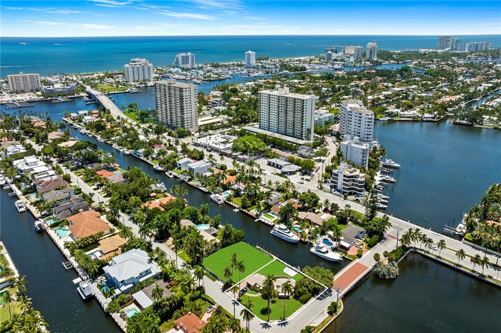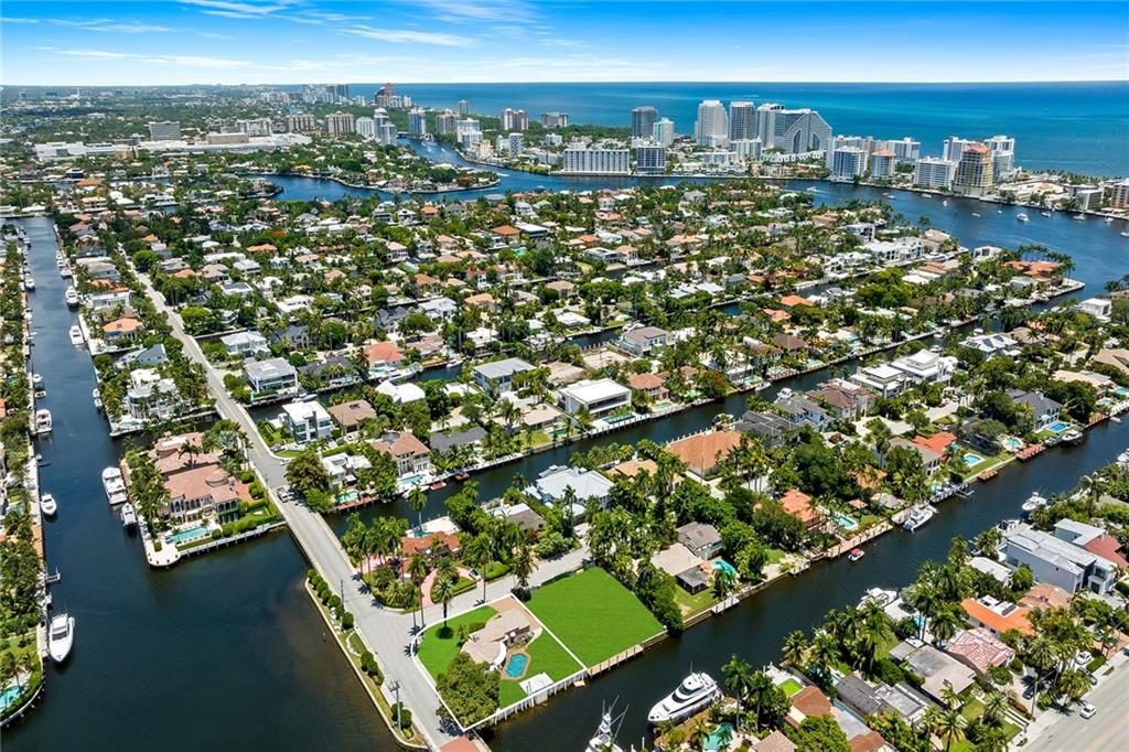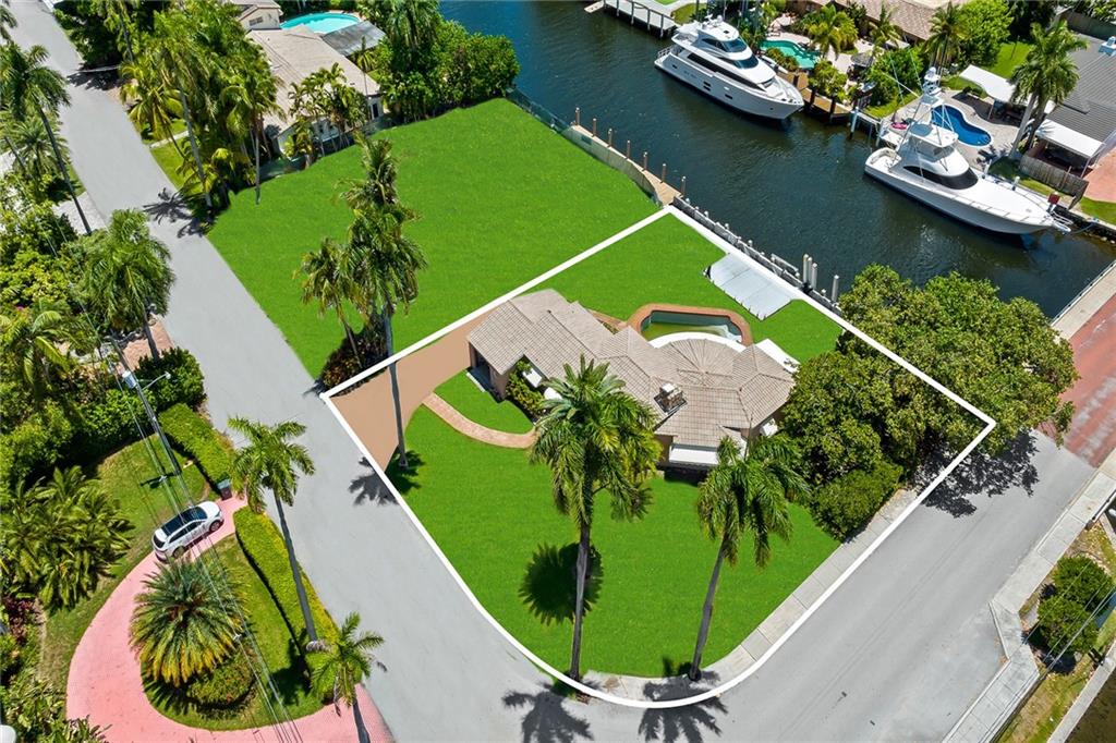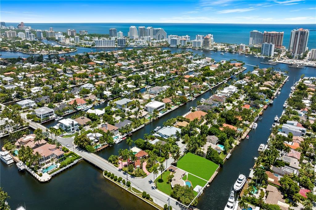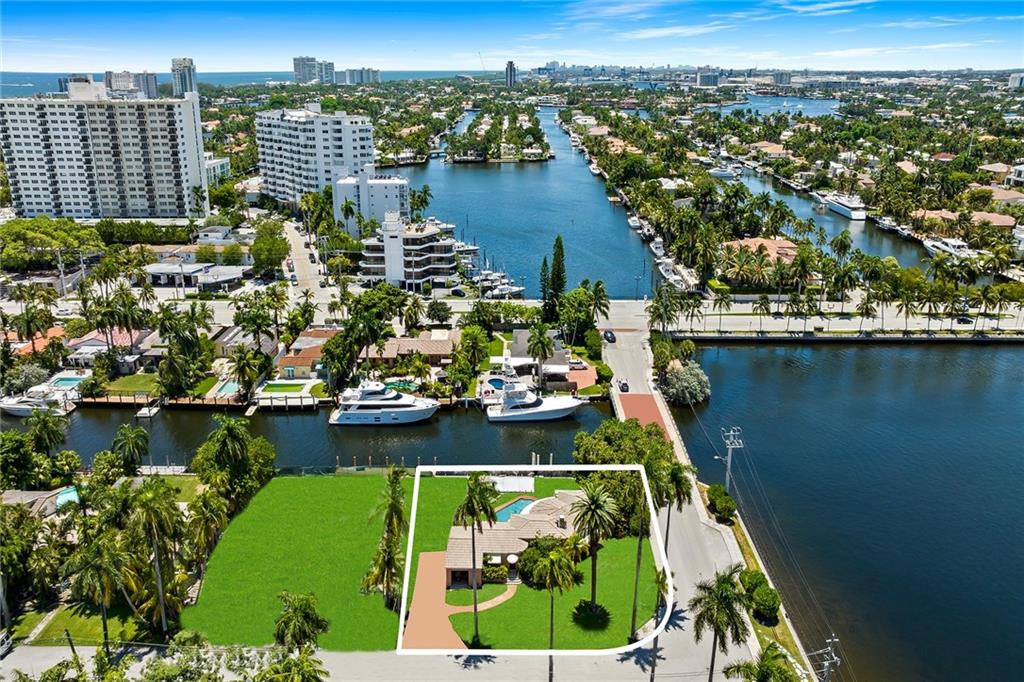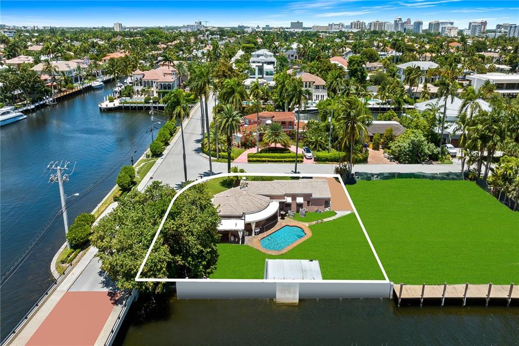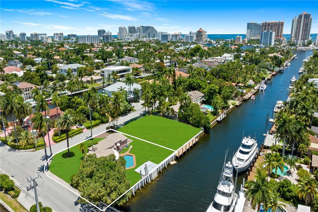 Fabulous opportunity to build on an extremely desirable corner lot in the exclusive Seven Isles just off Las Olas Blvd. This is being sold at land value with a brand new seawall currently under construction. A well positioned house here would offer amazing views that are very rarely found with waterviews on all 3 sides of lot, East view straight down canal, South water lake view, West waterview and also a downtown view! 100 ft of waterfront.... Photos and aerial shots should emulate view for new build!!