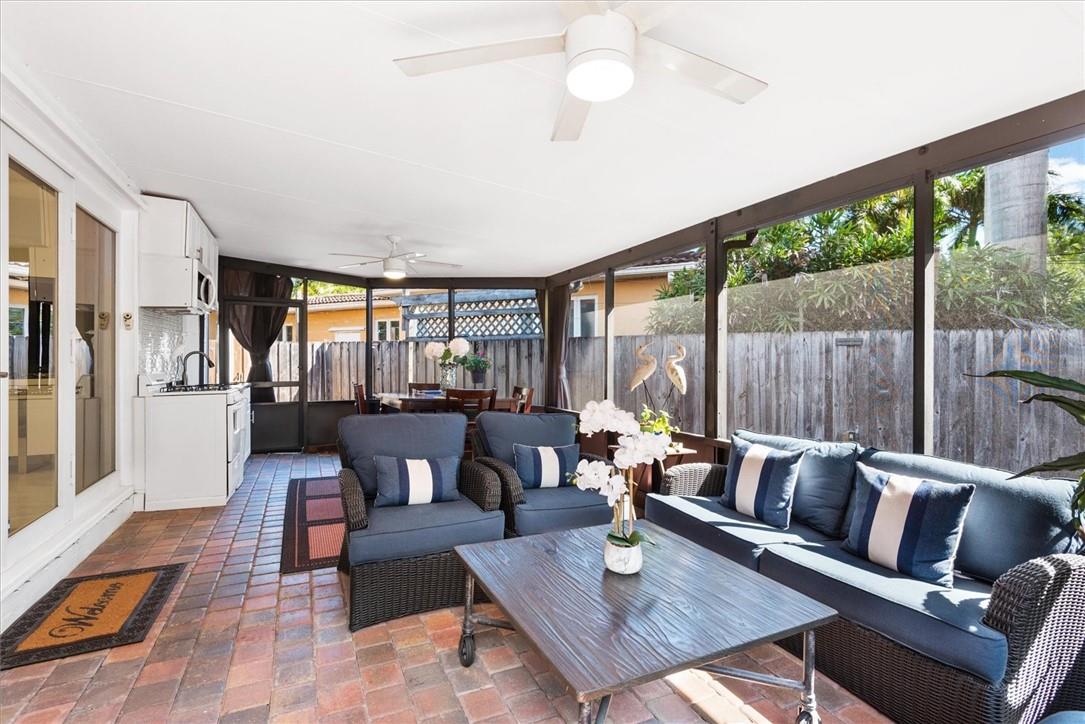 Pride of ownership in this renovated home located on a corner lot. Very well maintained residence featuring a light bright eat in kitchen with garden views, 3 bedrooms, 3 full bathrooms, built in closets, living room, dining room combination and a spacious cozy Florida room that leads to the expansive fenced in backyard for privacy. Mature trees add a warm gracious feel to outdoor areas that surround the property providing an atmosphere perfect for entertaining! White tile flooring throughout. One car garage with storage. Hurricane shutters included. Walking distance to Golf Course and Lake. Just a few minute drive to the ocean, restaurants and airport. A pleasure to show!