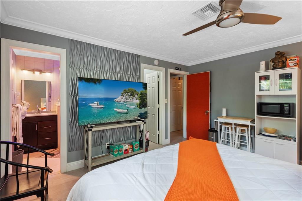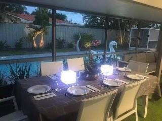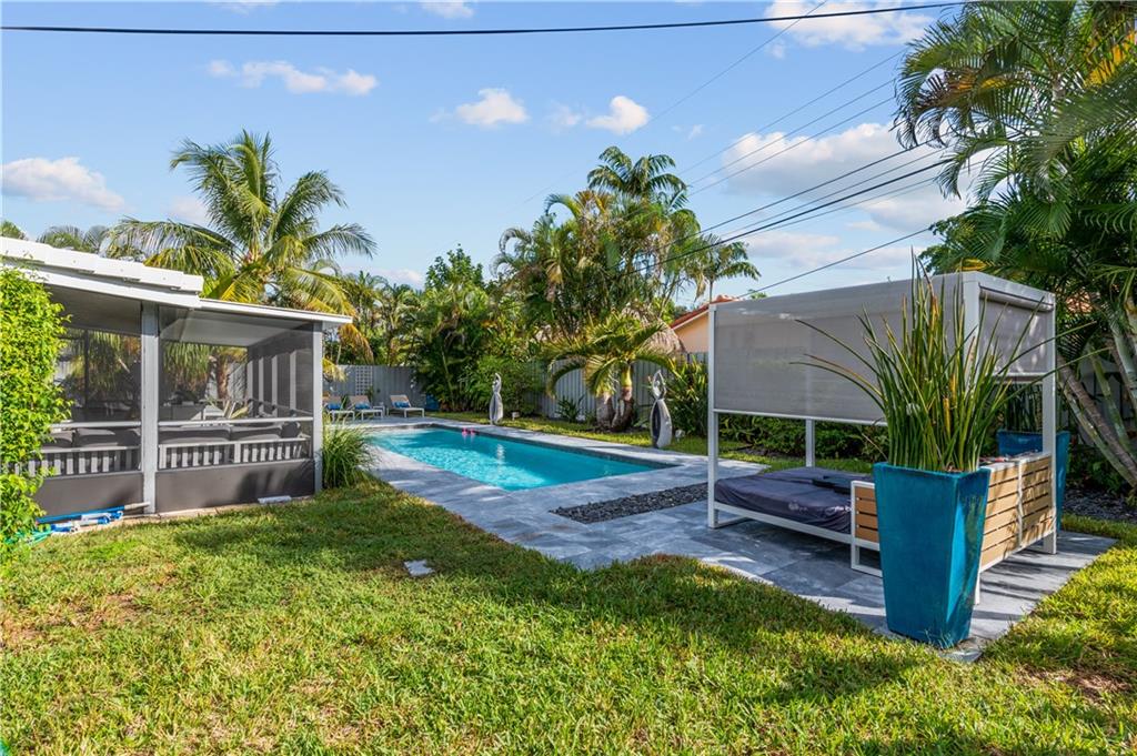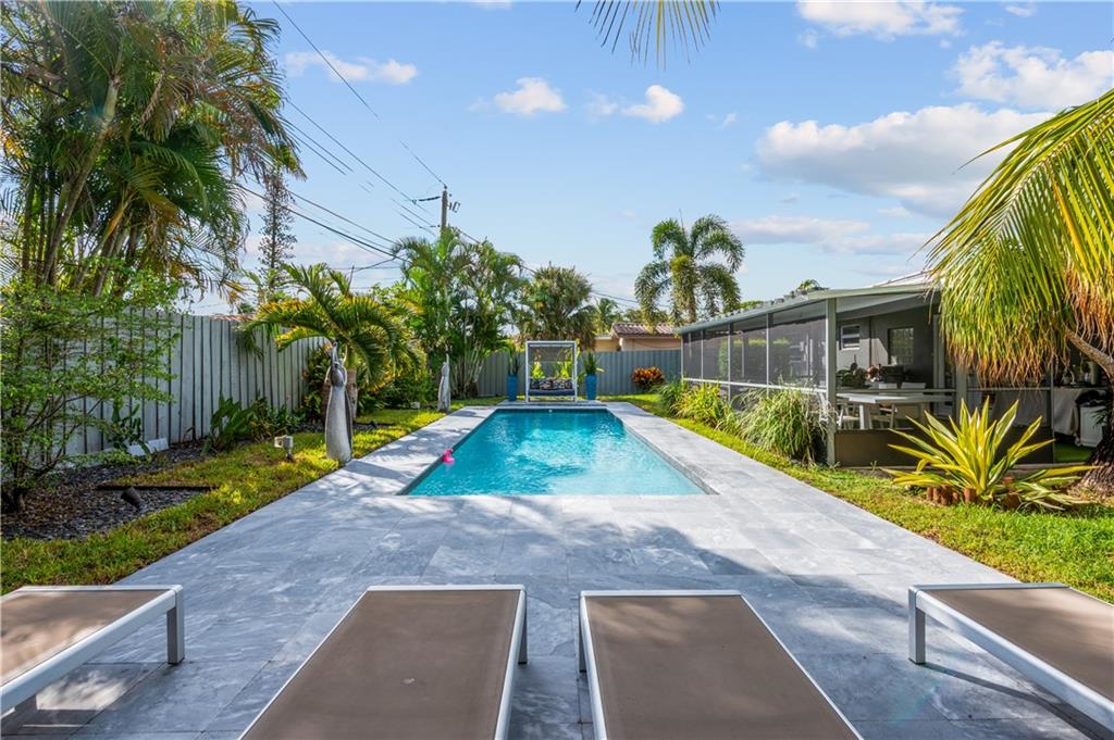 This property is a gem! It features 3 bedrooms, 2 bathrooms, a heated salt water pool and fully fenced gorgeous private tropical oasis backyard with an abundance of tropical foliage, to include a cabaña. Spacious screened patio with couch and firepit. New roof 2021. AC 2018. Pool 2019. Impact Windows. New wood flooring, Kitchen and bathroom 2019. Circular driveway. Outdoor Storage Room. No HOA! Could be an income generating property - Vacation rental / AirBnb. Third bedroom features a separate entrance, Ensuite bathroom and walk-in closet! Beach is only 1.6 miles away! Great location nearby dining, shopping, schools and much more! This property is a Must See!