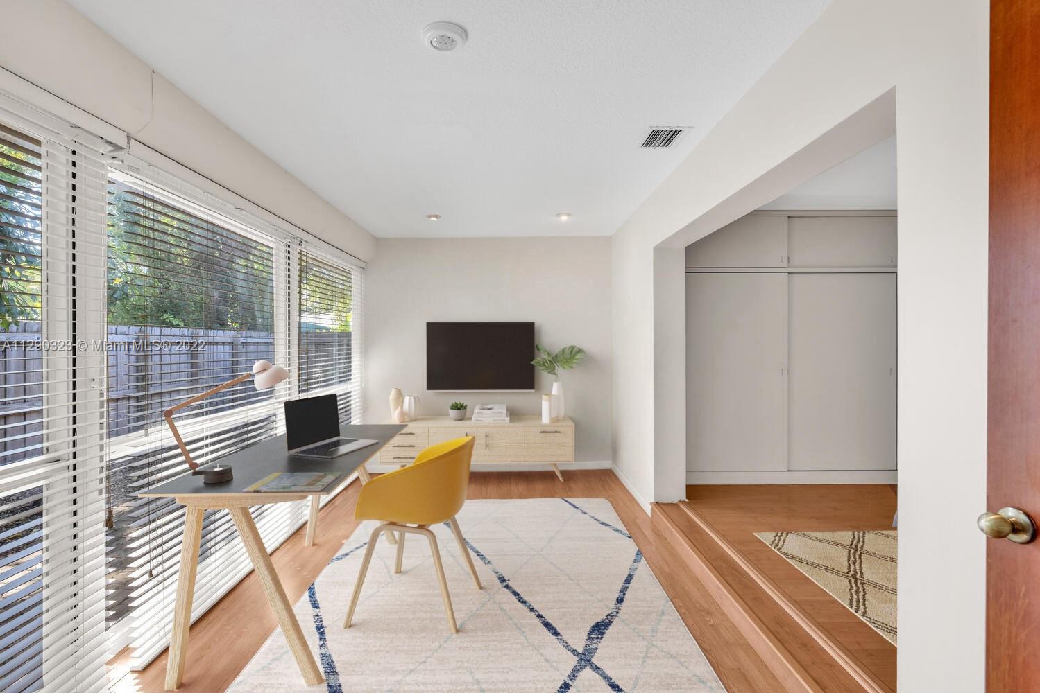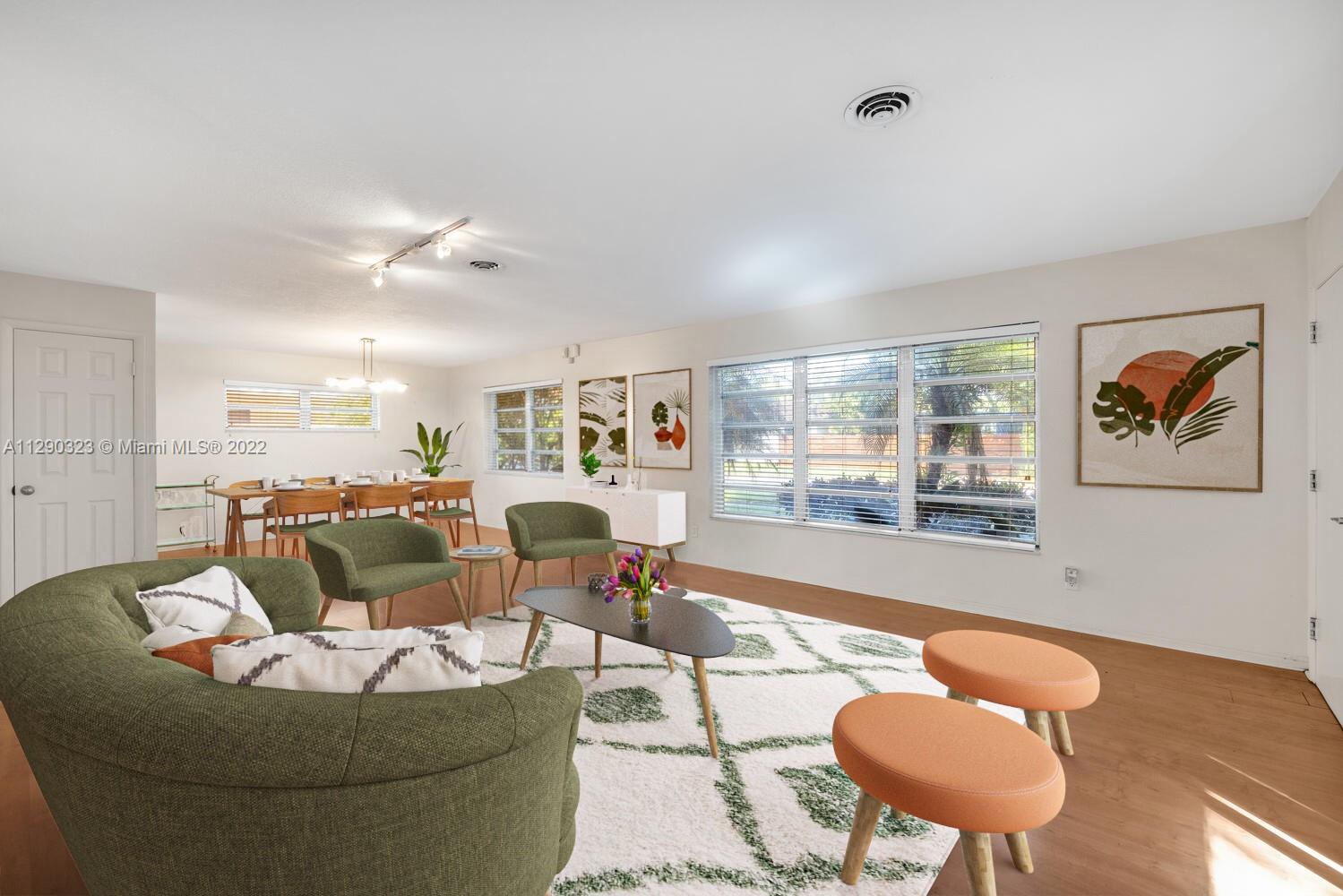 GREAT OPPORTUNITY! Transform this understated gem ---into a LARGE MODERN JEWEL - 2300 sq.ft. Currently an oversized 2 bedroom - Easy POTENTIAL for 3 bedrooms! Lots of NATURAL LIGHT with windows all around! Approx. 40 feet of the entire east WALL OF GLASS WINDOWS with views to private fenced courtyards. Original unexposed terrazzo floors (under laminate). Updated electric. Back yard is lushly green-space and (small) low maintenance - perfect for BBQ’s and quaint dinner parties! Endless possibilities with wide open spaces! Can present suggestions to better use sq.ft. & plans w/simple expansion (not moving kit nor baths)could be a beautiful wide open kitchen w/huge island and two entertaining areas. Average sales prices /sq.ft. over last 12 mo. Renovated @$475....do the math and buy this one.