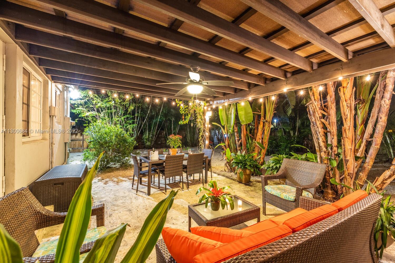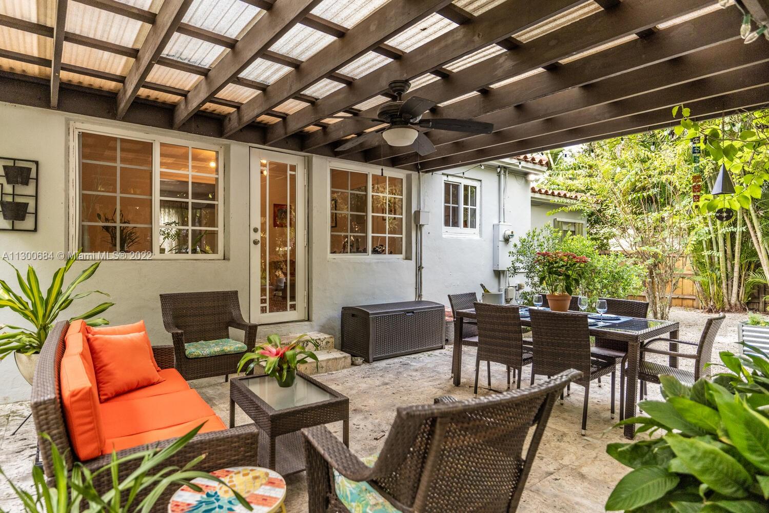 Welcome to Casa De Las Flores! Enjoy great indoor-outdoor living in this updated Miami Shores natural-light filled 3 bedroom plus 2 updated bath home with lush, floral entertainment gardens. Bright, extended flex-living with lovely wood floors lead to a delicious updated kitchen and window-lined dining, both with striking Instagram-ready Iberian tiles opening to a magical private backyard oasis with pollinator plants and flowers that attract butterflies and singing birds—you’ll feel like you’re in your own Tulum-style oasis! With a fabulous pergola and so much lush tropical space, these gardens are perfect for relaxing or entertaining. You’ll rest easy with all impact windows and doors, and you’ll appreciate the tucked away location on a quiet cul-de-sac. Come bloom at Casa De Las Flores!