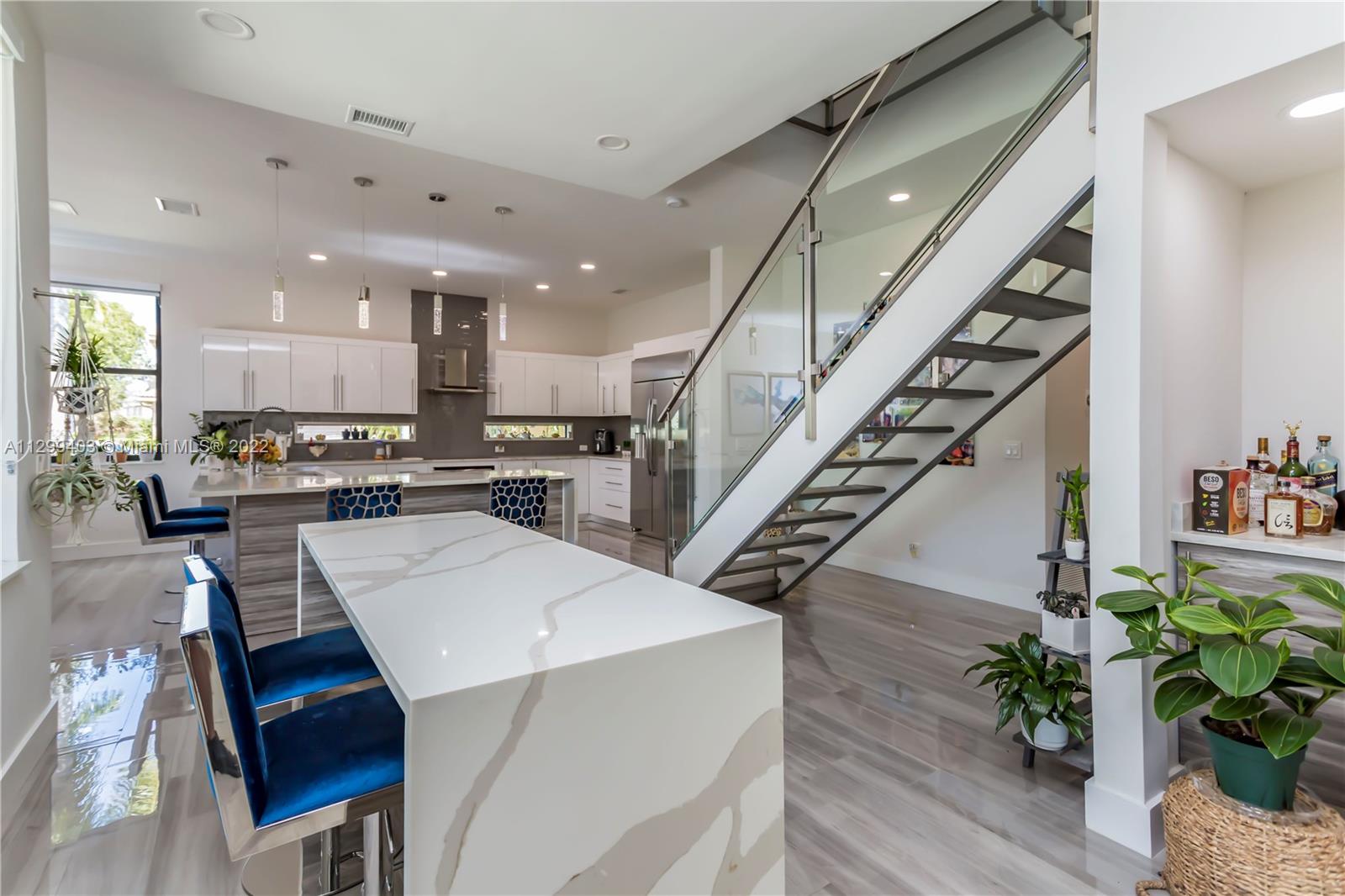 Absolutely gorgeous! Completely remodeled in a modern style. All new Roof, new impact windows & doors. New modern kitchen w soft close doors & drawers, new SS appliances & exhaust hood, New porcelain flooring on lower level. New modern glass railing on stairs. All remodeled bathrooms w gorgeous new vanities, lights, rolling shower doors, tile, floors & toilets. All new light fixtures throughout. Freshly painted interior and exterior. New modern garage doors. Pool recently resurfaced. Completely private backyard w lush landscaping. A covered area to entertain by the pool. No expense has been spared on this home. Ready to move in today!