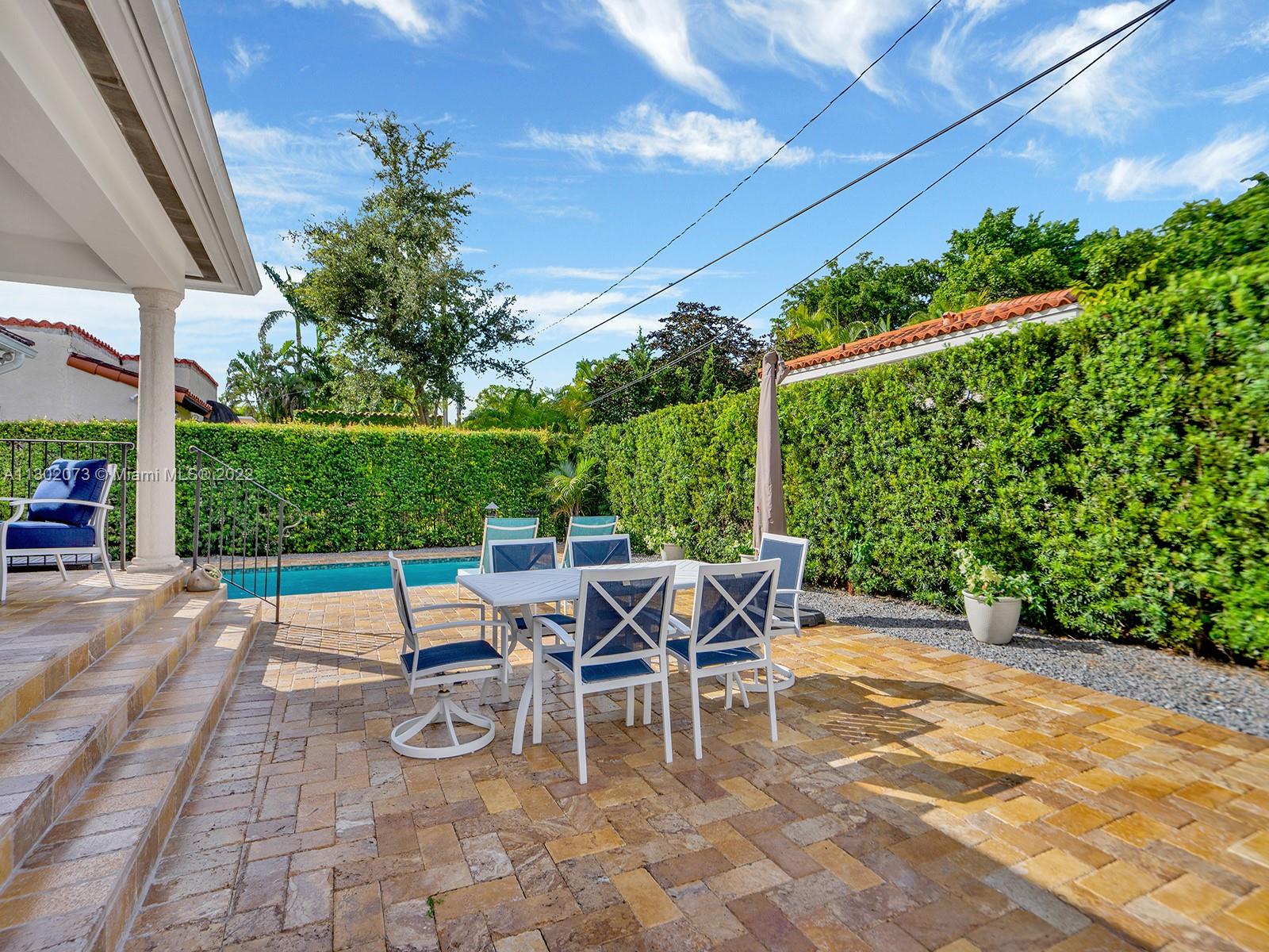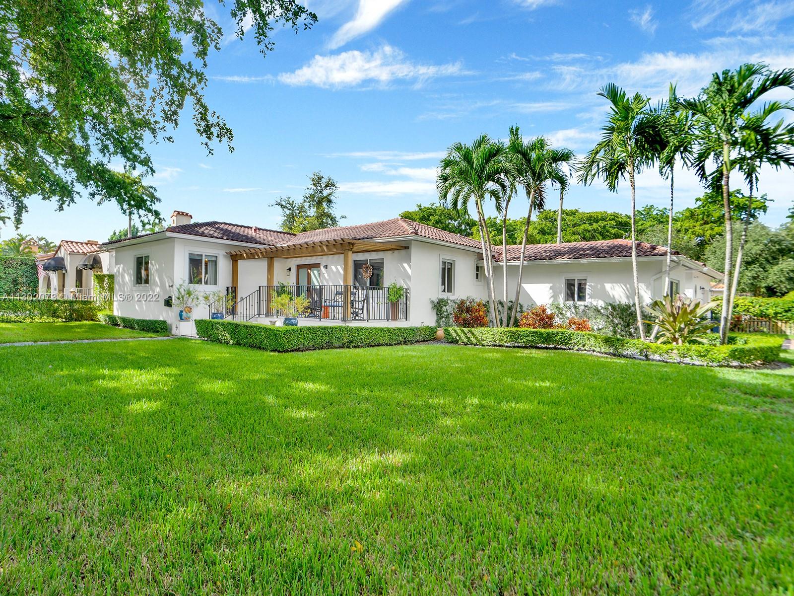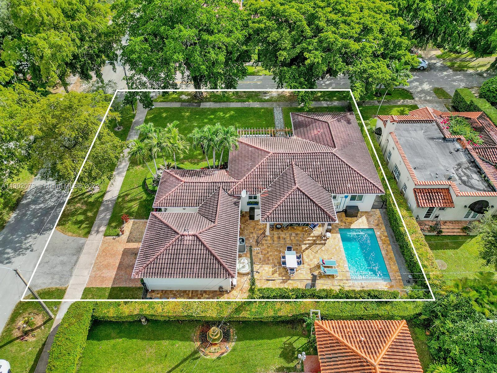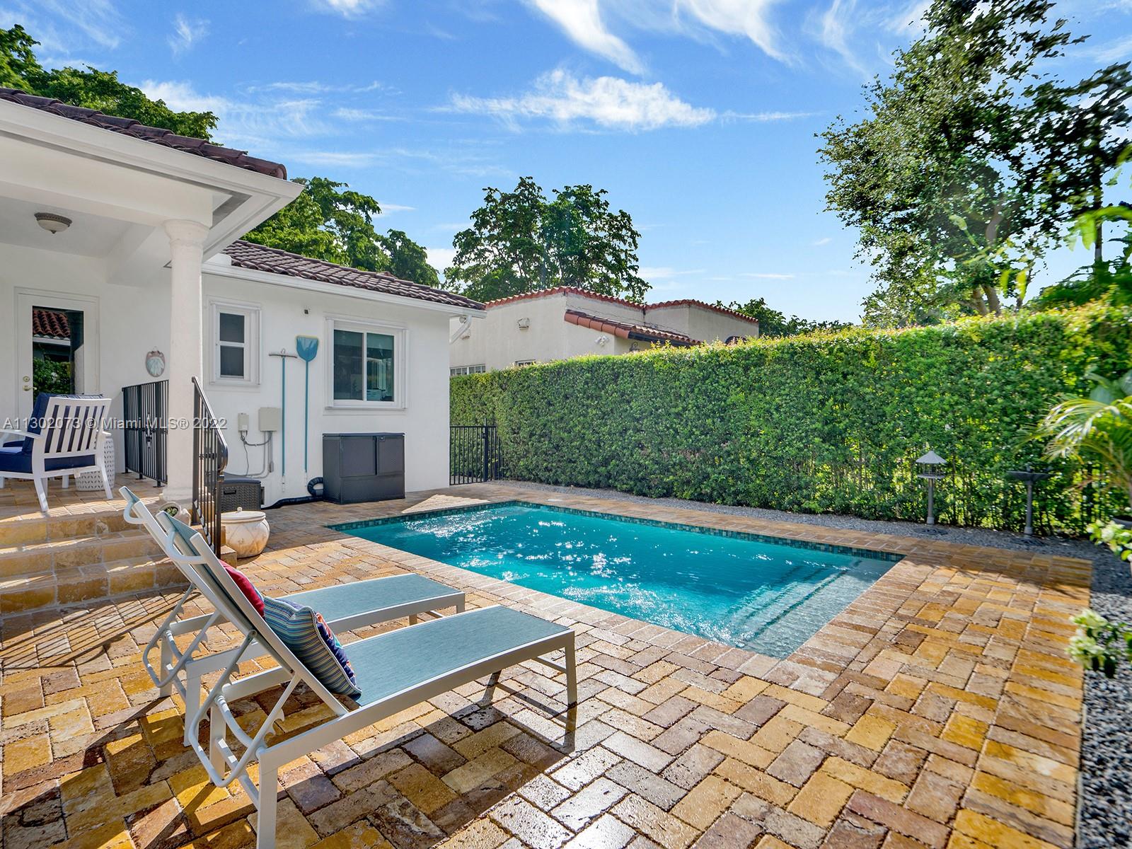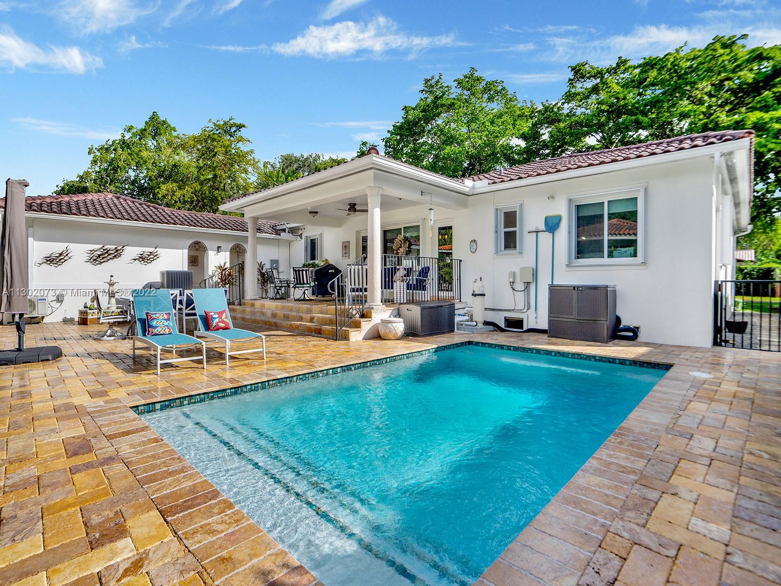 This unique Coral Gables pool home has been spaciously enlarged to a current 3 bedroom/3 bathroom split floor plan. This corner lot home sits on a 10,600 SF lot, w/ a master bedroom addition constructed in 2015. One of just 16 homes on Tangier Street, between Venetia and Milan, property is just north of the Granada Golf Course. Entry leads you to the living-dining area that overlooks the backyard patio/pool area. Pool was built in 2022 w/ a natural stone floor layout & features a salt-chlorinator & LED lighting. Master bedroom has a sitting area & custom closet. 2nd bedroom has a full bathroom. Galley kitchen leads to a spacious family room that has access to the backyard & covered path to laundry room/garage. Impact/window protection w/doors throughout. MOVE IN CONDITION.