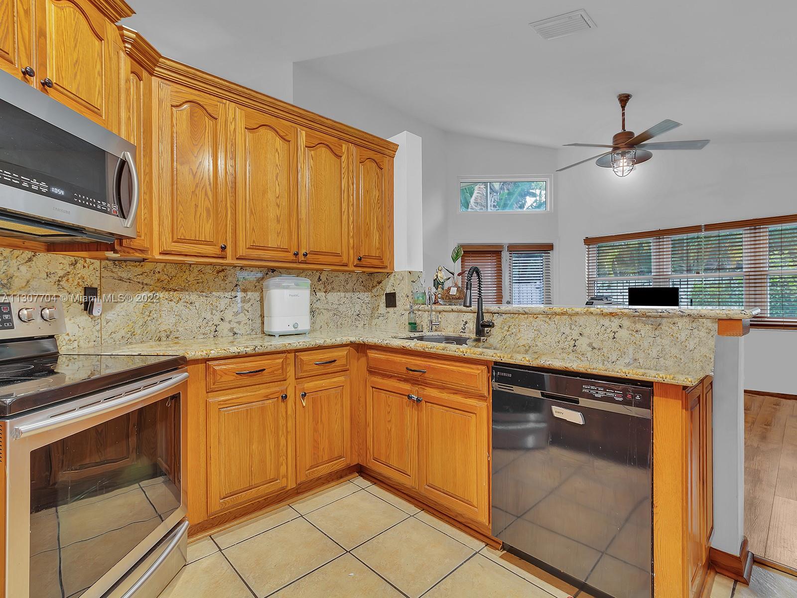 Stunning 4/3 home located in the desirable Lakes @ Weston. The home has high ceilings, wood laminate floors, impact windows and doors. You'll love the large living room, formal dining room, family room, and gourmet kitchen with custom cabinets, Stainless steel appliances, and granite countertops. The owner's suite offers a large walk-in closet and a modern bath with a floating double sink vanity and frameless shower and soaking tub. All three bathrooms have been updated. Roof 2015. A/C 2015. No Popcorn Ceiling! The community features amazing amenities like a soccer field, playground, and community pool. You can also walk to shopping, restaurants, and houses of worship. There is 24-hour guard gate access. Weston schools are rated A+.