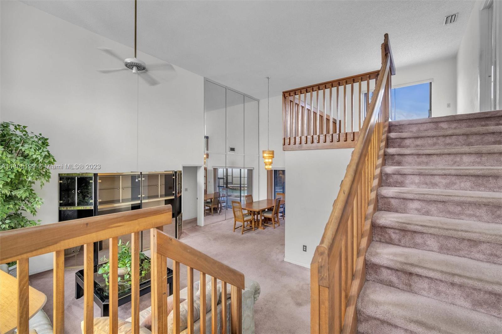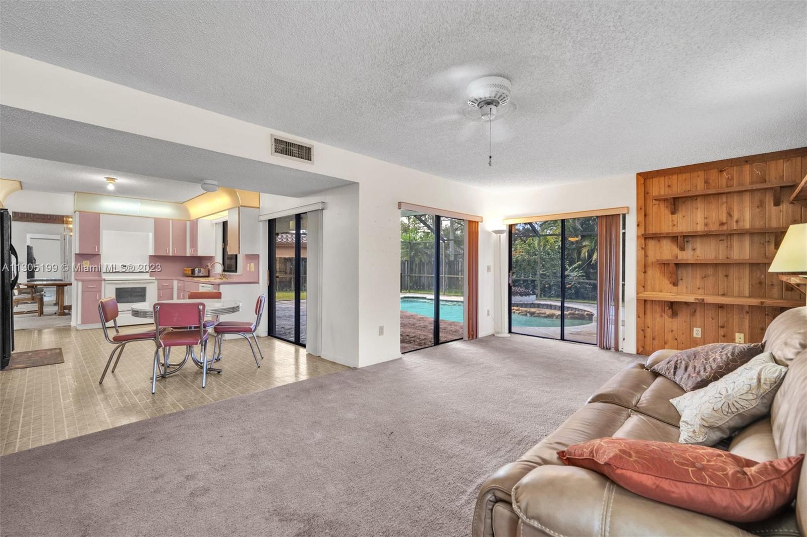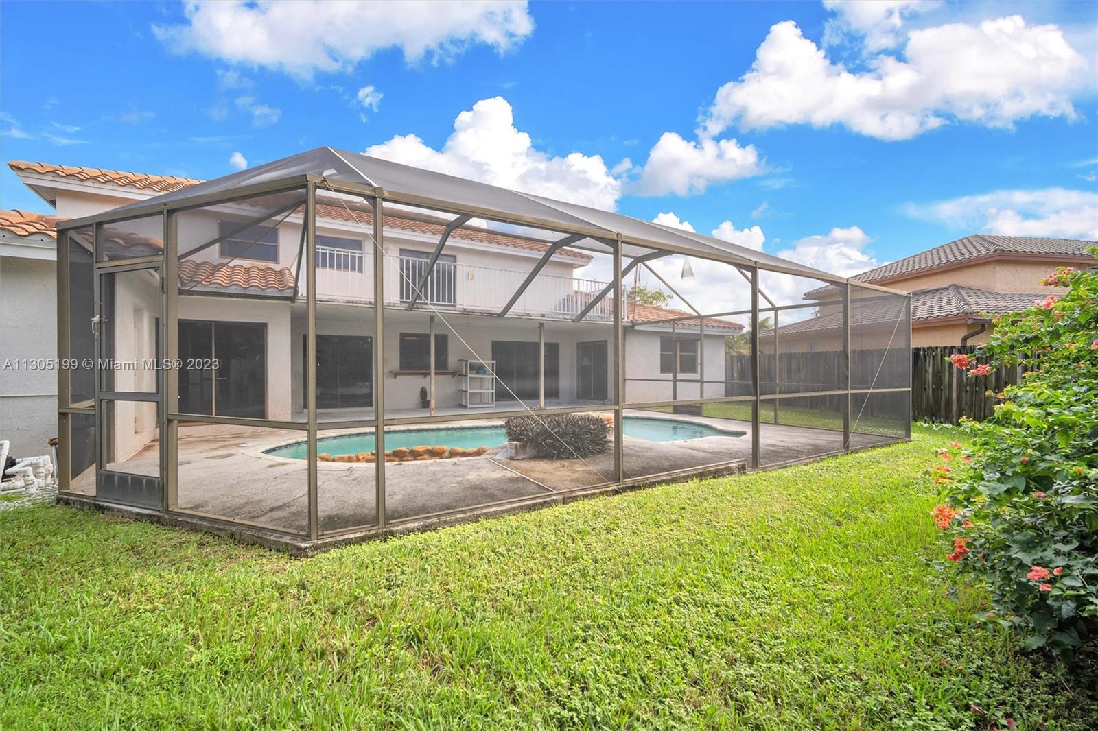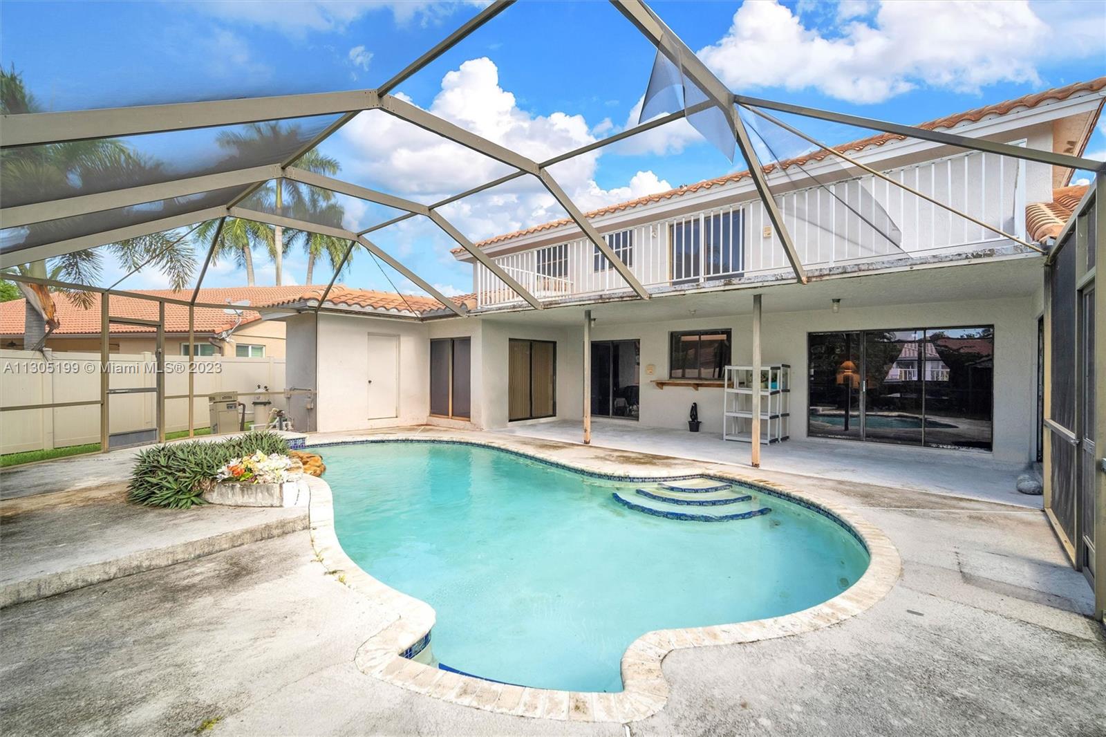 Needs repairs and updating but is currently priced $45k under appraised value! Original owner is bringing this great opportunity to the right Buyer at the right price to make this unique 3 bed + Loft/4.5 bath their very own-- remodel as you see fit. Lots of natural light, separate living areas, FIRST floor Primary suite with walk-in closet and bath with separate tub & shower with ANOTHER full bed with its own full bath upstairs. Spacious, eat-in kitchen, sliders surround and access the Pool inside a screened in partially covered patio, open terrace off the loft, cabana bath, indoor washer-dryer utility room with sink; Roof 2007, circular driveway on an oversized fenced-in pie shape yard. Conveniently located near highway, shopping, restaurants, golf, and schools. Low $350 yearly HOA.