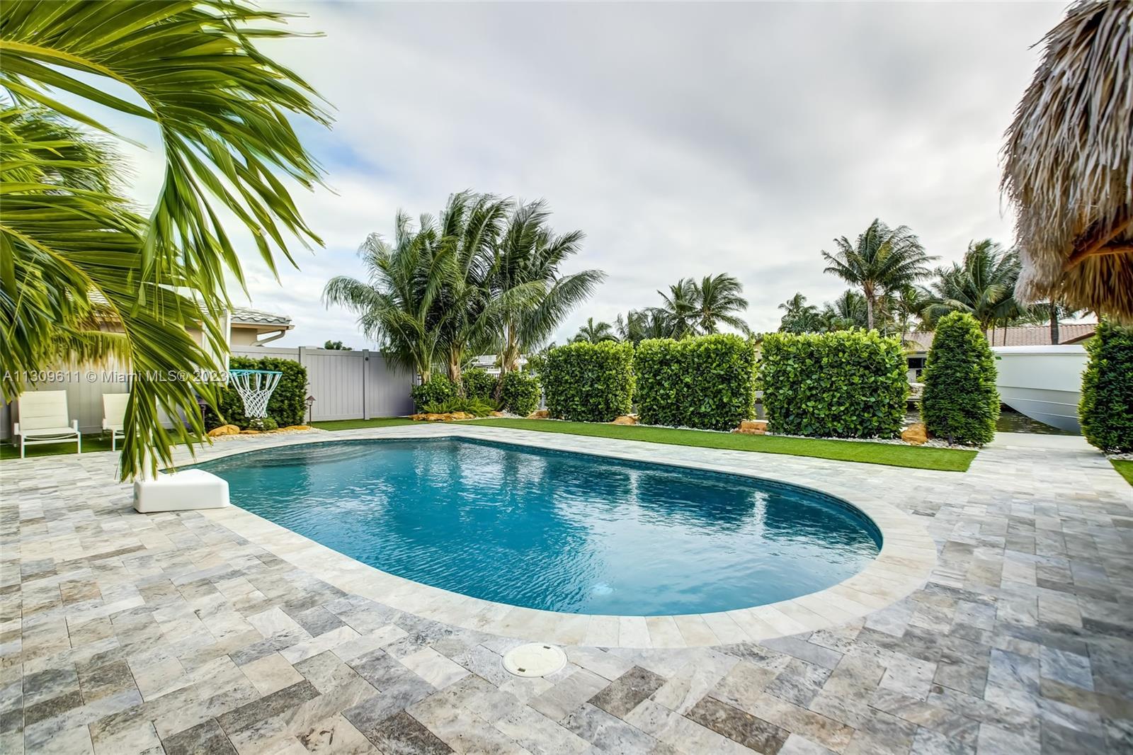 This absolutely stunning renovated waterfront home reflects the best of Florida living. Impeccably maintained with custom detail, finishes and natural light throughout. Kitchen features quartz countertops and stainless appliances. Bedrooms with ensuite feature additional built-ins. Paradise awaits in the beautifully landscaped backyard. The 80° pool features new lagoon plaster and tile accents. A large tiki hut, electric wired, is perfect for entertaining and alfresco dining. Relax in the private outdoor jacuzzi. An 80' dock with water, electric, new boat lift, fish cleaning station, and dual dock stairs are ideal for boating and fishing enthusiasts. A 2022 335 Everglades at the dock is also available. The garage has additional large storage closets and epoxy floors. Furnishing negotiable