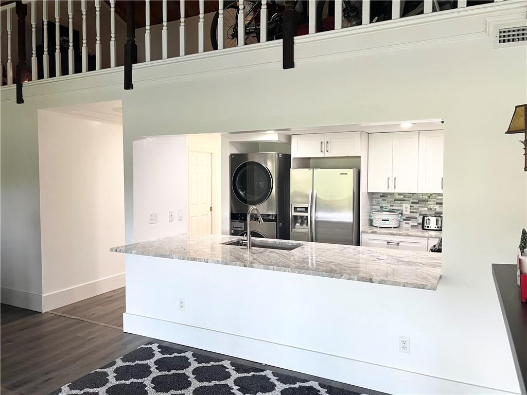 Don't miss out on this one! Overlook your waterfront home from the screened patio. Updated 2022- Gray woodlook vinyl Flooring, Kitchen cabinets white and granite counters, Microwave, sink and faucet, washer and dryer and hot water heater, Master bedroom and 2 nd bedroom on the first floor, Plus a Large loft. Low maintenance fees, no rental restirctions, no pet restrictions, Great for investors.