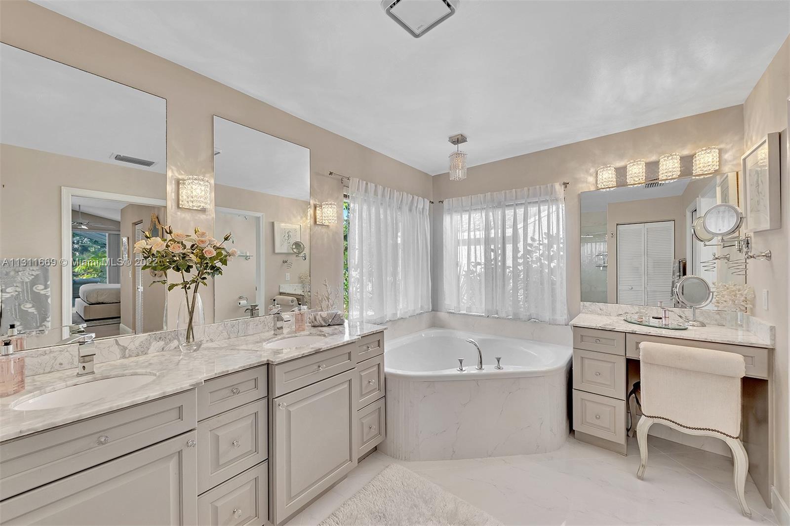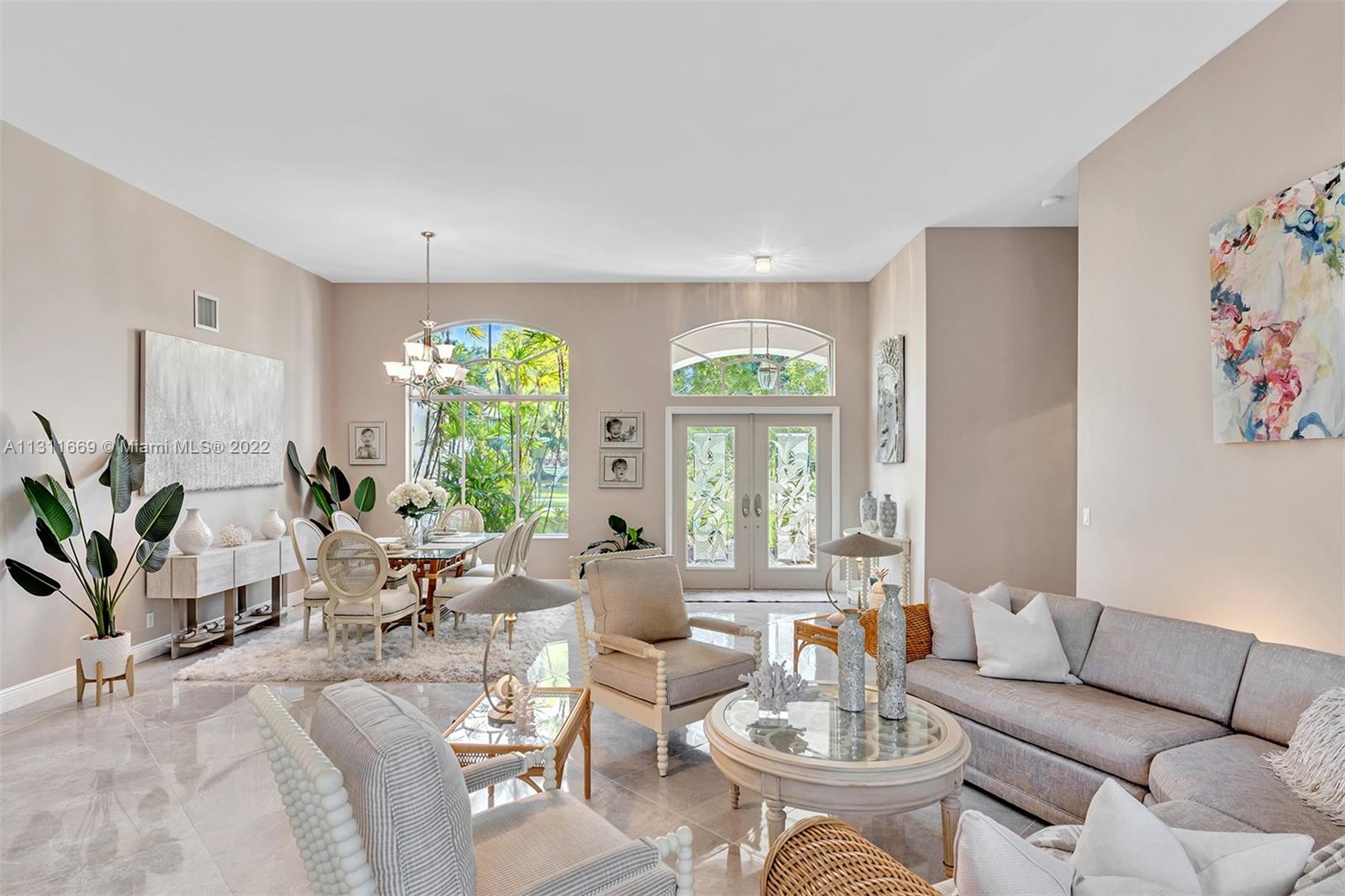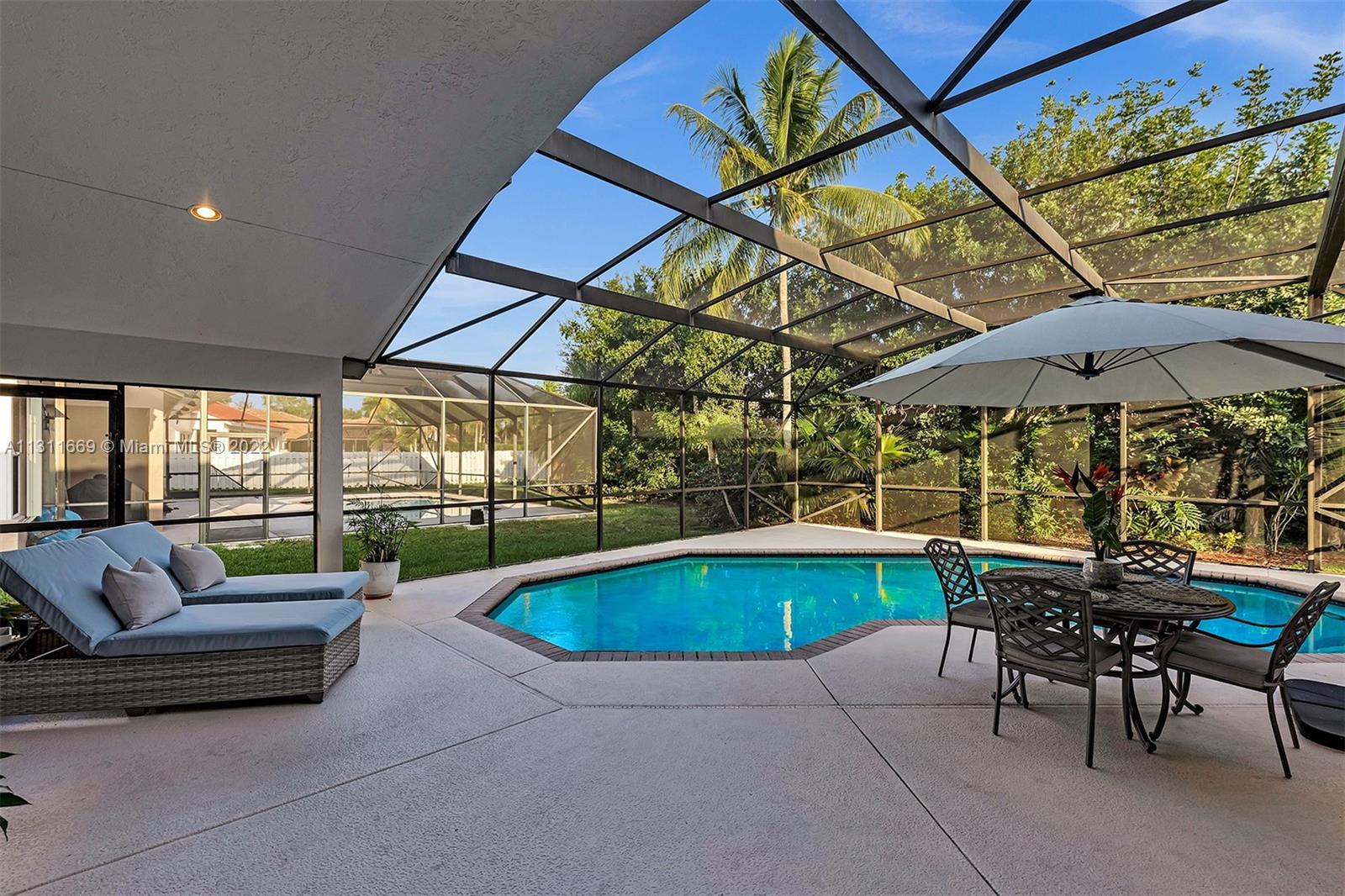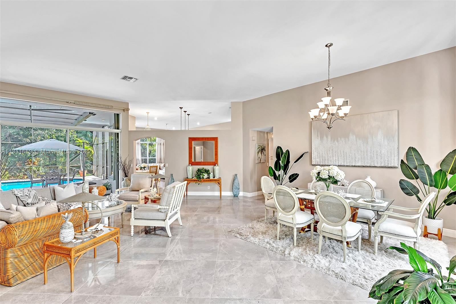 MOVE IN READY! This absolutely STUNNING 4 bed/3 bath one story home is set on perfectly manicured, lushly landscaped corner lot, COMPLETELY RENOVATED with transitional taste and a coastal flair. Enter the foyer and immediately feel the spacious living areas, volume ceilings and large sliders with transom windows. The chef's kitchen with quartzite counter tops, glass tile backsplash and wall oven/microwave overlooks the spacious family room. The master suite boasts a spa-like bathroom and 2 walk-in closets with built-ins. Other features include gorgeous 36x36 inch tile, trendy light fixtures and 3 way split bedroom plan. The screened pool with large patio is surrounded by generous yard. NEW ROOF and accordion shutters. 24 hr guard gated. Steps to community pool, playground and soccer field.