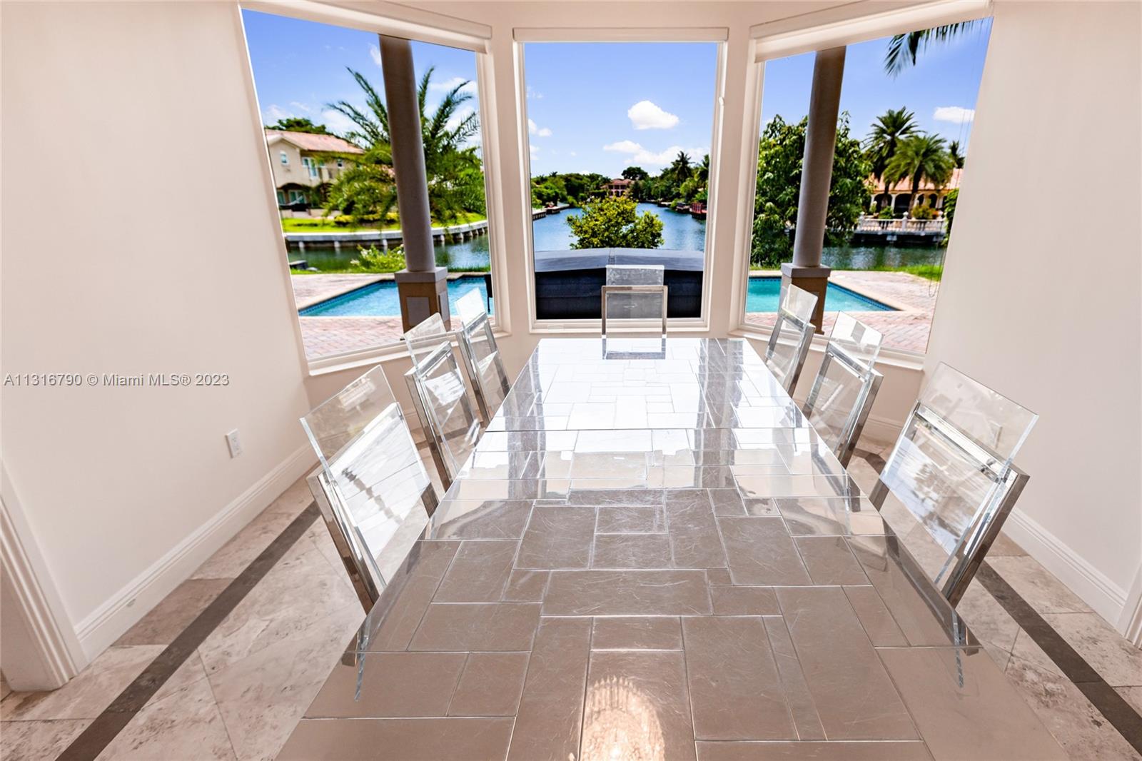 Stunning, split level waterfront mansion located in guard-gated Gables By The Sea, boasts the most picturesque setting for Florida's sunsets. Situated on a unique, T-style, wide section of the waterway with endless water views, the property has 5 bedrooms with master on the first floor. All rooms on the first floor including the bedroom, kitchen, breakfast area, formal dining with large windows, living room with fireplace,& oversized family room ALL HAVE WATER VIEWS AND 15' HIGH CEILINGS. The covered patio with retractable awnings overlooks the swimming pool and the water. There is a separate laundry room with ample cupboards, and the house has 2 x 2 car garages. Gables by the Sea is a treelined, tranquil & serene community located beside Gulliver Prep, a private day school.