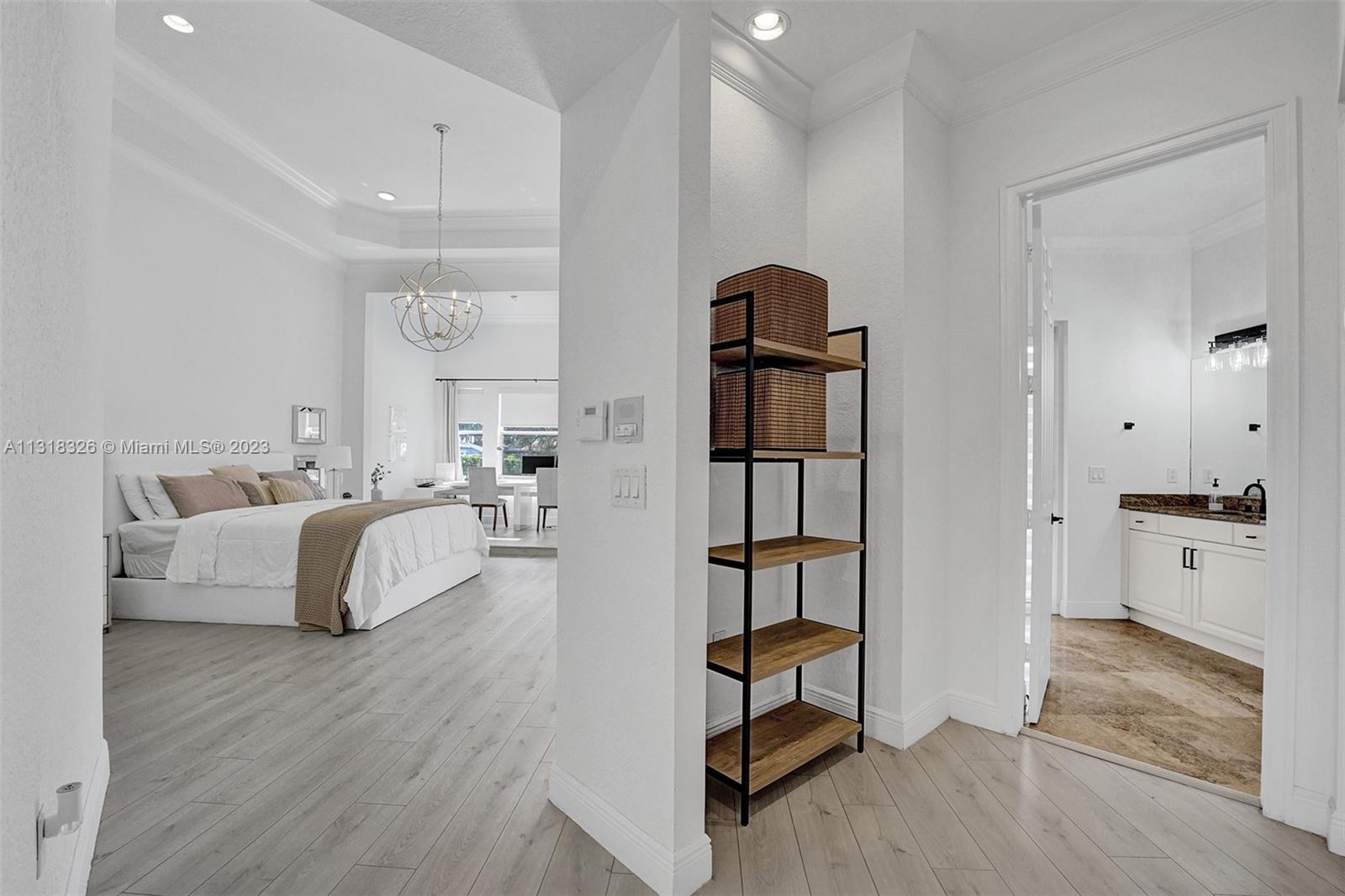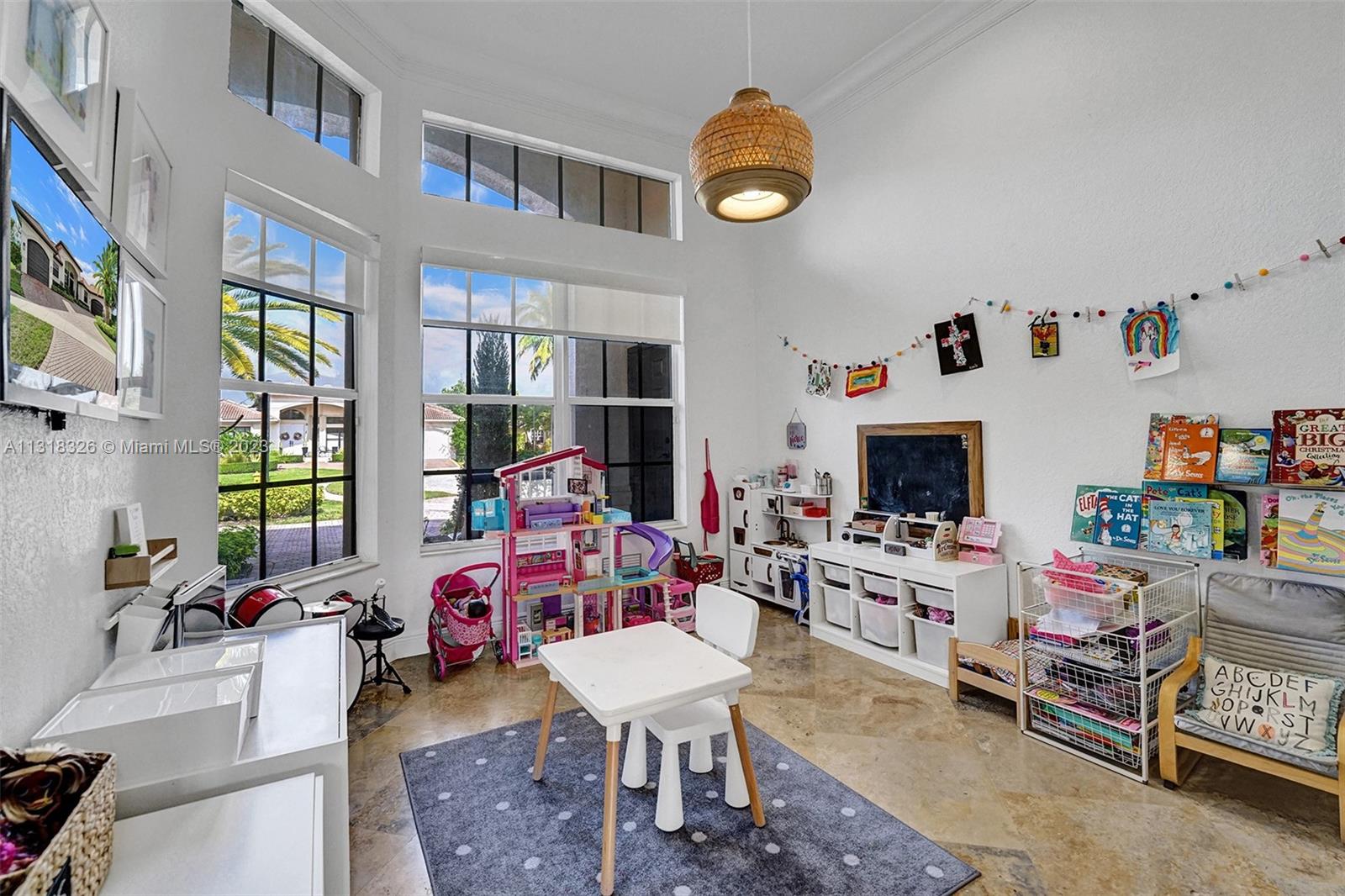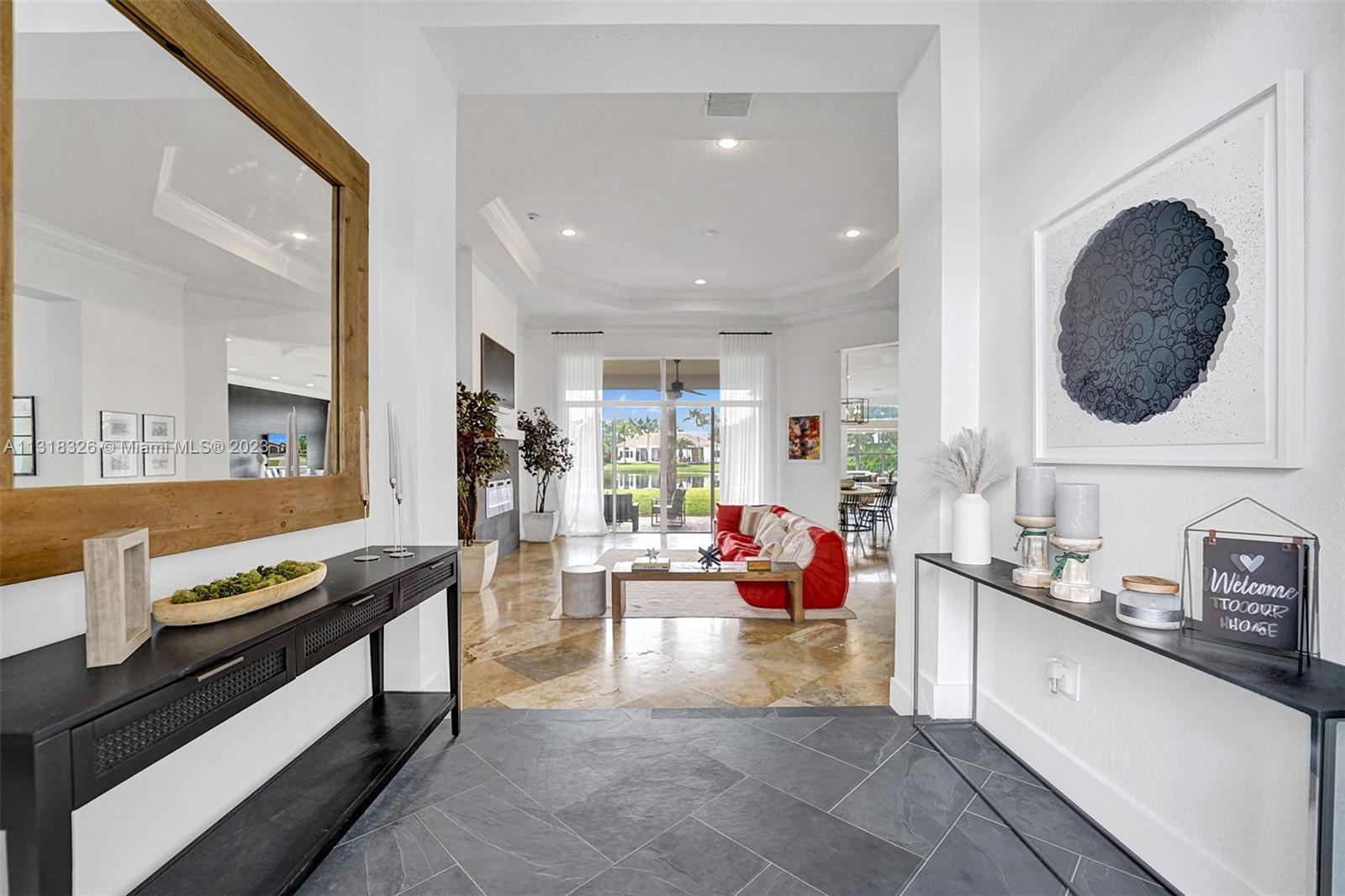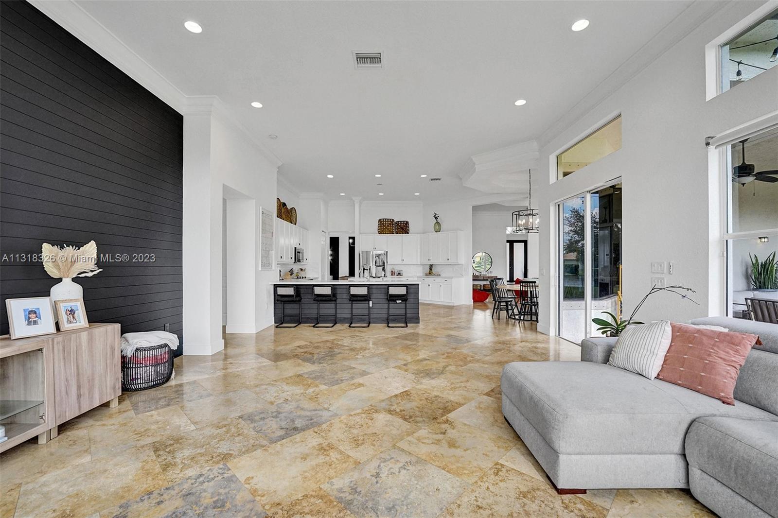 Your dream home is here. The most spectacular family-friendly single family home community in South Florida, Riverstone. This spacious corner waterfront property is located in a cul d sac and features a split bedroom floor plan with 6 bedrooms, 5.5 bathrooms, plus a bonus room/office and a 2 car garage. Open living spaces and large floor plan with 12' ceilings. The gourmet kitchen with wood cabinetry, quartz countertop and stainless steel appliances. Bathrooms have been completely upgraded modern style with quatz tops. Glass sliding doors that lead out to the rear patio terrace, where you will enjoy a perfect setting for relaxing and entertaining. This home has one of the largest lot in the community. A great place to raise a family