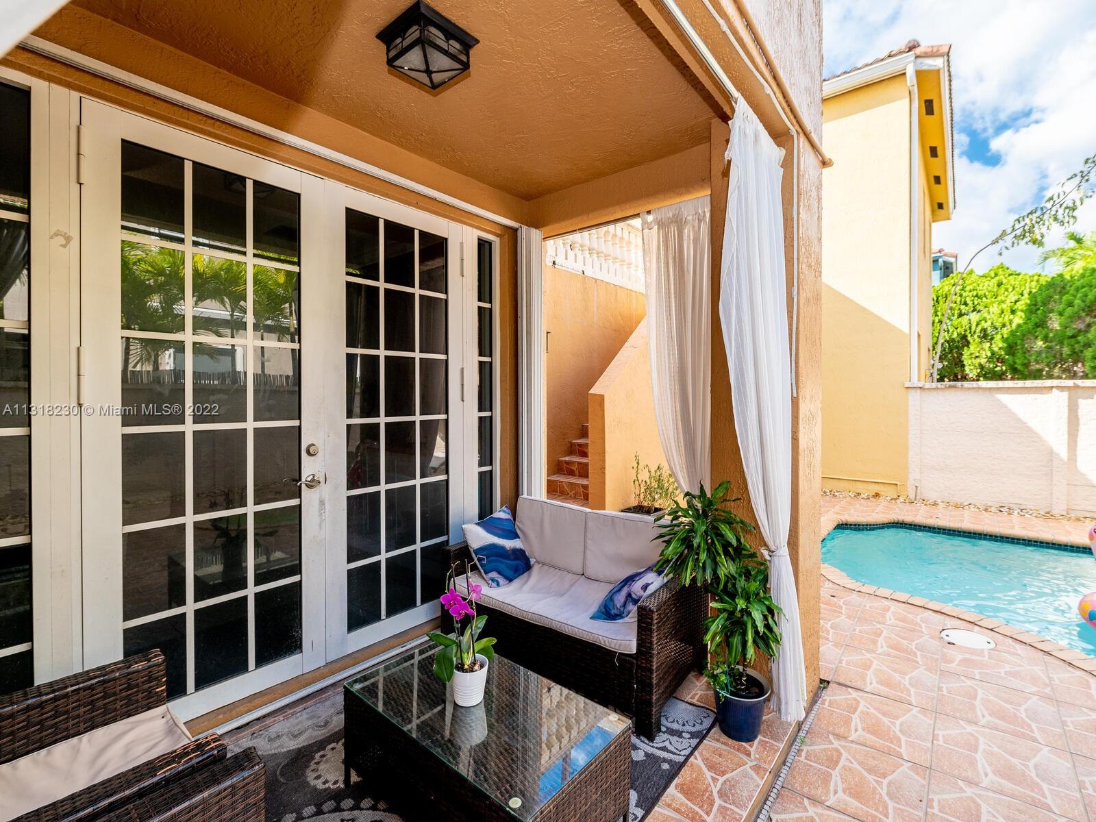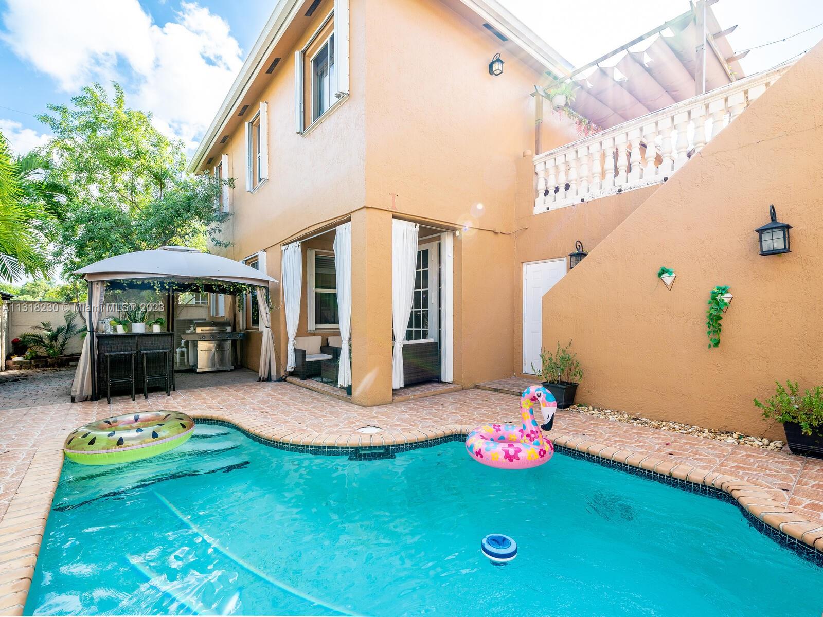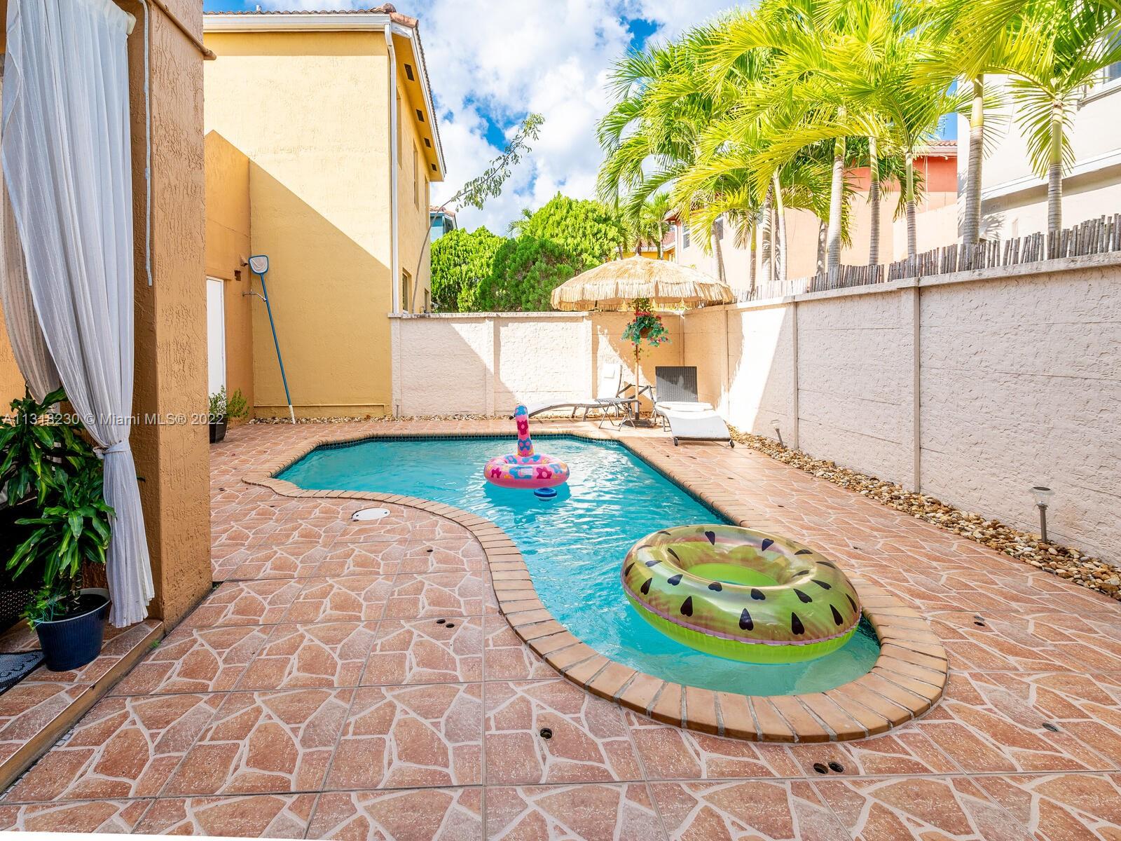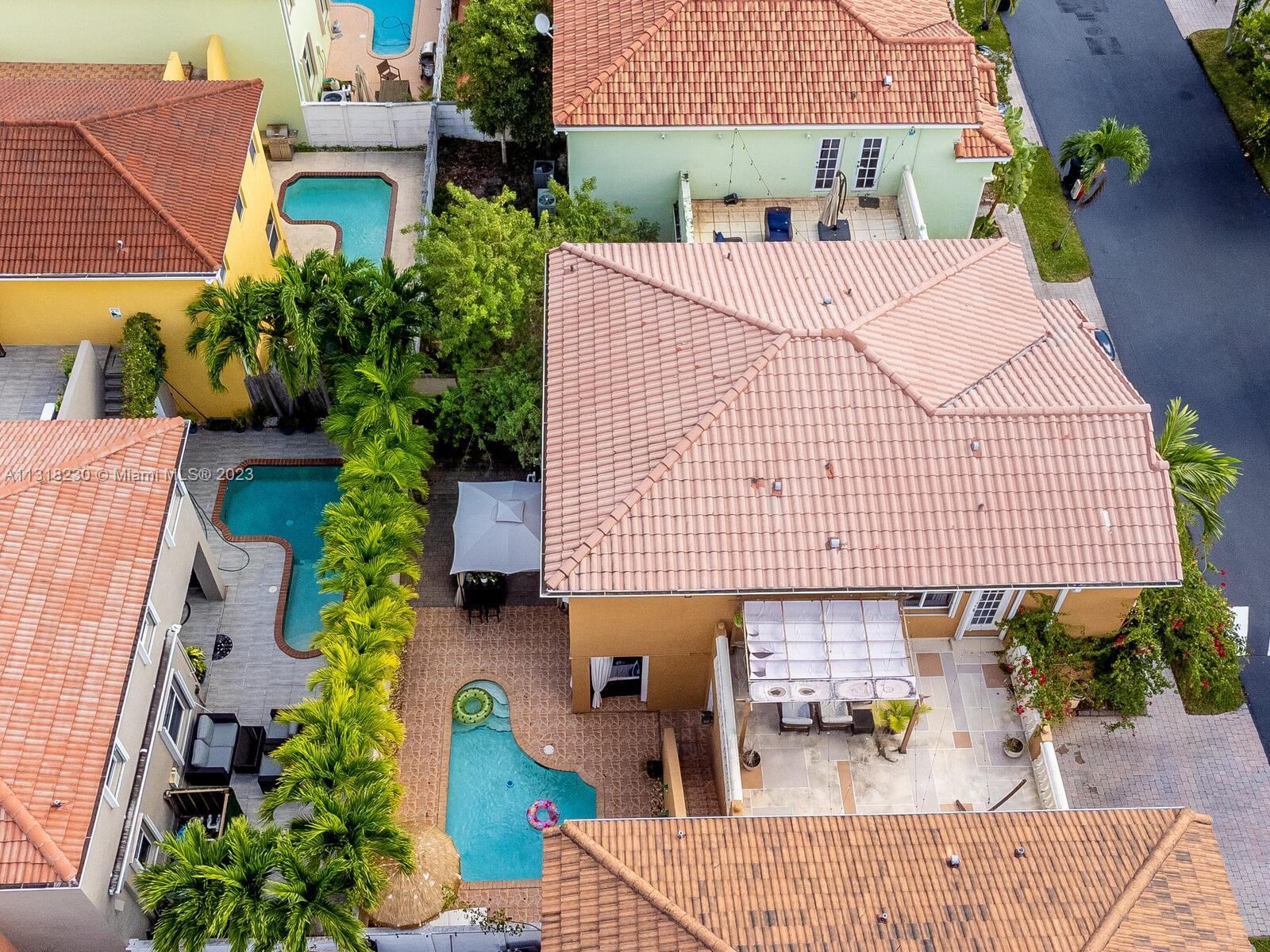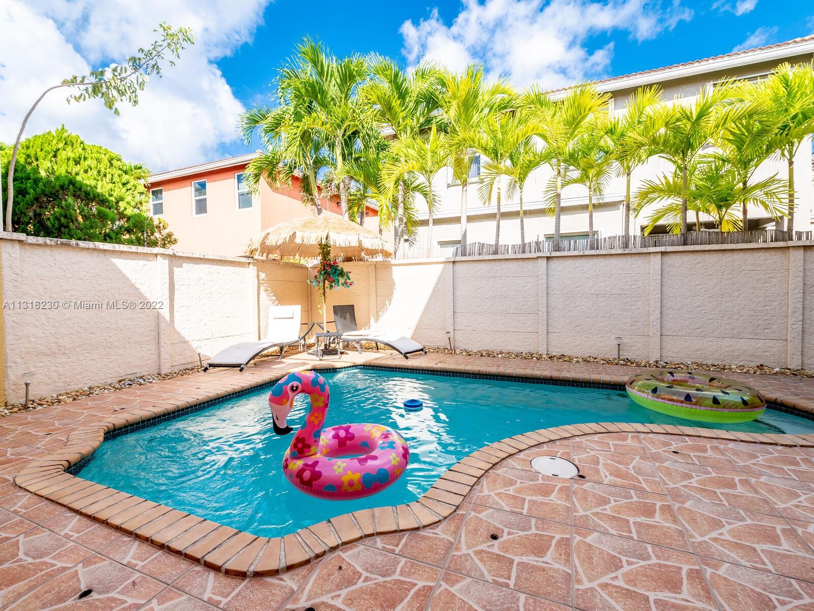 REDUCED...Great Location, Spectacular Mediterranean style. 4BR 3.5 Bath home, formal living and dining room, huge family room, LOFT, roof top terrace/sun deck overlooking the spacious patio and your own in ground POOL. Eat-in kitchen with wood cabinets, granite countertops, and SS appliances, full bedroom and bath downstairs, tile downstairs and wood laminate 2nd floor. Hurricane rated accordion shutters. Large two car garage, Outside shower/cabana bath, low HOA includes gated security, alarm, cable, walking distance to schools, shopping, entertainment, basic cable TV and ADT monitoring included. BACK ON THE MARKET. ROOF NEEDS REPAIR. CASH ONLY. Offer with proof of funds