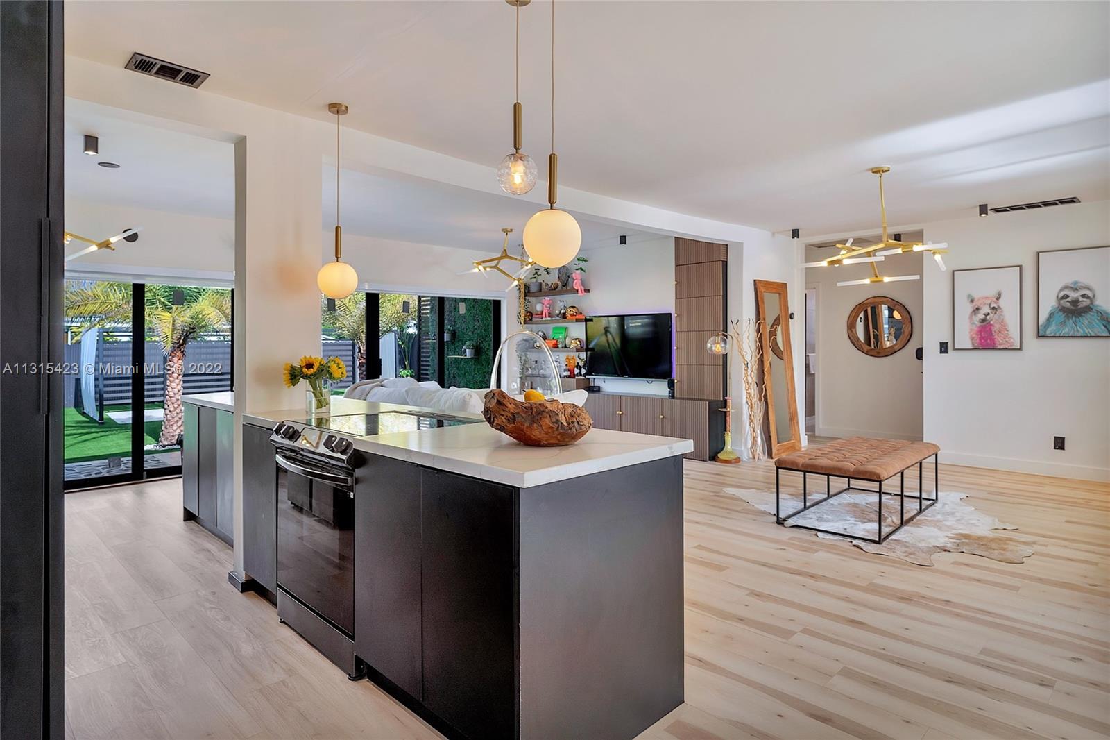 Rarely available a breathtaking renovated beauty. Clever design that truly maximizes this bright sophisticated cheerful space. No expense spared. Open floor plan. Gentle tones with striking accents. Kitchen reflects class and elegance. Living area spacious overlooking a dreamy backyard. Lovely primary suite. 4 th bedroom is perfect for in-laws quarters inclusive with private entrance and kitchenette. Move in and enjoy your home right away. Exterior lighting that accents the beauty and beyond of this custom home. 2 golf courses/la gorge country club. 1.1 miles from the beach. .2 miles to house of worship. Shops restaurants Like to travel. Port of Miami,airport. All at your fingertips. Fully mitigated and will receive all discounts for insurance. (Furnished)