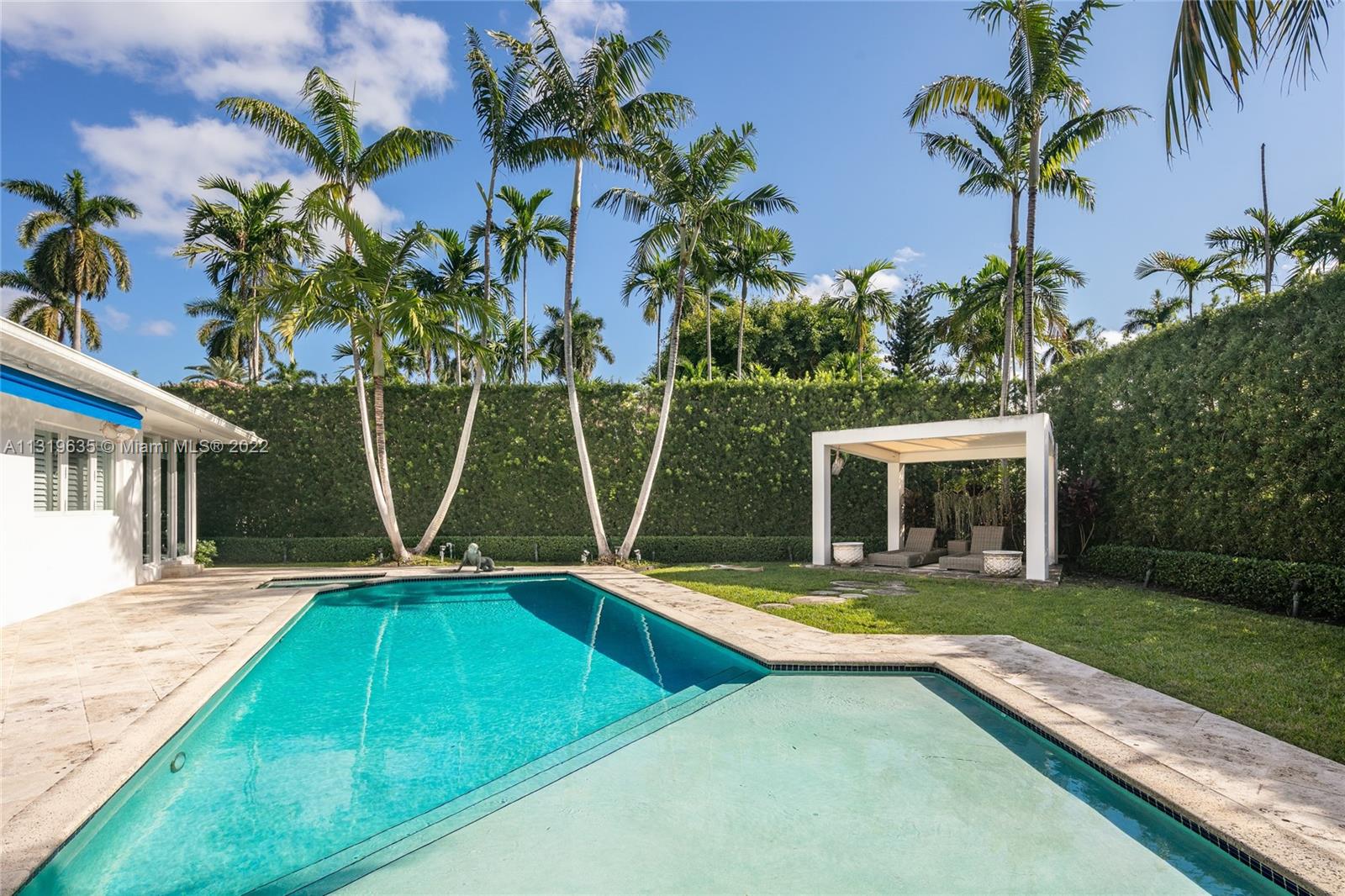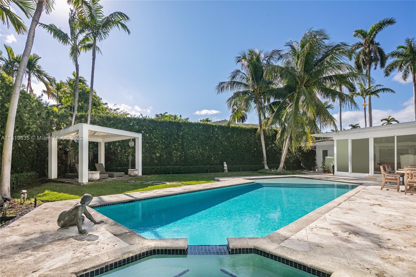 Enjoy living on private, guard-gated La Gorce Island in this contemporary one-story home situated on an 11,979 square foot corner lot. This residence boasts 4 bedrooms, 4 bathrooms, 1 half bath, an open floorplan, 3,121 total interior square feet of living, light-filled living spaces with natural light pouring through floor-to-ceiling windows wrapping the living and dining rooms and a gym. The outdoors are perfect entertaining or enjoying your oasis with a heated saltwater pool with a spa, bbq, outdoor shower and a cabana overlooking the pool. The home is complete with a 2 car garage and maid’s quarters. Located in close proximity to the beach, world-class restaurants & all that Miami Beach has to offer.