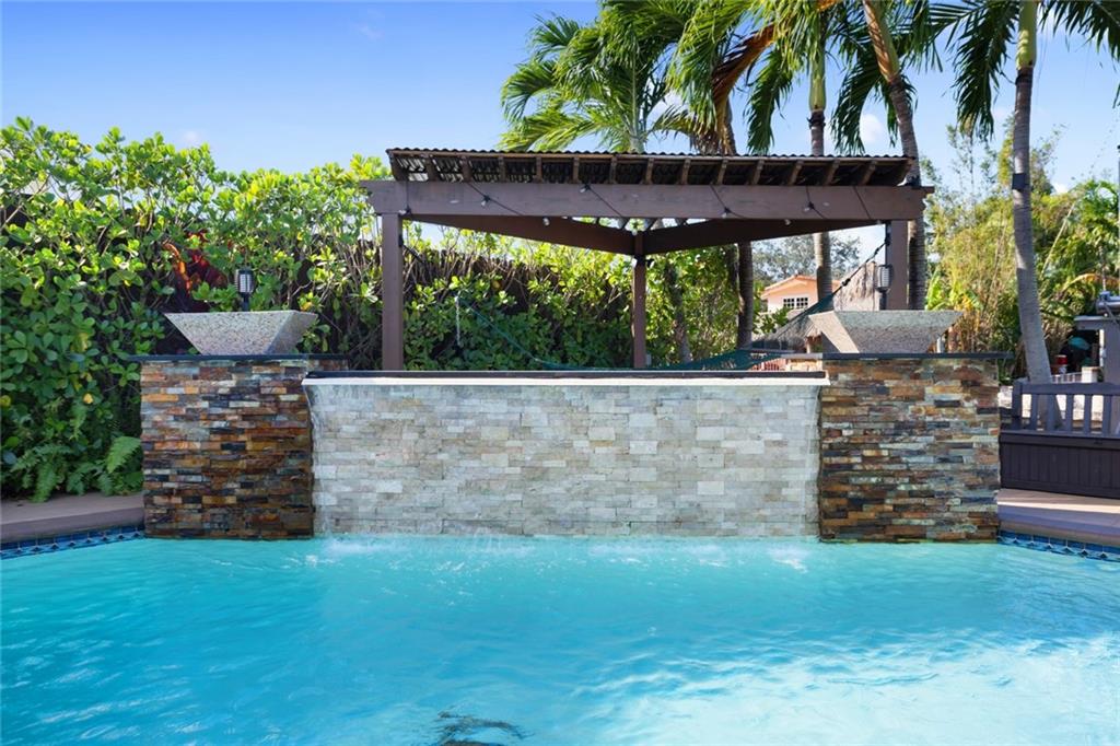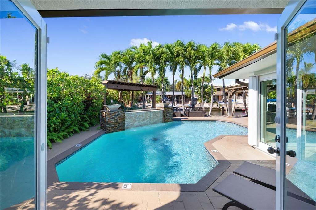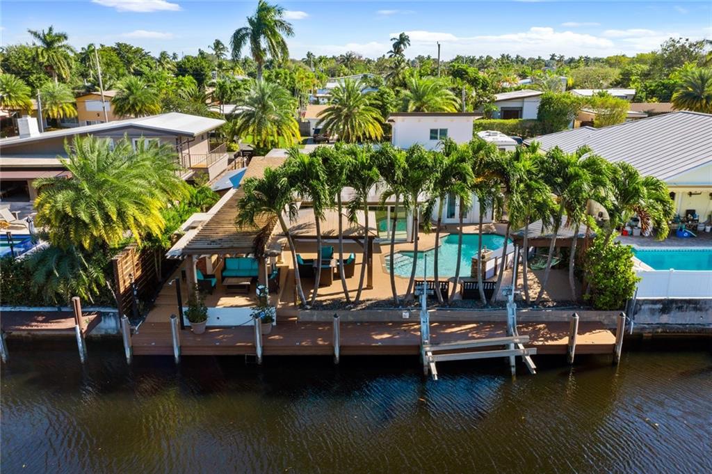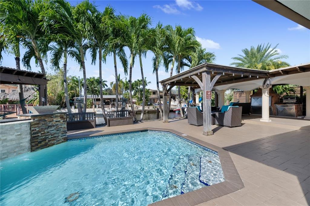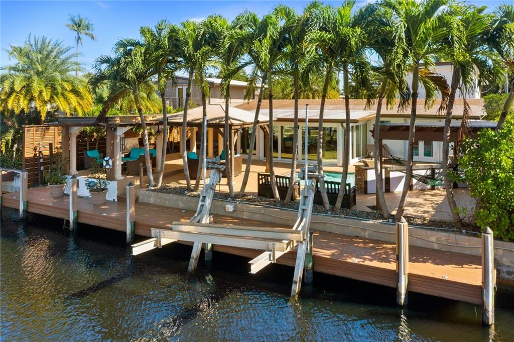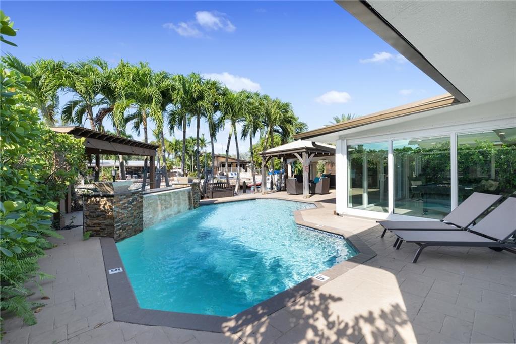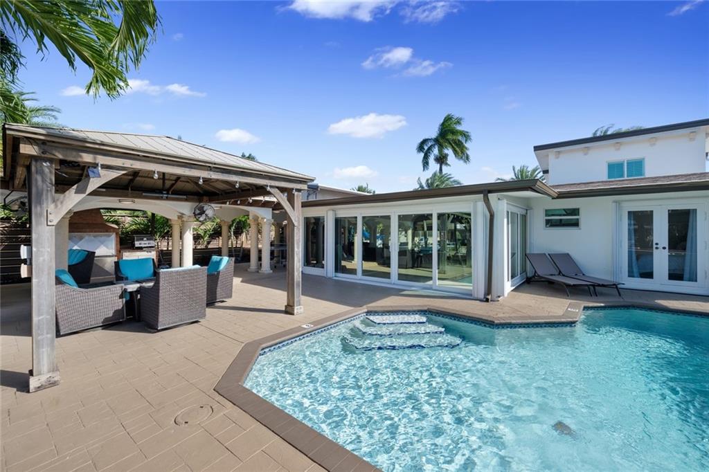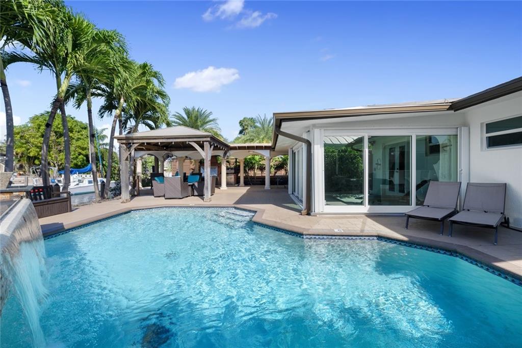 This is truly a great 65 ft waterfront home with deep-water! Offered fully furnished & turnkey with a fast closing option! Must be seen to appreciate the fun, mini resort vibe! The exterior offers a large covered front terrace, paved circular drive & incredibly private poolside with fountain, custom lighting, expansive covered entertaining terrace with built-in Summer kitchen, lounge & dining area plus additional gazebo to enjoy water views. You must see the interior to appreciate the large flowing entertaining areas, updated kitchen & baths. The bedrooms offer privacy with two levels & split floorplan. 4th bedroom makes a great potential office, baths are all updated. Amazing opportunity to enjoy this SoFlo waterfront fully furnished & hassle free retreat this Winter!