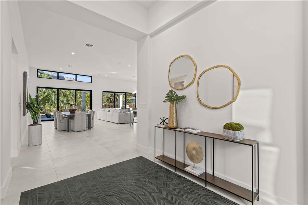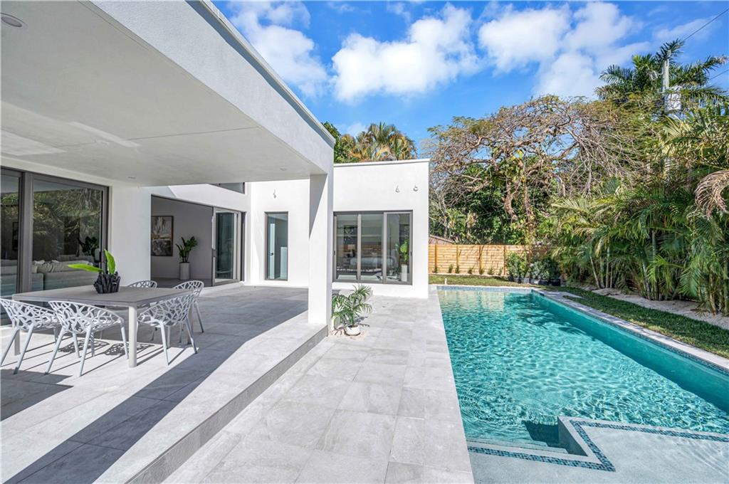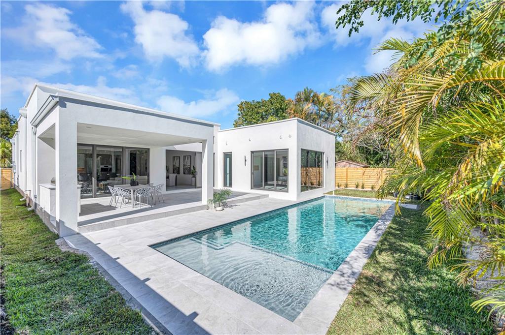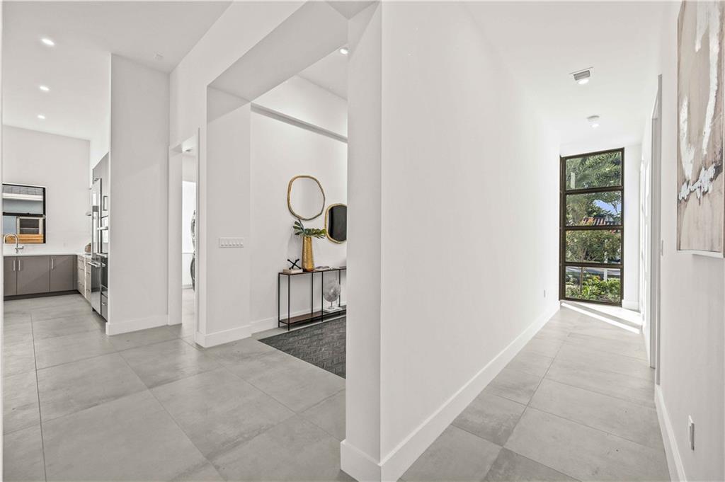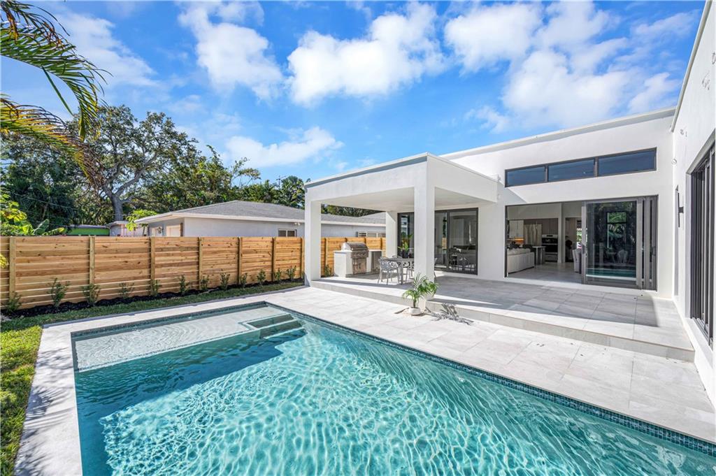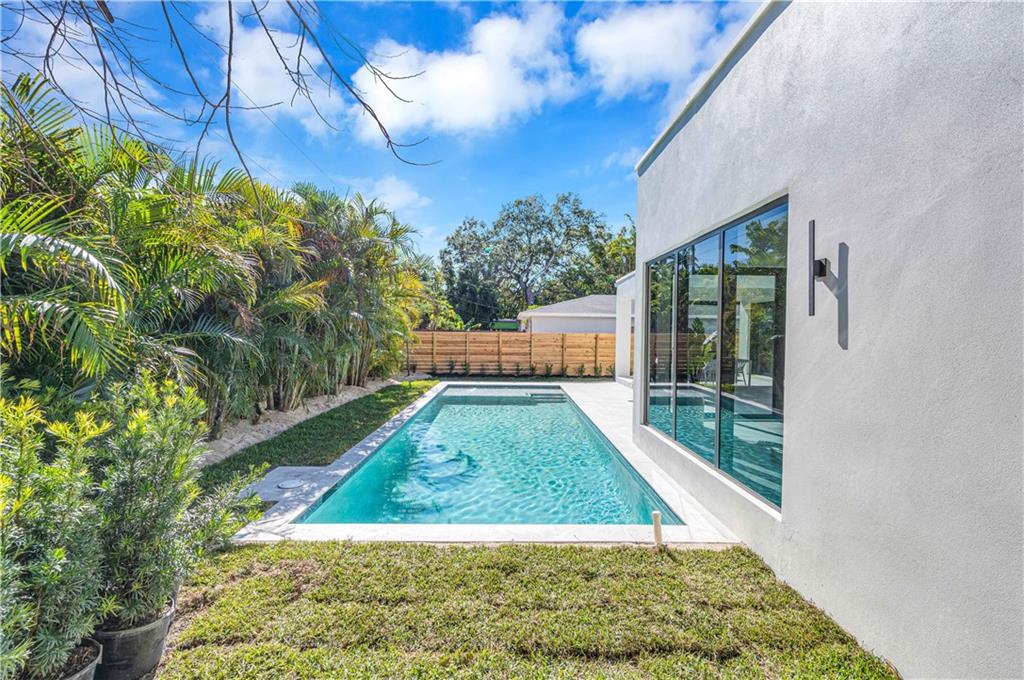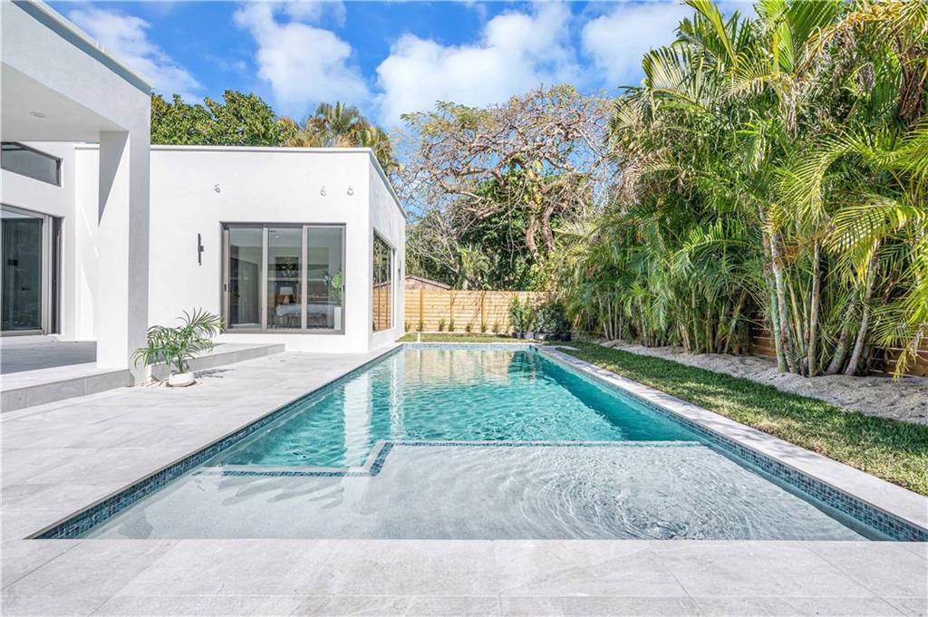 Stunning open spaces greet you as you enter this brand new home through a wide foyer. High ceilings and walls of glass create light-filled rooms. The (apx) 28x29 foot great room has two sets of sliders to the sunny pool area and roofed loggia and summer kitchen. The primary suite with two walls of glass seems to float over the pool. A butler pantry adjacent to the kitchen has a prep/serving counter and additional storage. Next to that is a generously sized shelved pantry closet. The laundry has full-size stack appliances and a wash sink plus additional storage. Floors are oversized porcelain squares. All rooms have recessed ceiling lighting. Property is SMART HOME ready. Rear yard is fenced and gated for privacy with rear alley access for flexibility.