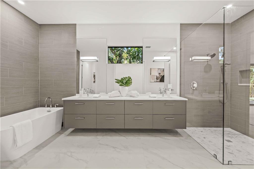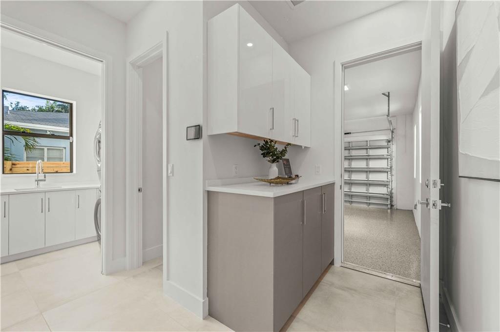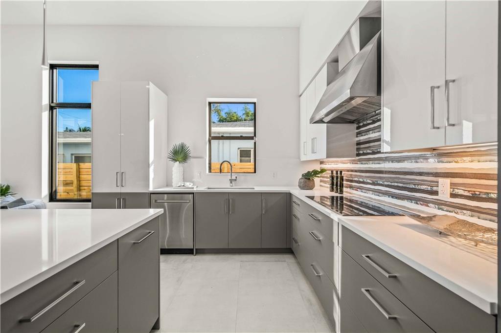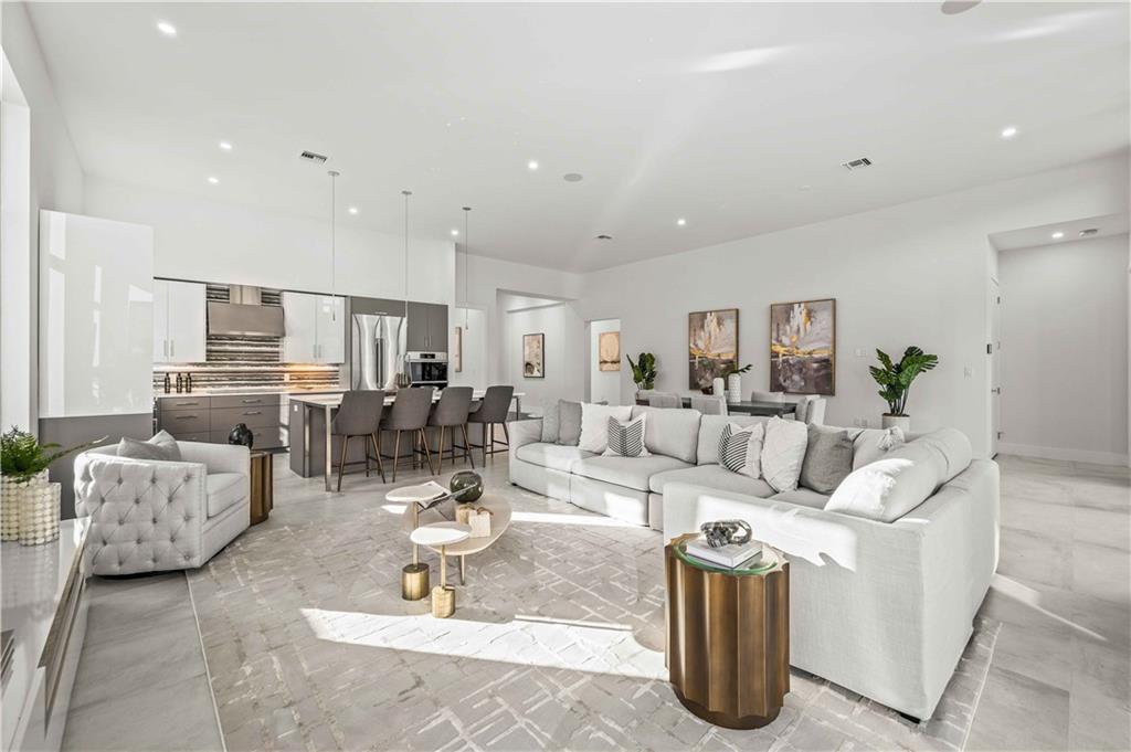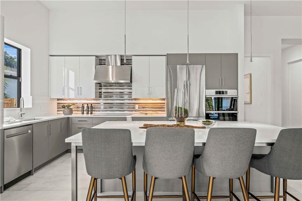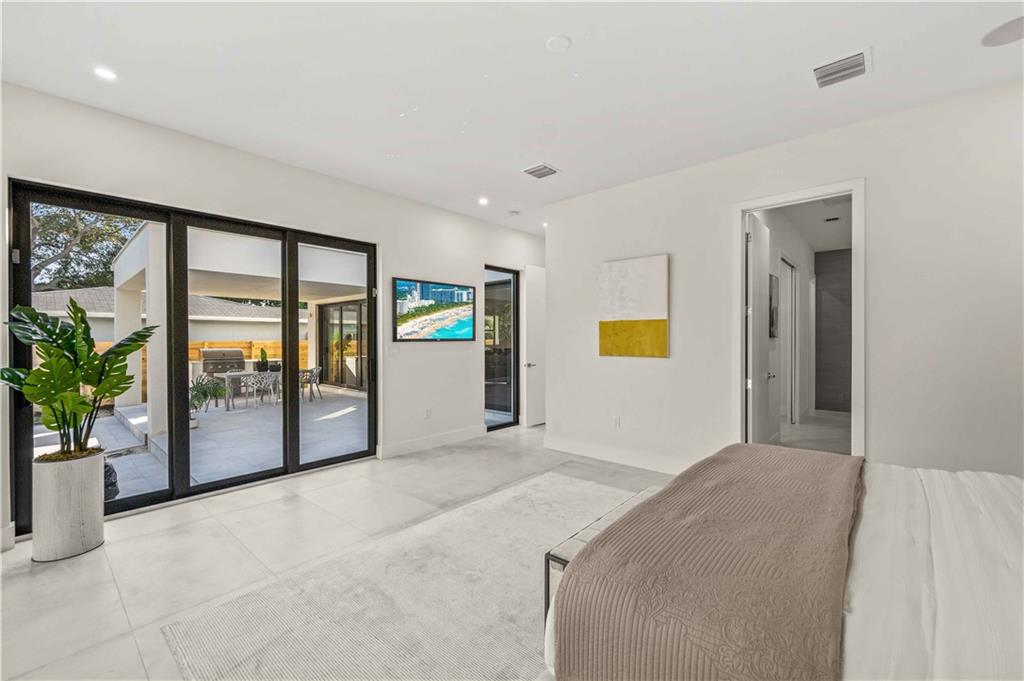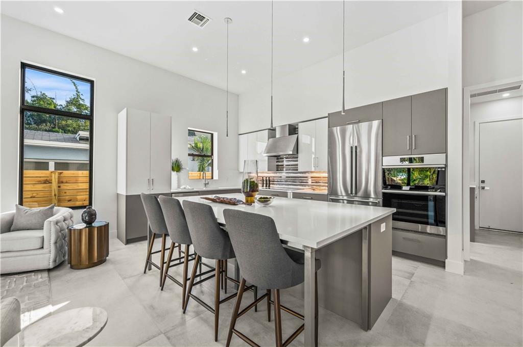 Stunning open spaces greet you as you enter this brand new home through a wide foyer. High ceilings and walls of glass create light-filled rooms. The (apx) 28x29 foot great room has two sets of sliders to the sunny pool area and roofed loggia and summer kitchen. The primary suite with two walls of glass seems to float over the pool. A butler pantry adjacent to the kitchen has a prep/serving counter and additional storage. Next to that is a generously sized shelved pantry closet. The laundry has full-size stack appliances and a wash sink plus additional storage. Floors are oversized porcelain squares. All rooms have recessed ceiling lighting. Property is SMART HOME ready. Rear yard is fenced and gated for privacy with rear alley access for flexibility.