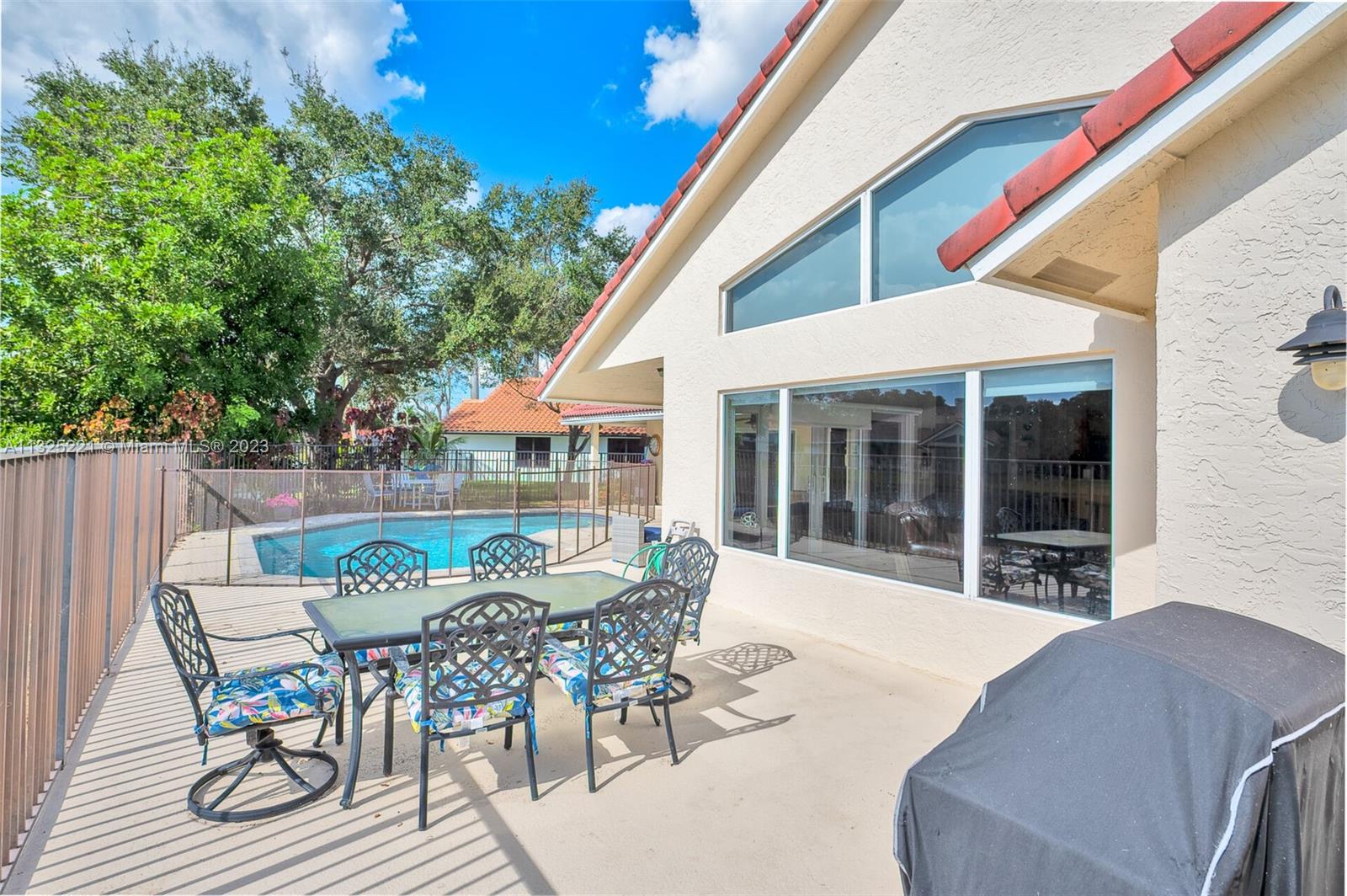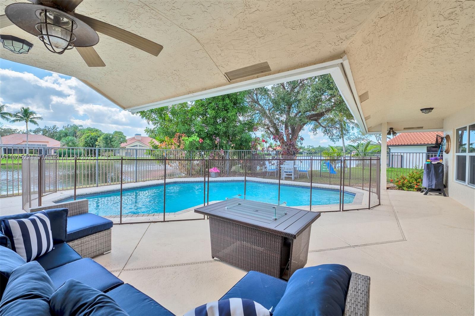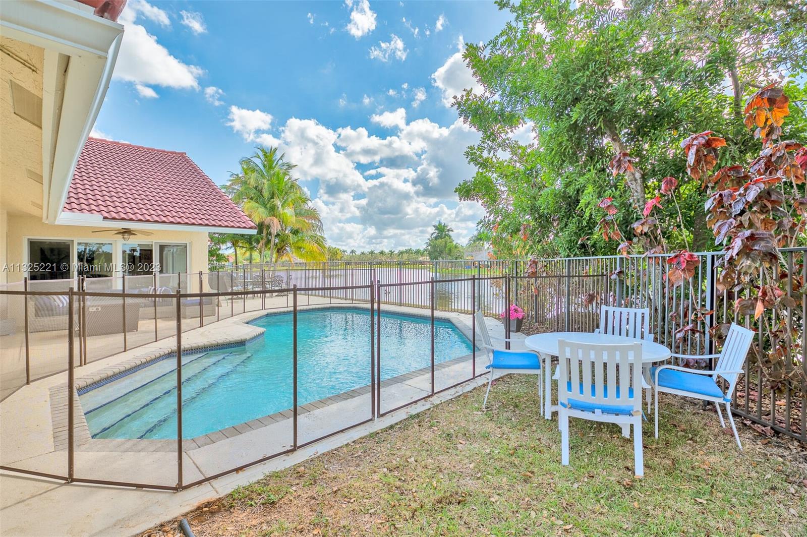 The PERFECT family home to make your own. This home boasts a 4 bedroom, triple split floor plan with 3 bathrooms, and a generous covered patio with extended lake views. Gorgeous sunsets over the pool. Newer roof, freshly painted walls inside/out and impact windows throughout. Located within the neighborhood of Tequesta, within walking distance to the park and 24hr manned gate. Perfect for todays buyers who are craving a perfect outdoor area for entertaining.