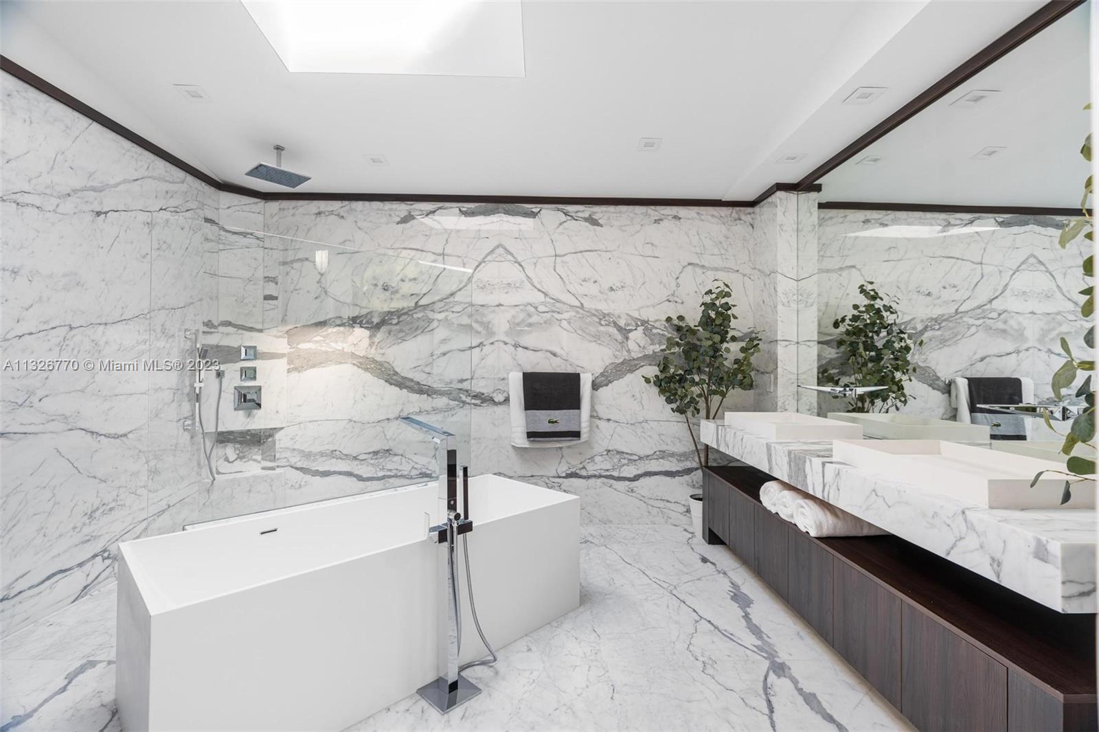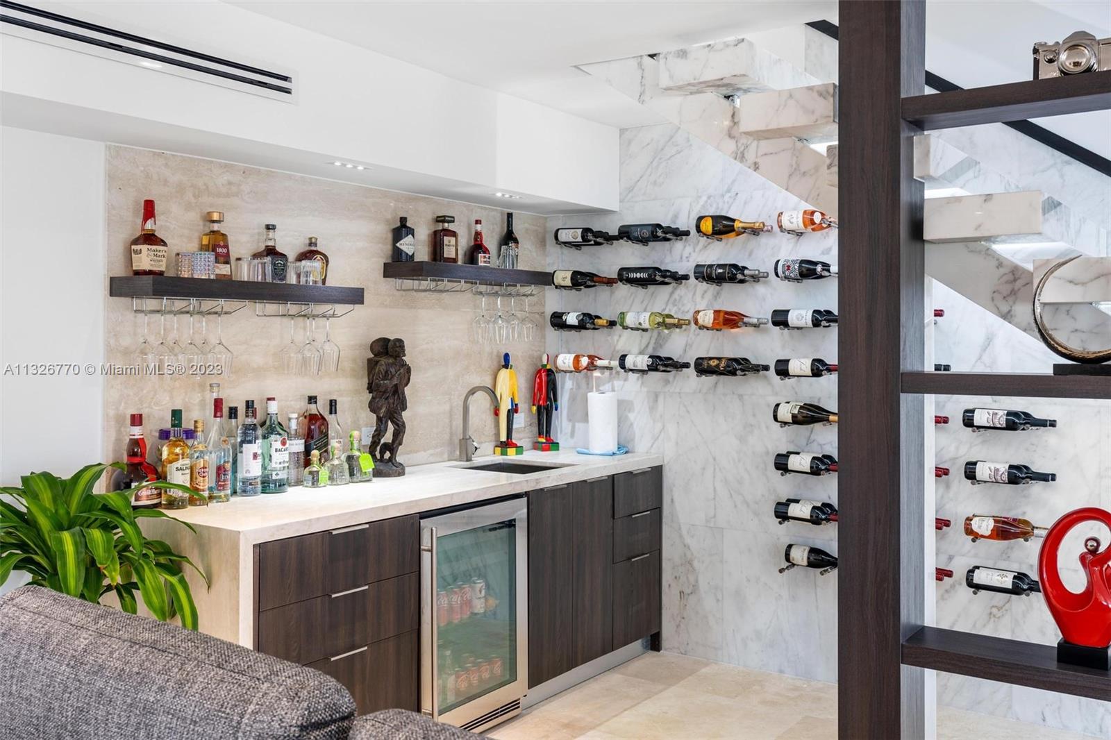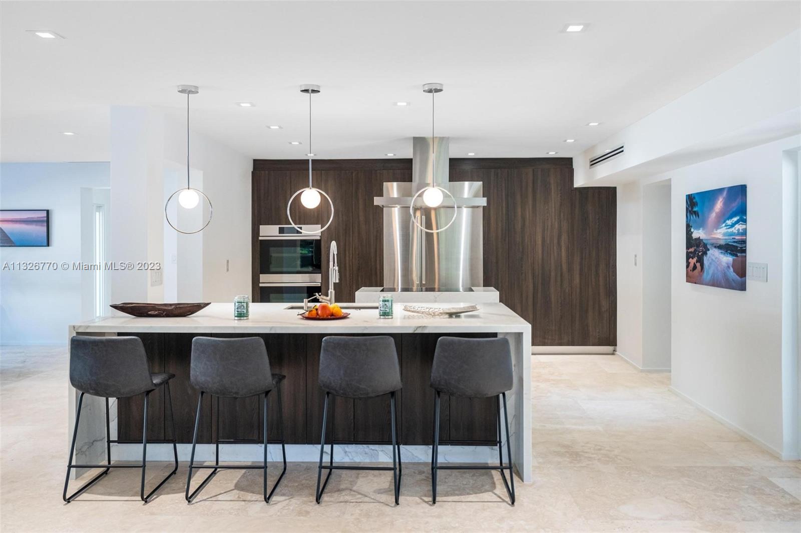MODERN. LUXURIOUS. ELEGANT. This stunning residence in the upscale Hollywood Lakes neighborhood features exquisite finishes from its exterior marble-clad facade, custom wood cabinetry, Calacatta waterfall islands, custom marble staircase, and travertine/marble floors. This 4 bed, 4 bath home sits on a corner lot steps away from the bay and offers an open floor plan, impact windows, custom bar + modern wine rack, two outdoor gazebos with a fully-equipped summer kitchen, gorgeous pool deck + manicured landscaping, and oversized laundry room. The master suite offers a sitting area + outdoor terrace overlooking the water, mesmerizing statuary marble bathroom with rain shower + spa tub, and custom walk-in closet cabinetry. Marvelous home with the most exceptional materials and finishes!