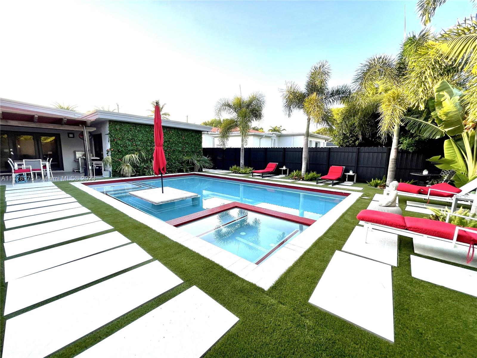 This magnificent smart home features a delightful Grand Room integrated floorplan, which includes a living room, a dining room, a family room, and a custom-built kitchen with an island, bar, and custom-designed appliances, all nestled between the three bedrooms and the beautifully manicured front and back yards. The Grand Room and Master Bedroom open up to a lovely outdoor terrace that leads to the pool area and outdoor lounge in the backyard. Both front and backyards are directly interconnected by side landscaped private green alleyways. This entire smart home is controlled by safe digital door locks, centralized lighting & AC systems, and impact windows for your protection. THE HOME HAS PLANS FOR A SECOND FLOOR!