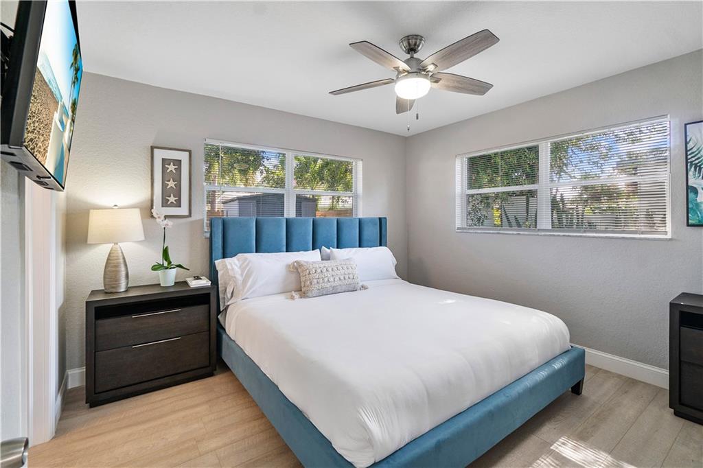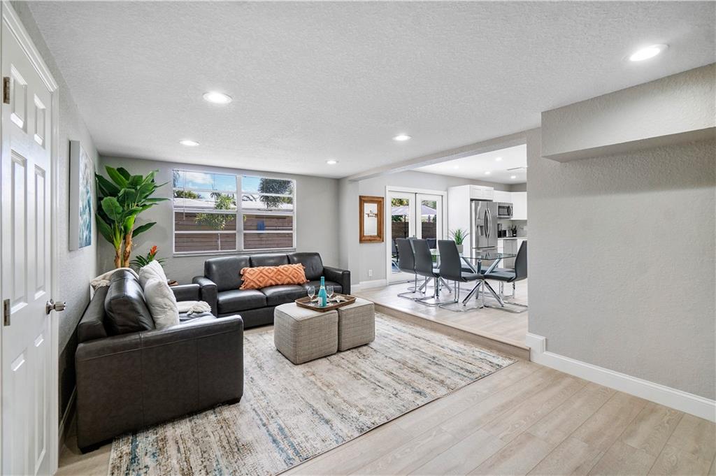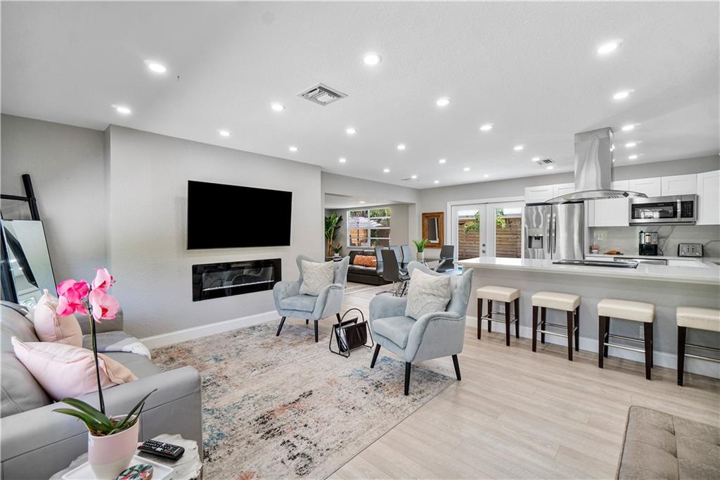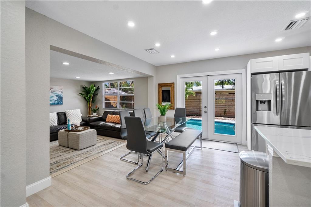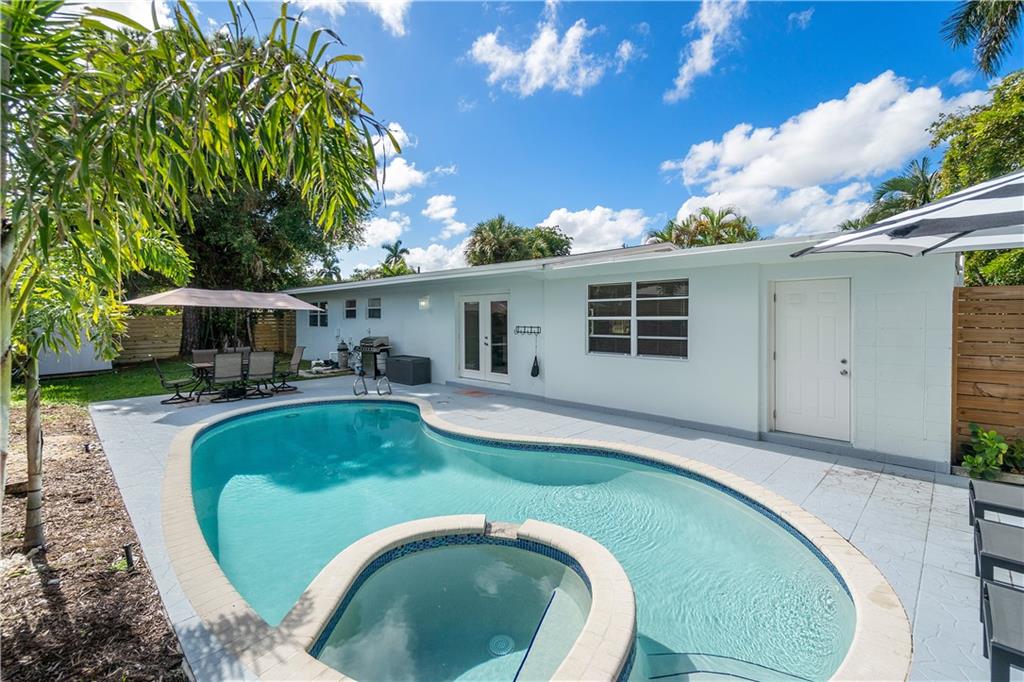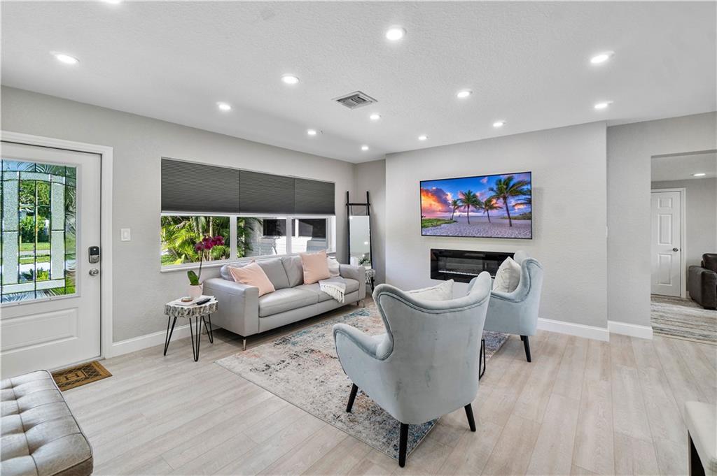 Stunning family beach house or Vacation rental opportunity! Gorgeously, updated home w/ brand new hurricane impact windows, new roof, new kitchen and baths. Features open concept with chef's kitchen, Calacatta marble counters/backsplash, new stainless appliances, water resistant vinyl electric fireplace, bar w/ wine cooler, Two primary rooms with en suites and split floorplan. Primary has large walk in closet, dual sinks, cabana bath, inside laundry room with new washer and dryer, pool resurfaced with new diamond bright tiles, modern fence for privacy, remodeled landscape, new fixtures and new water heater. Home only a mile from the beach in hot redeveloped Pompano east of US1, across from city park, golf course, boat ramp and restaurants. Walkable Harbor Village neighborhood!