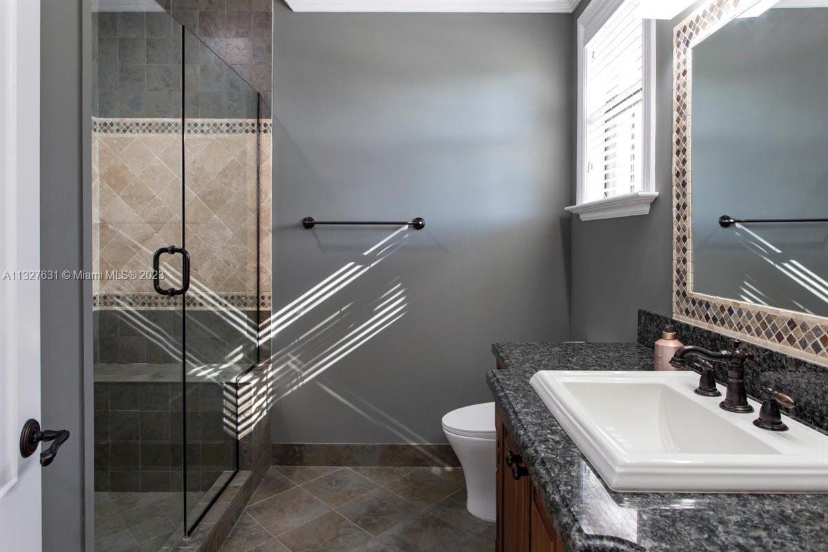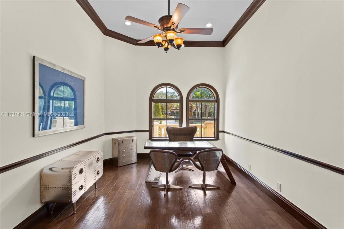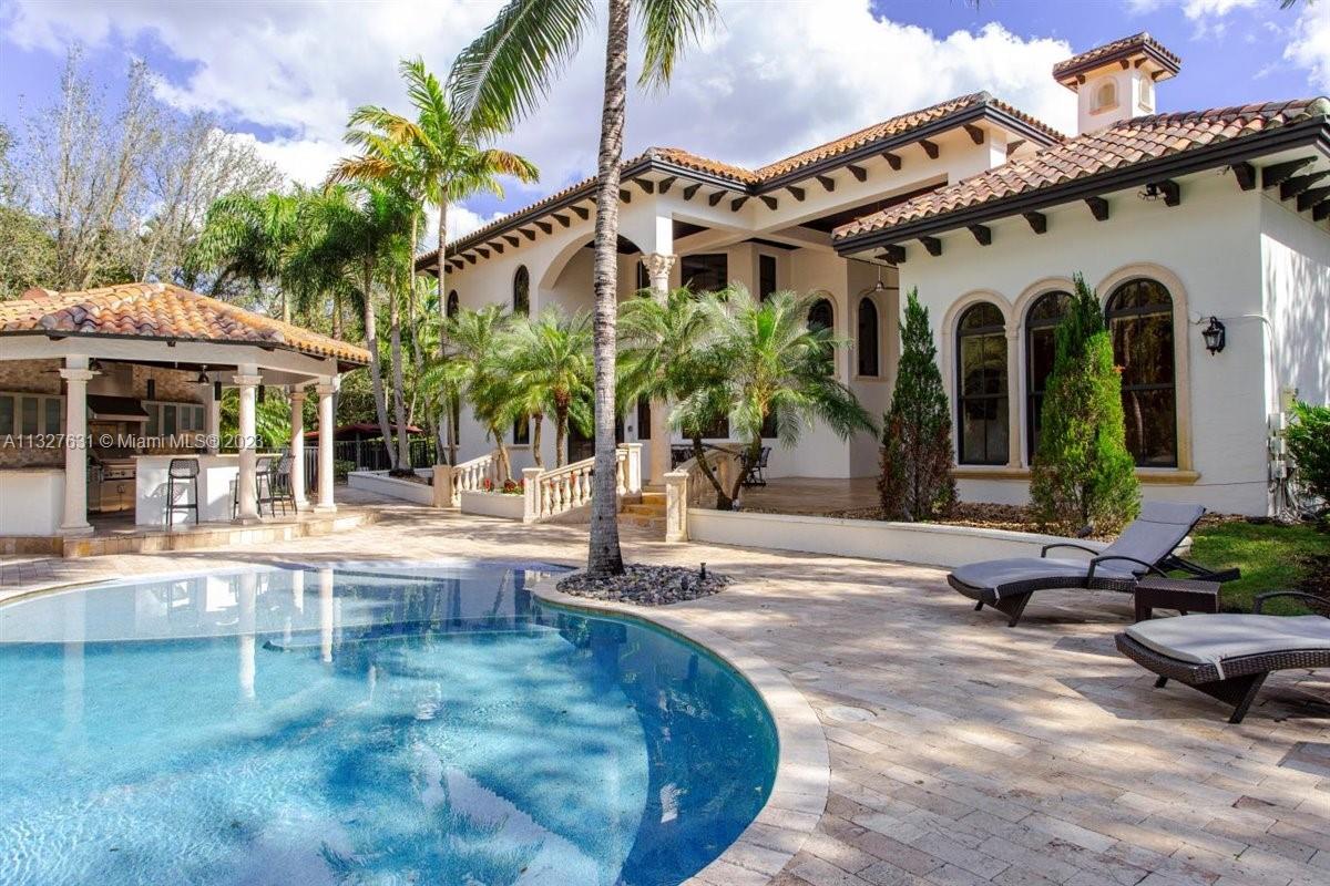 Beautiful 8247 sf Mediterranean Tuscan-style villa nestled in a private gated community featuring only 34 homes. Home is situated on cul-de-sac. Features 5 bedrooms+office and 6.5 baths. Oversized primary bedroom on ground floor w/ exquisite primary ensuite. In-law/guest suite equipped with private kitchen, living room, bathroom and private entrance. Remodeled chef's kitchen with beautiful quartz countertops, high-end appliances and gas stove. 3 bedrooms upstairs all w/ attached baths. Impact windows and doors. State-of-the-art security system and Sonos speakers integrated throughout. Step outside to your private outdoor tropical oasis w/ a fully equipped summer kitchen, resort-style lagoon saltwater pool and jacuzzi overlooking a lake and beautiful sunset views. Community Tennis court.