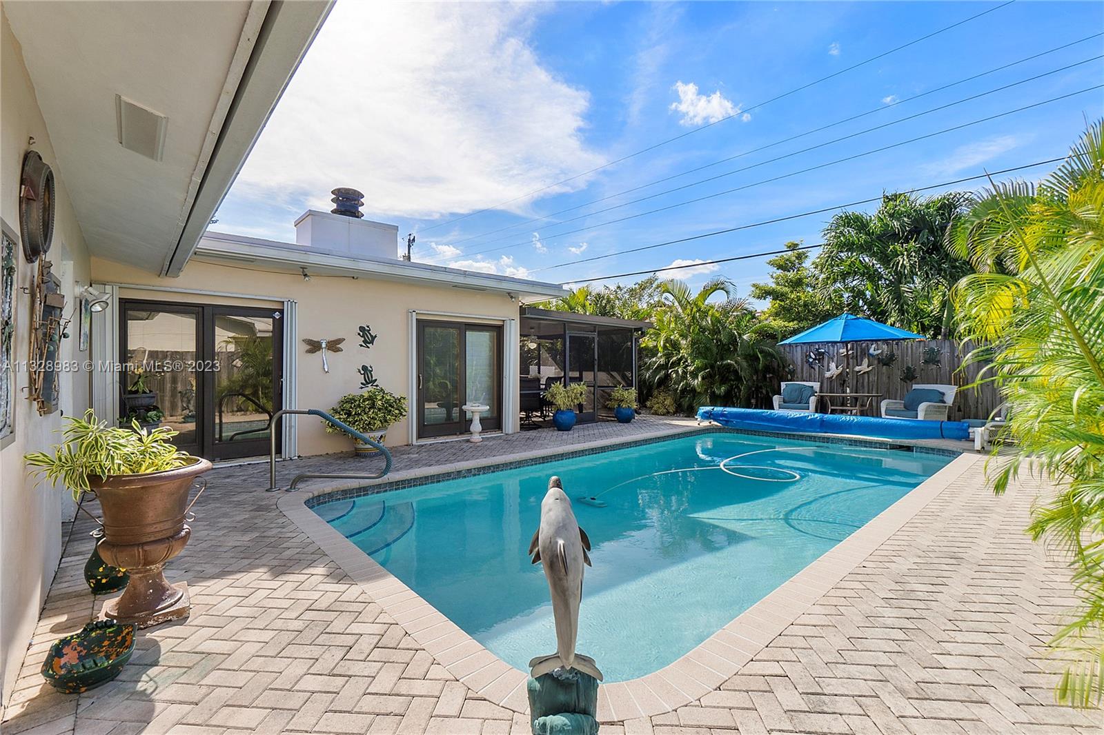 **LOCATION**LOCATION** Impeccable 3/2 pool home in sought after Coral Ridge Isles. 10 minutes to beaches, downtown nightlife and Ft Lauderdale Int'l airport! This substantially remodeled, resort style home features: impact windows, doors and accordion shutters, new stamped concrete circular driveway w/2 car garage, tile floors throughout, expansive updated kitchen w/wood cabinets, granite countertops, double ovens, breakfast bar, and recessed lighting, updated bathrooms, walk-in closet in master, French doors surround spacious family room with wood burning fireplace. Your private backyard oasis boasts a large covered screened in patio, a gazebo, hot tub, an oversized heated pool surrounded by lush tropical landscaping and brick paver patio, fenced and very private.