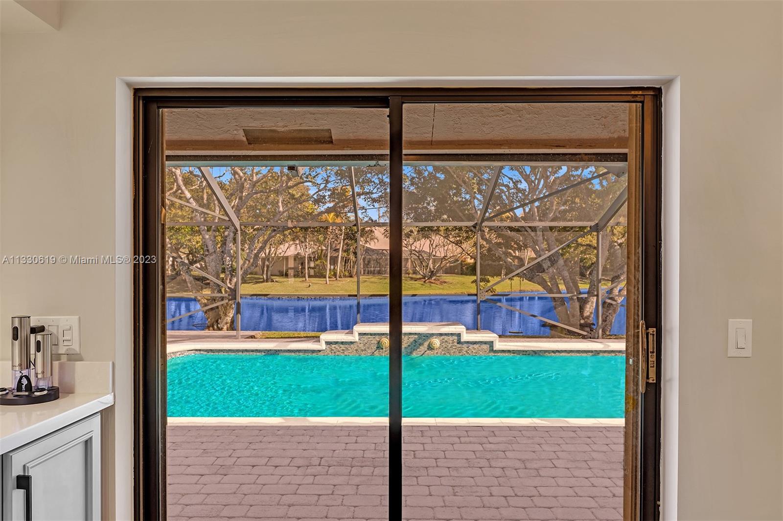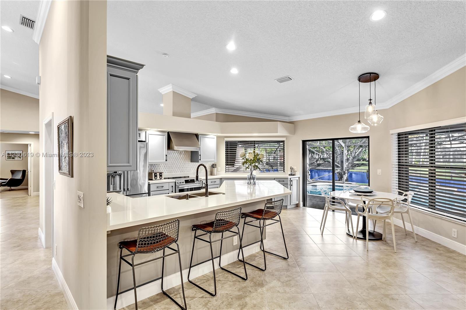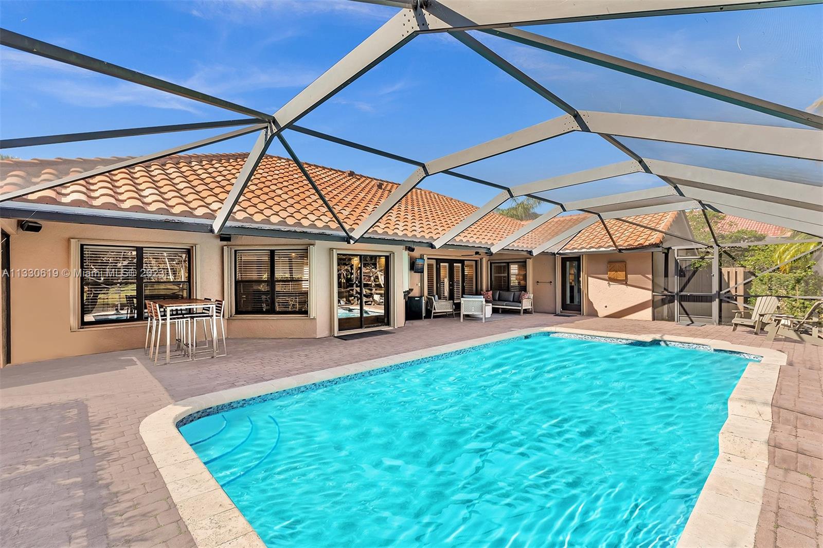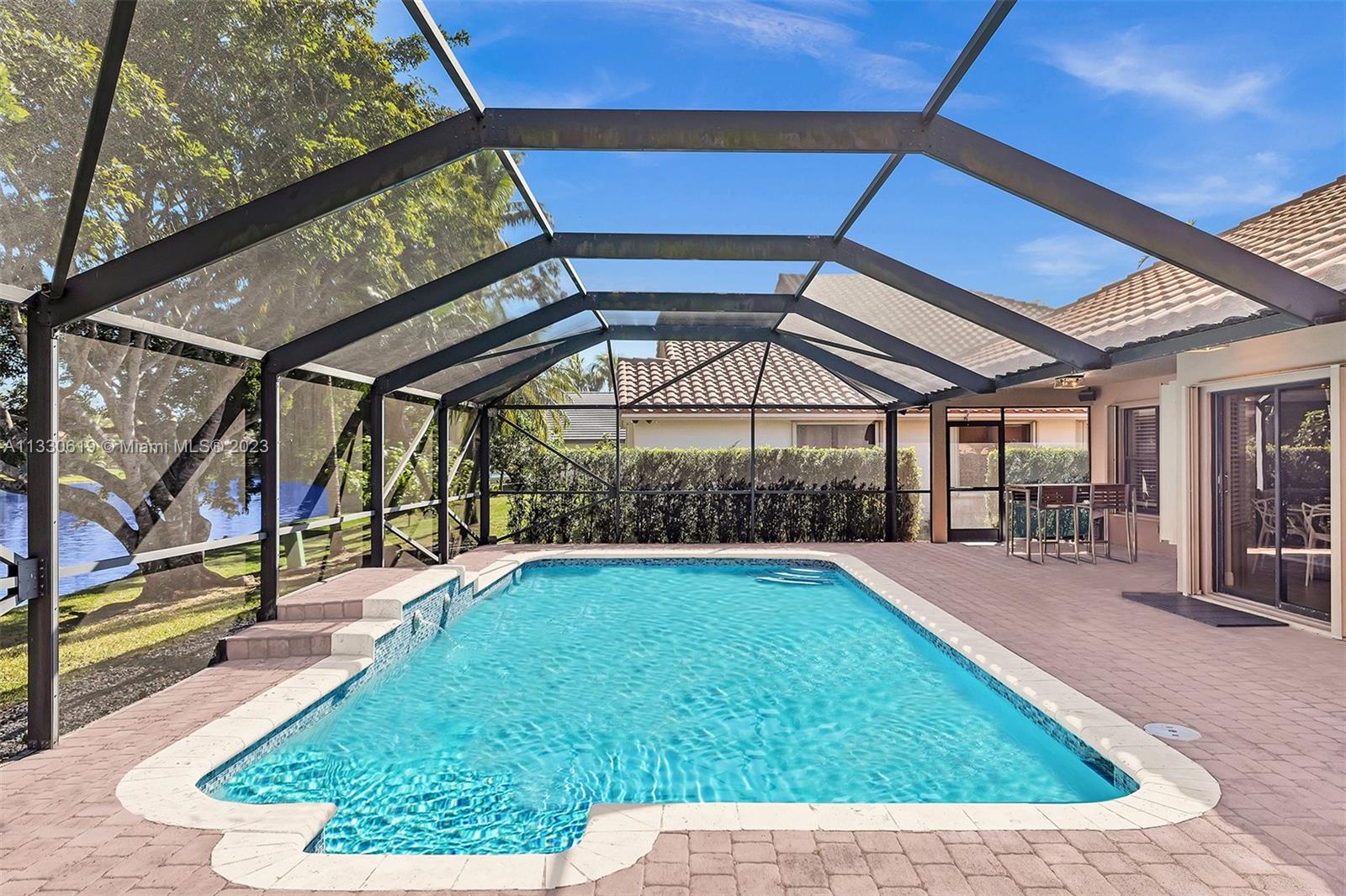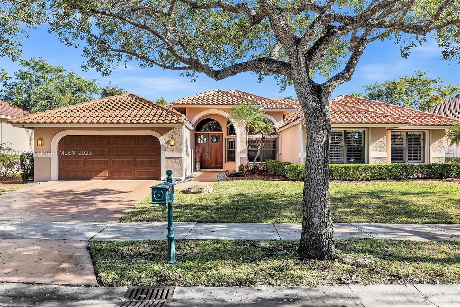 This graciously updated one story 5 bed/3 bath home is executed with a transitional flair, completed w/fine taste and attention to detail! Nestled in the exclusive guard gated tree-lined Weston community of Tequesta, the property sits on a private waterfront lot. Chef's kitchen, w/custom cabinetry, top of the line GE appliances, double oven, unique tile backsplash, quartz counter tops and wine cooler, overlooks the breakfast area and spacious family room. Spa-like master bathroom exudes a zen-like feel. Additional features include Plantation shutters, custom closets and split bedroom plan. Step onto the screened and paver patio and lounge in the pool while enjoying the view, perfect for outdoor lifestyle. Accordion shutters, Roof 2017, pool resurfaced, enclosure re-screened 2020 and more!