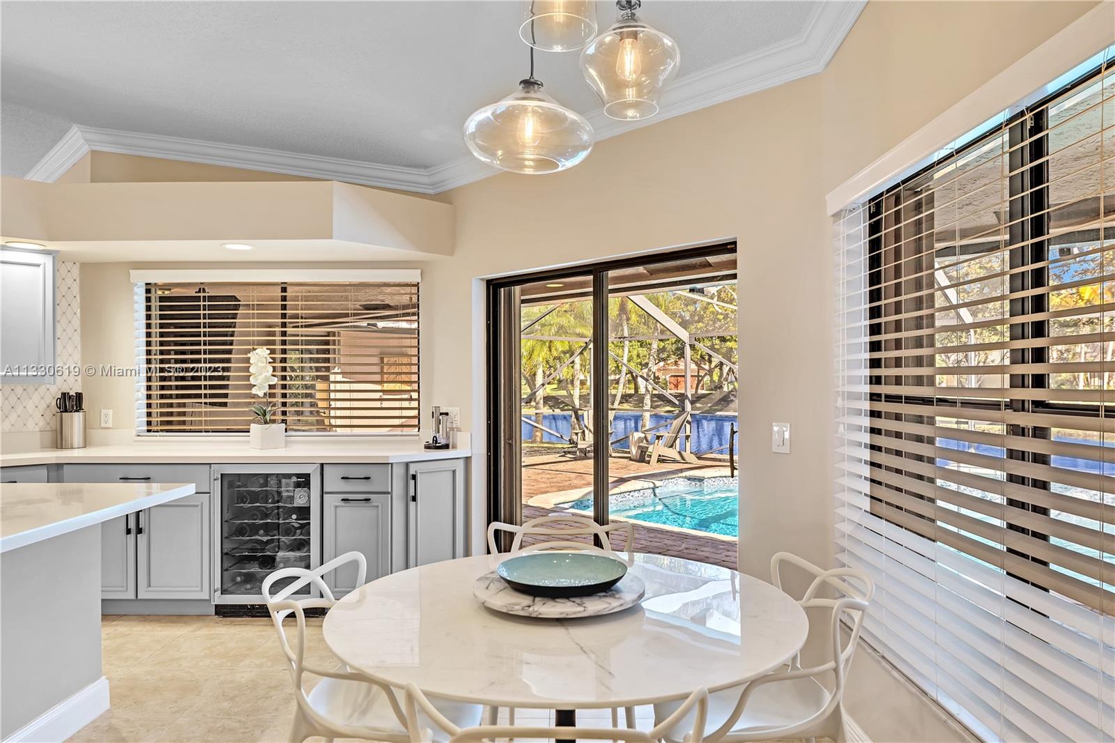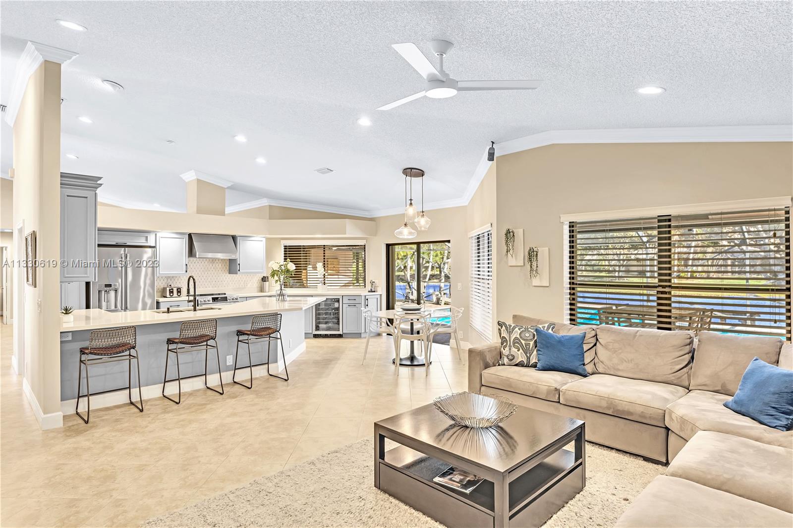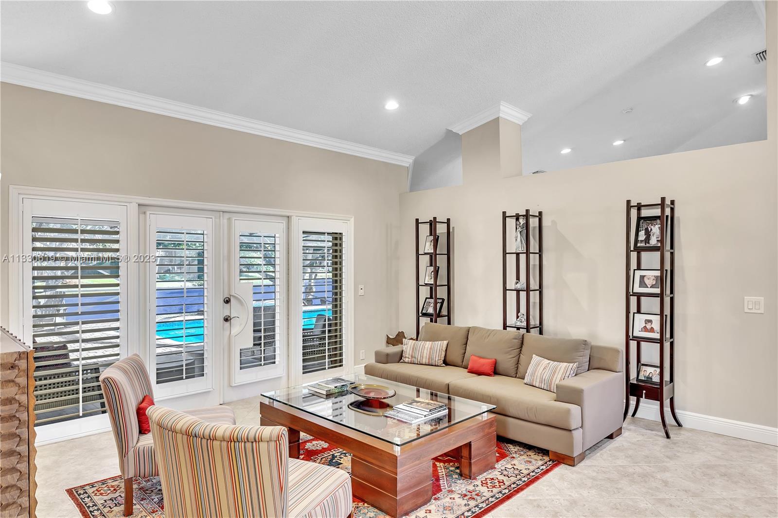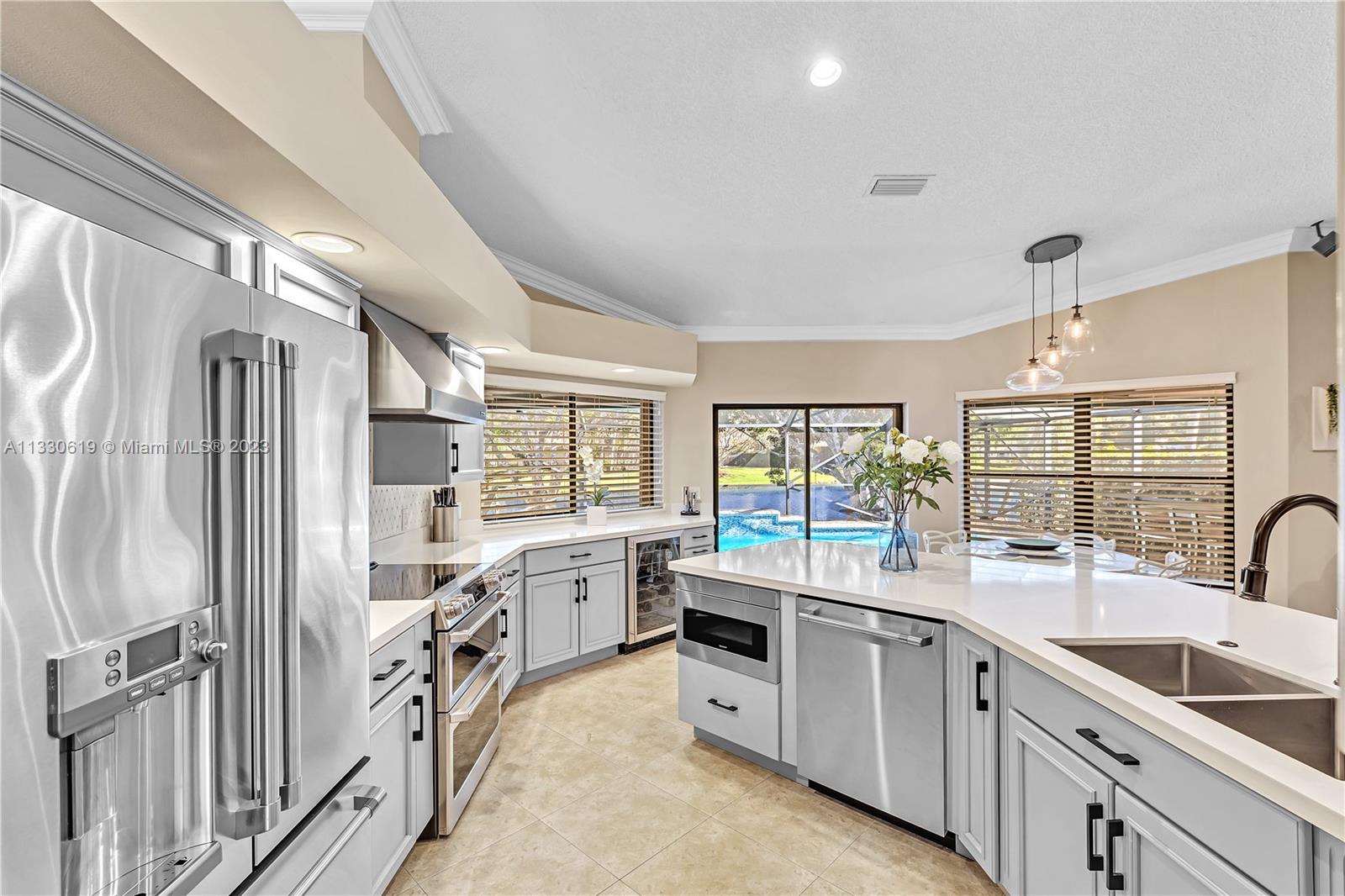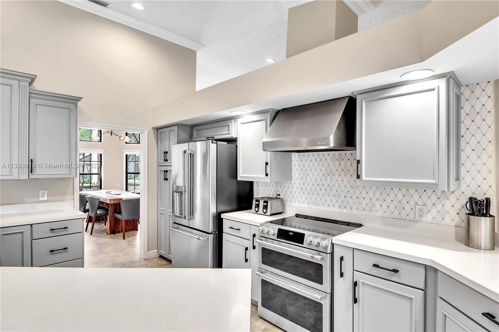 This graciously updated one story 5 bed/3 bath home is executed with a transitional flair, completed w/fine taste and attention to detail! Nestled in the exclusive guard gated tree-lined Weston community of Tequesta, the property sits on a private waterfront lot. Chef's kitchen, w/custom cabinetry, top of the line GE appliances, double oven, unique tile backsplash, quartz counter tops and wine cooler, overlooks the breakfast area and spacious family room. Spa-like master bathroom exudes a zen-like feel. Additional features include Plantation shutters, custom closets and split bedroom plan. Step onto the screened and paver patio and lounge in the pool while enjoying the view, perfect for outdoor lifestyle. Accordion shutters, Roof 2017, pool resurfaced, enclosure re-screened 2020 and more!