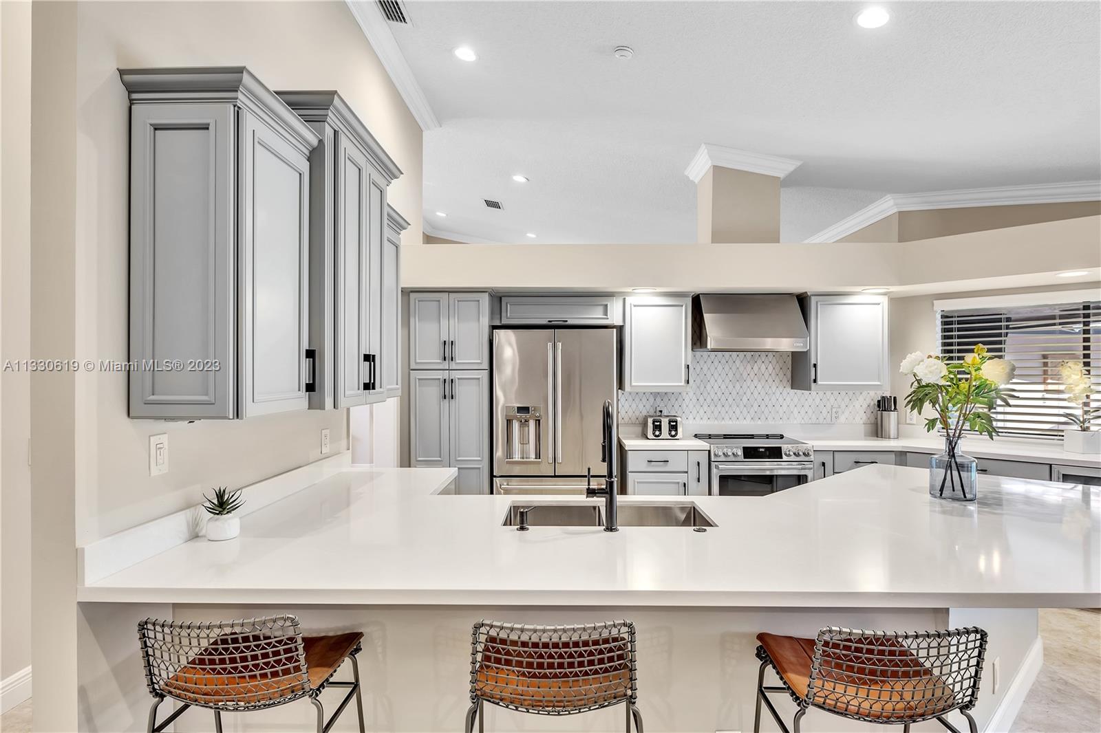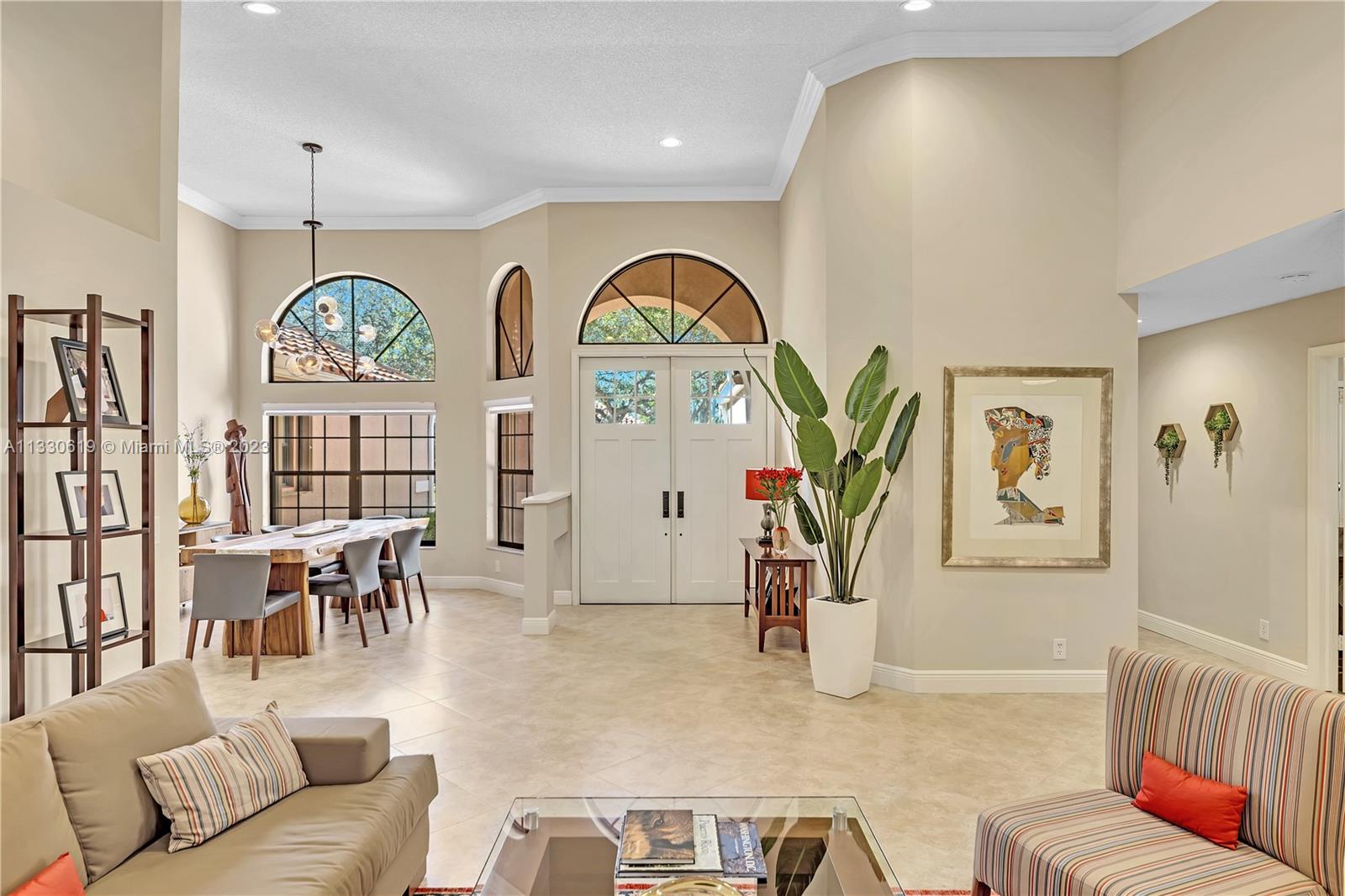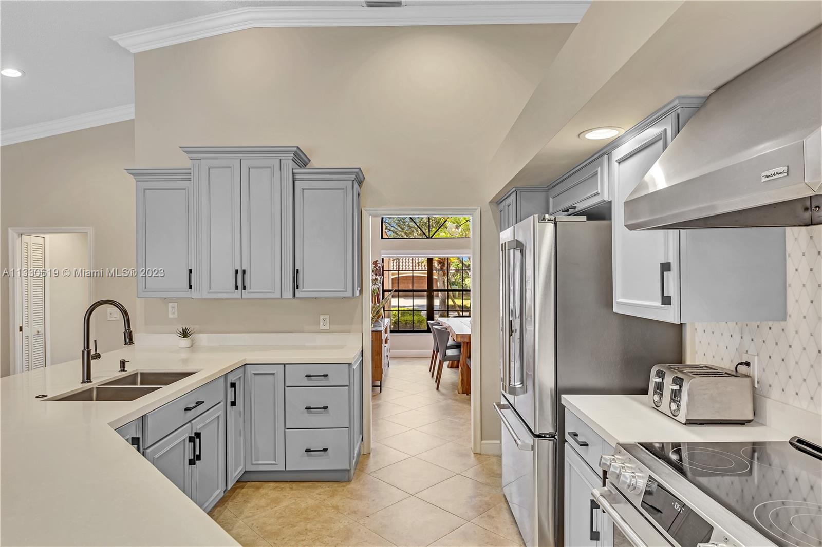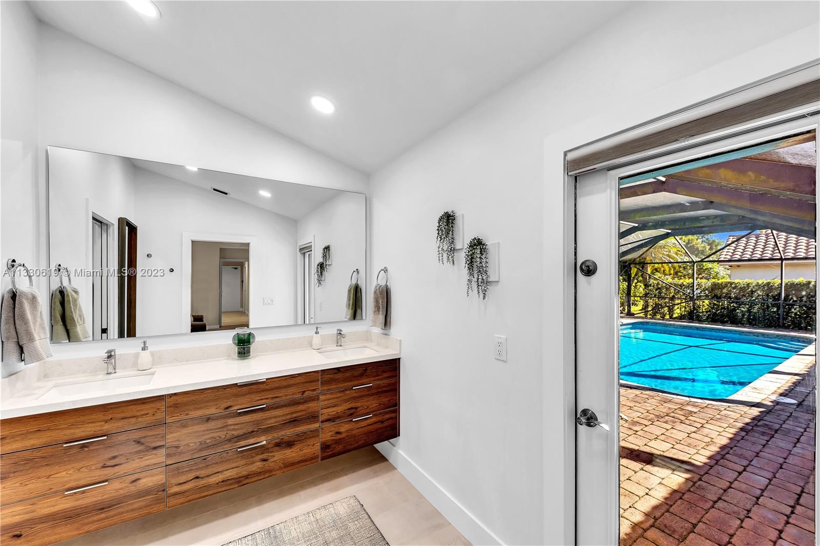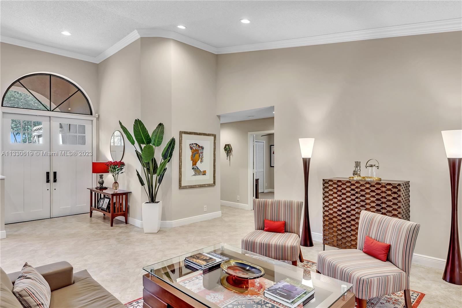 This graciously updated one story 5 bed/3 bath home is executed with a transitional flair, completed w/fine taste and attention to detail! Nestled in the exclusive guard gated tree-lined Weston community of Tequesta, the property sits on a private waterfront lot. Chef's kitchen, w/custom cabinetry, top of the line GE appliances, double oven, unique tile backsplash, quartz counter tops and wine cooler, overlooks the breakfast area and spacious family room. Spa-like master bathroom exudes a zen-like feel. Additional features include Plantation shutters, custom closets and split bedroom plan. Step onto the screened and paver patio and lounge in the pool while enjoying the view, perfect for outdoor lifestyle. Accordion shutters, Roof 2017, pool resurfaced, enclosure re-screened 2020 and more!