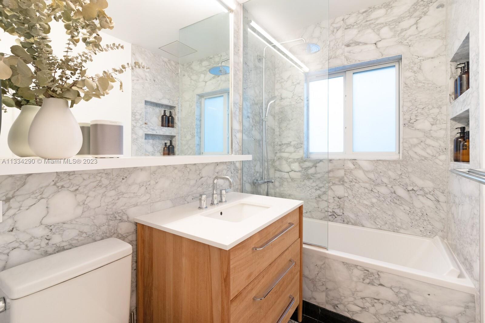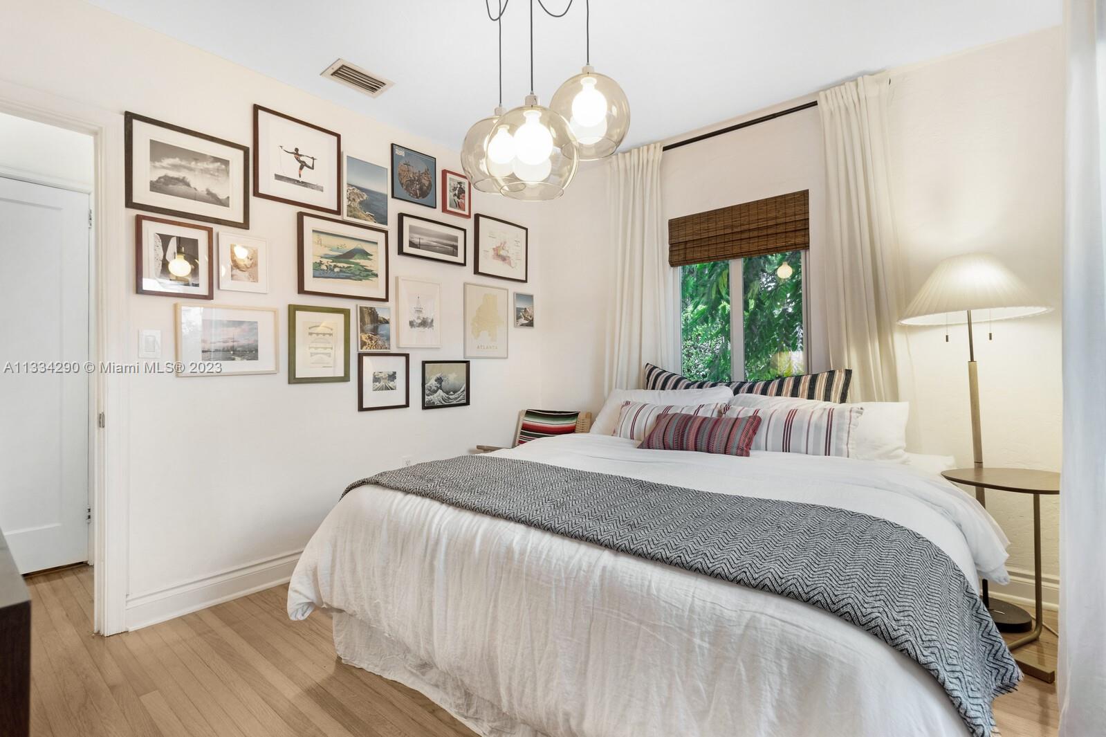 Artfully updated classic Miami Shores home with 2BR plus den & attached garage with laundry on spacious lot with room for a pool. Newly updated kitchen & butler pantry with custom cabinetry to maximize space, specialty cesarstone top, new appliances & 150 bottle wine refrigerator included in the sale. Spa like bathroom with carrera marble & custom teak vanity. Professionally placed lighting throughout with upgraded Lutron dimmers. Tranquil, private backyard with mature lush landscaping. Elevated deck with living area & dining over pavers with ample green space. Updated HVAC, electrical plumbing, new septic, Hurricane Windows & Doors. Move in ready with true 1 car garage plus circular driveway.
