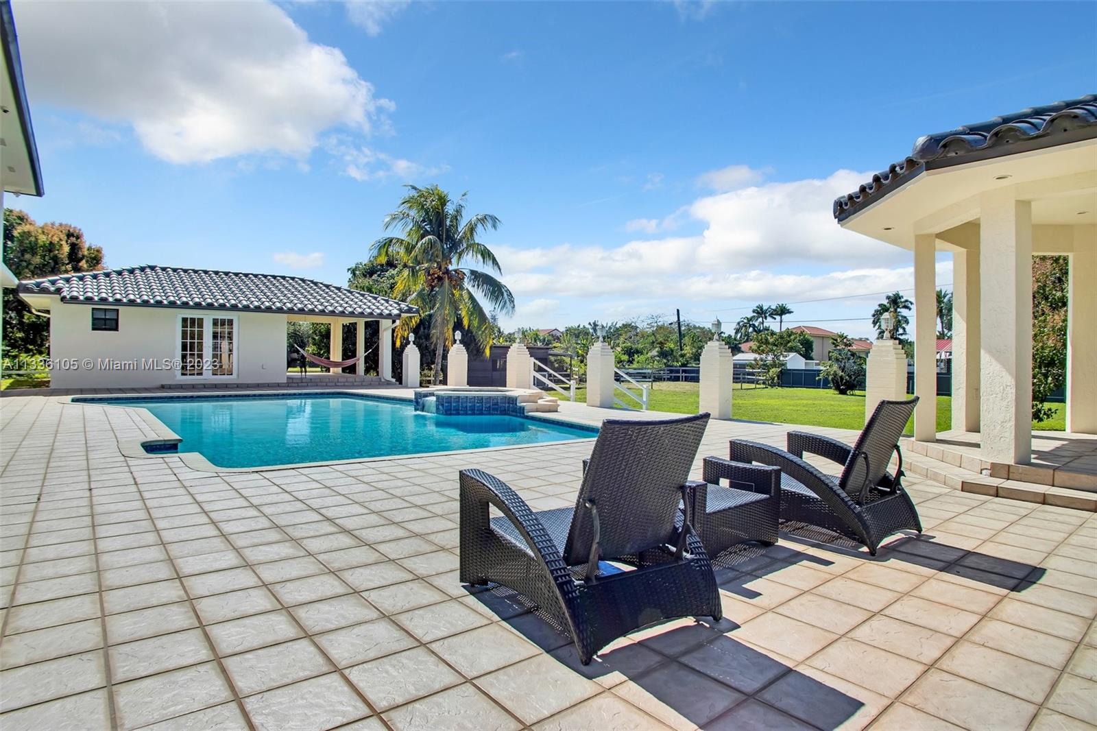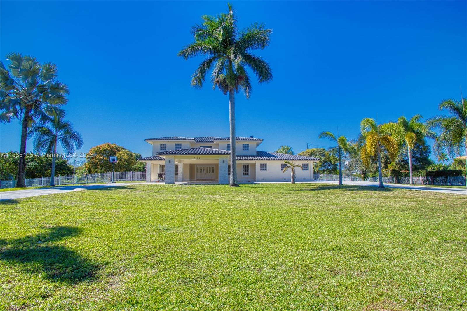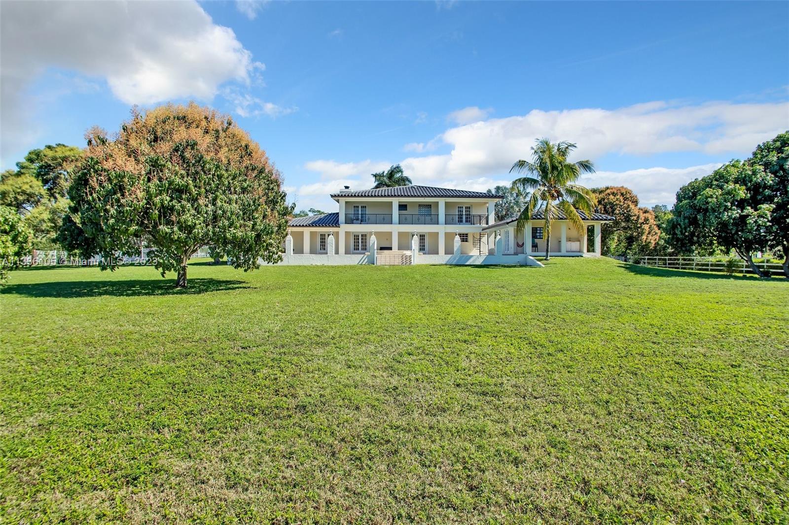 Exquisite tropical gem in the exclusive and private Country Club Ranches! This elegant, renovated gated estate boasts over 4,200 SF living area with an additional detached in-laws suite and is situated on prime 2 acre lot with sunset views overlooking oversized resort-style pool and spa. This custom estate has great curb appeal with its circular driveway surrounded by majestic palm trees and features impressive 25-feet fireplace in the spacious family room with vaulted ceilings, expansive private balcony, beautifully renovated kitchen, two large covered outdoor entertainment spaces by the oversized resort-style pool and spa, detached in-laws suite and two large horse stables. This estate is a perfect luxurious tropical oasis!