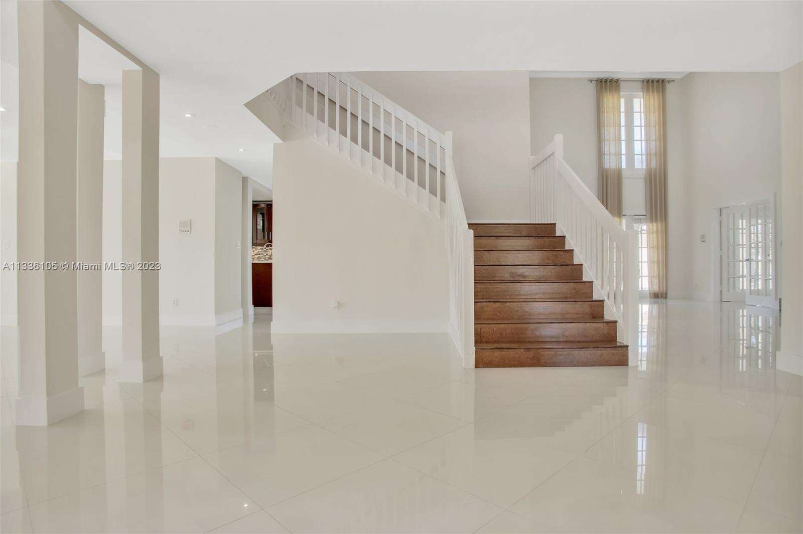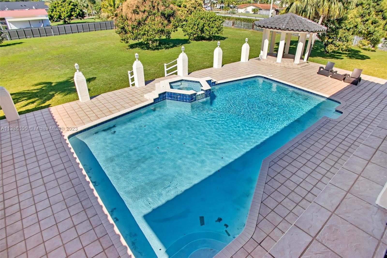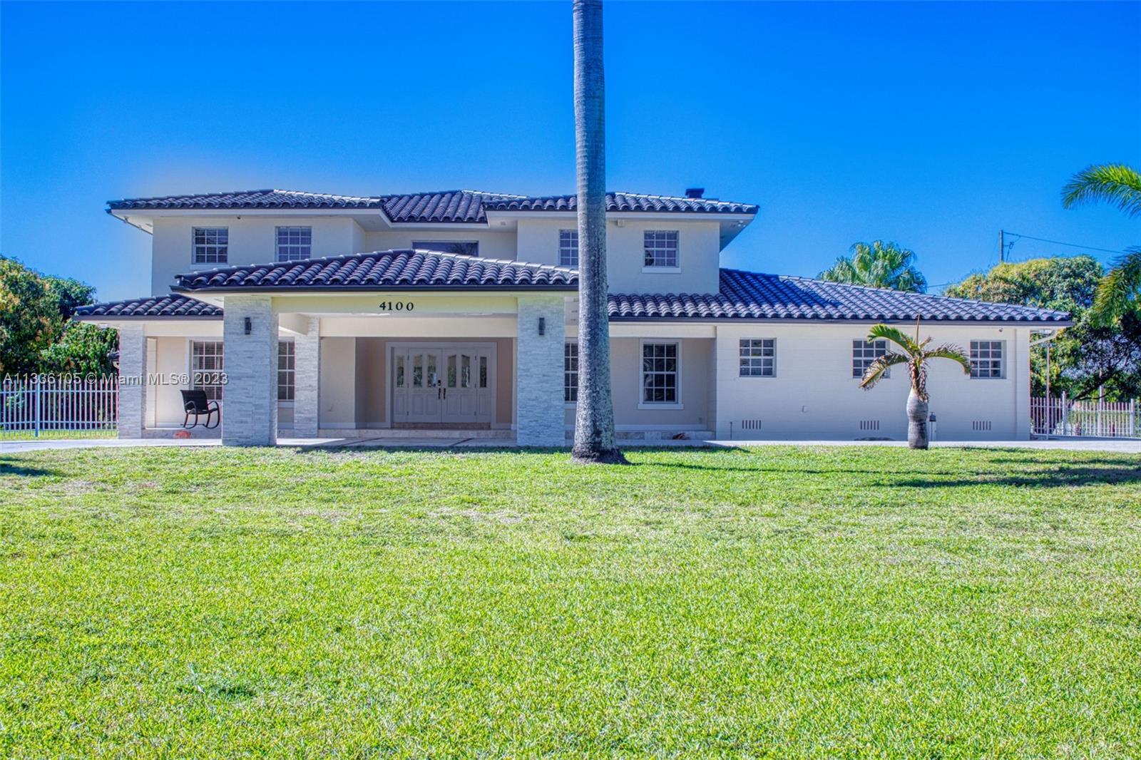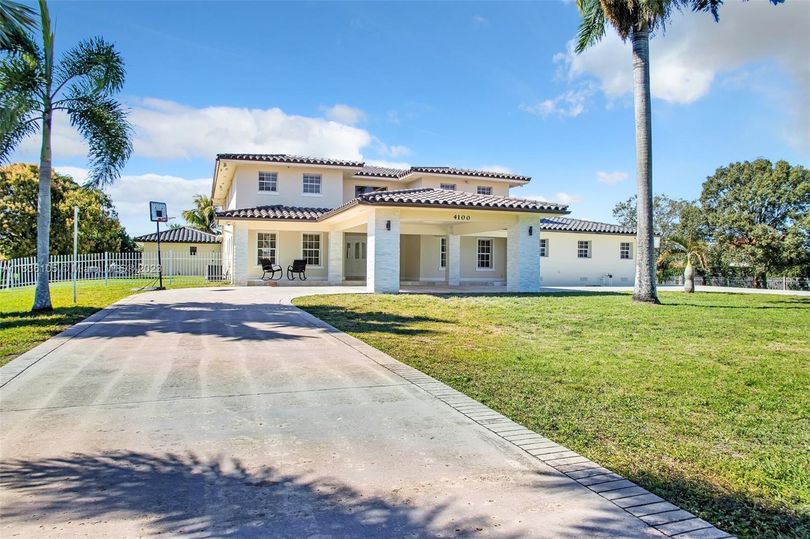 Exquisite tropical gem in the exclusive and private Country Club Ranches! This elegant, renovated gated estate boasts over 4,200 SF living area with an additional detached in-laws suite and is situated on prime 2 acre lot with sunset views overlooking oversized resort-style pool and spa. This custom estate has great curb appeal with its circular driveway surrounded by majestic palm trees and features impressive 25-feet fireplace in the spacious family room with vaulted ceilings, expansive private balcony, beautifully renovated kitchen, two large covered outdoor entertainment spaces by the oversized resort-style pool and spa, detached in-laws suite and two large horse stables. This estate is a perfect luxurious tropical oasis!