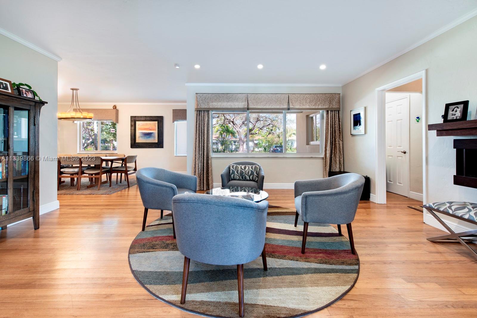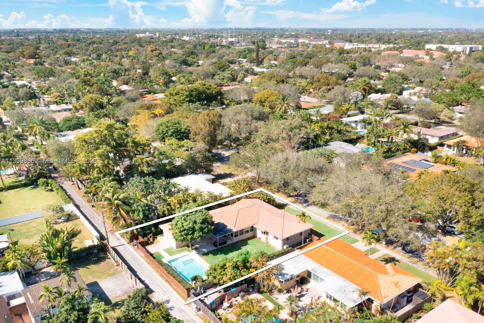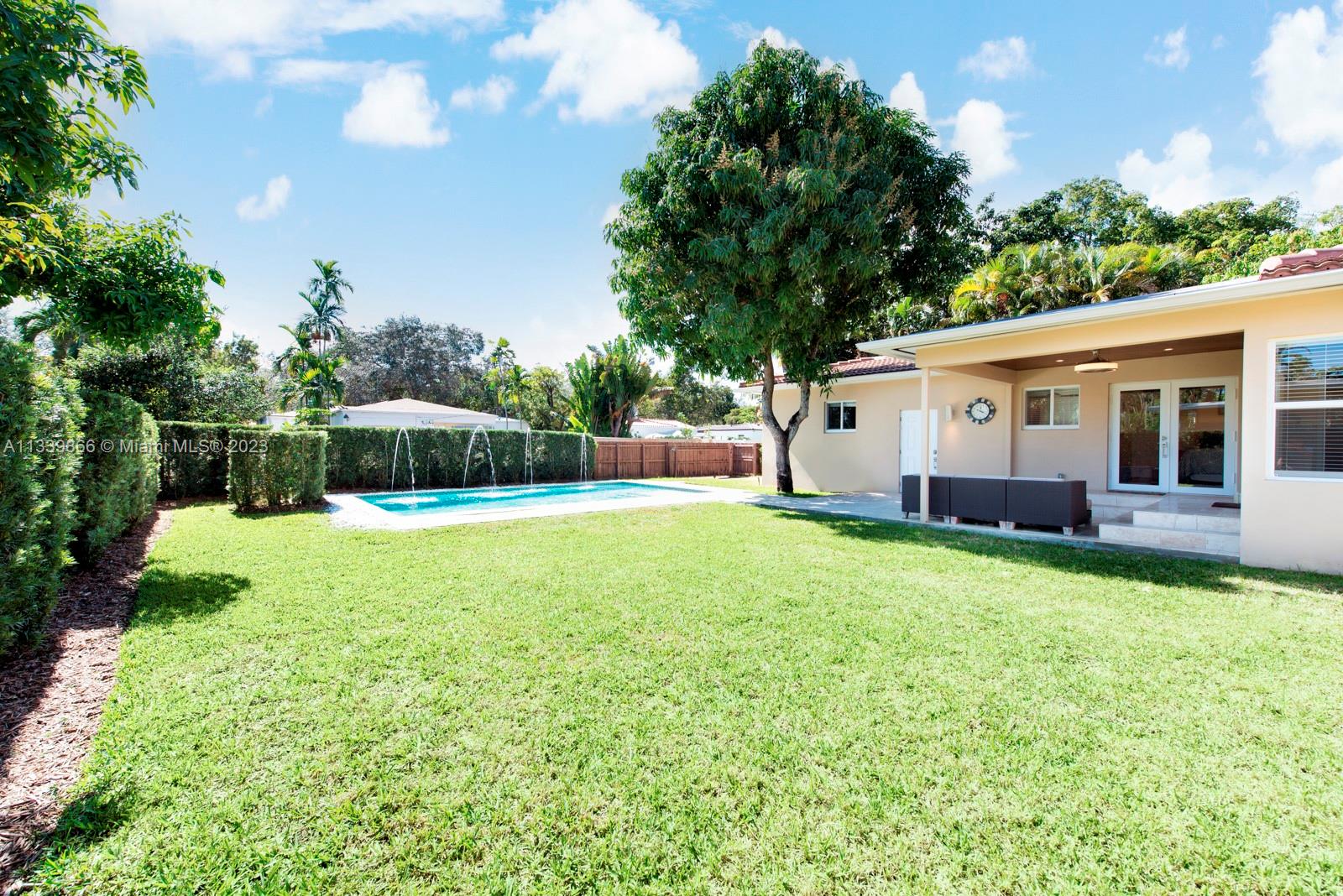 This turn key home is ready to be yours! Amazing entry captures that wow factor as you see through the home to the backyard oasis, complete with patio, sun drenched pool, and mature mango tree. In 2018 the sellers added a large family room, powder room, laundry room, and a new primary bedroom with double walk-in closets. French doors from both the primary and the family room lead to the pool/patio area. Spa-like primary bath with double sinks & oversized shower. Hardwood and porcelain tile floors throughout. This home offers two ensuite bedrooms for ultimate living flexibility. The 1½ car garage includes work bench and built in cabinets. All impact windows with custom window treatments, electric fireplace, tankless water heater, and two zone a/c all in 2018. There is more!!