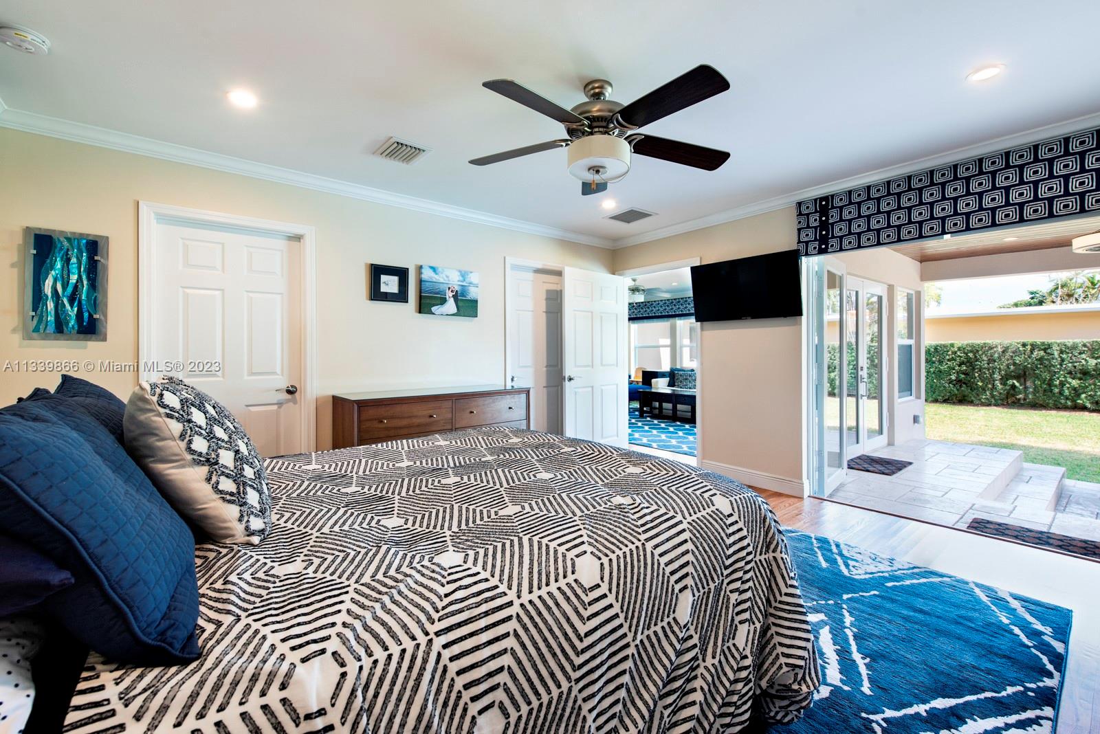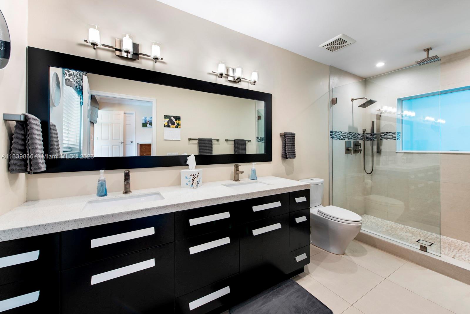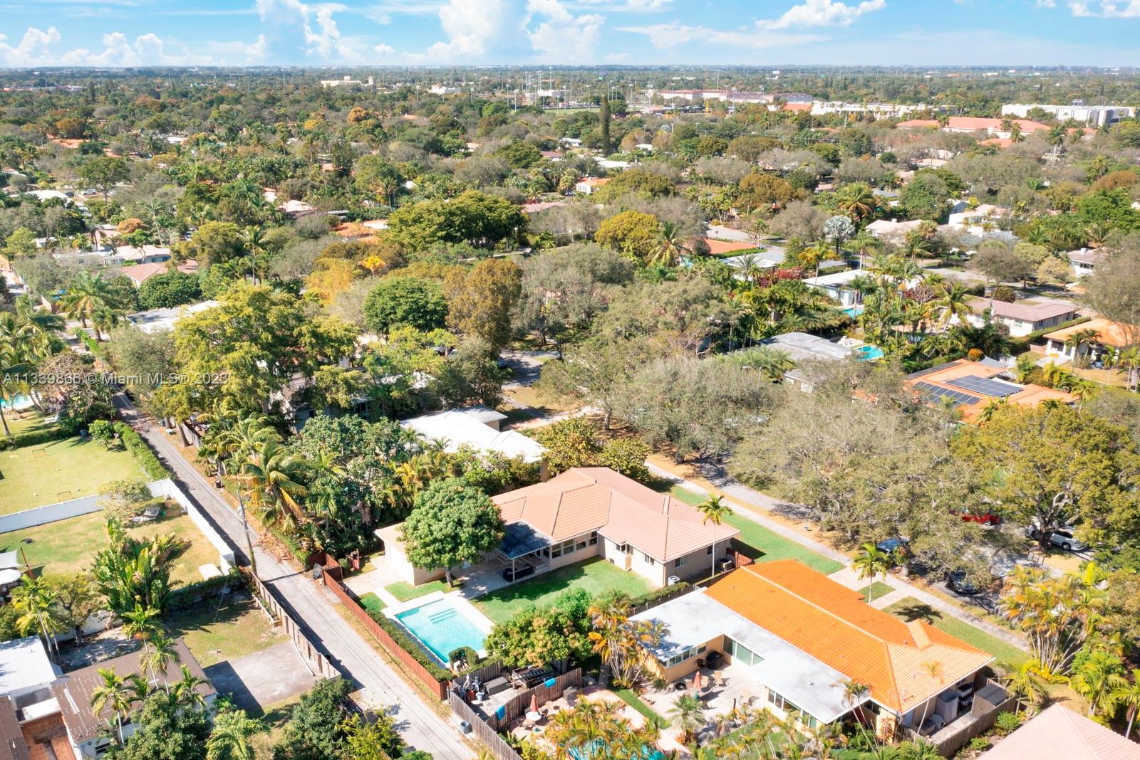 This turn key home is ready to be yours! Amazing entry captures that wow factor as you see through the home to the backyard oasis, complete with patio, sun drenched pool, and mature mango tree. In 2018 the sellers added a large family room, powder room, laundry room, and a new primary bedroom with double walk-in closets. French doors from both the primary and the family room lead to the pool/patio area. Spa-like primary bath with double sinks & oversized shower. Hardwood and porcelain tile floors throughout. This home offers two ensuite bedrooms for ultimate living flexibility. The 1½ car garage includes work bench and built in cabinets. All impact windows with custom window treatments, electric fireplace, tankless water heater, and two zone a/c all in 2018. There is more!!