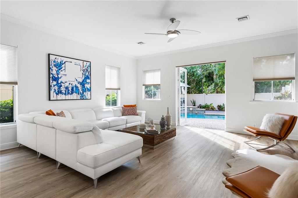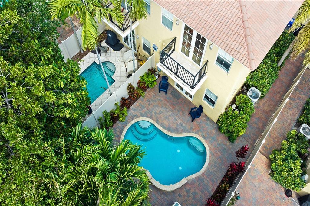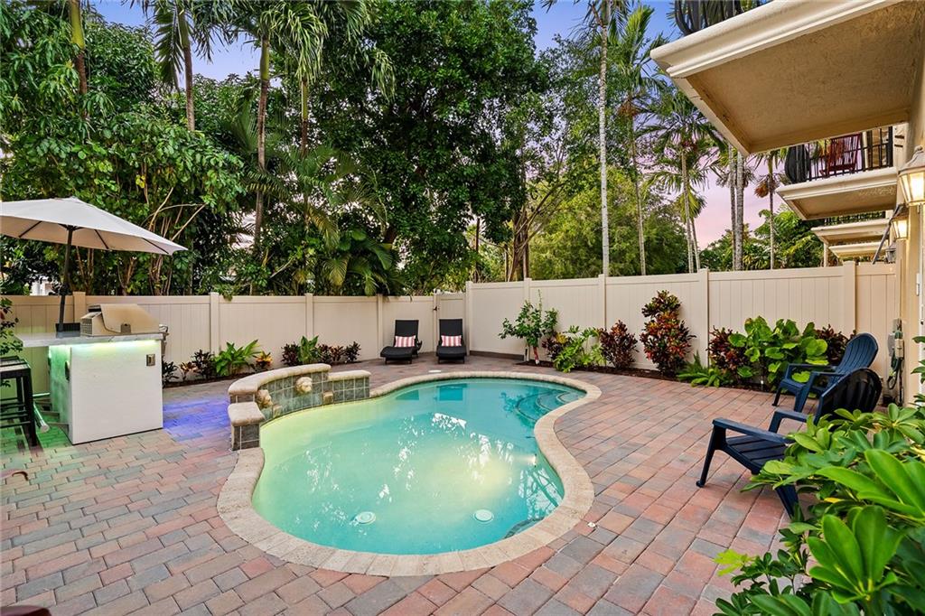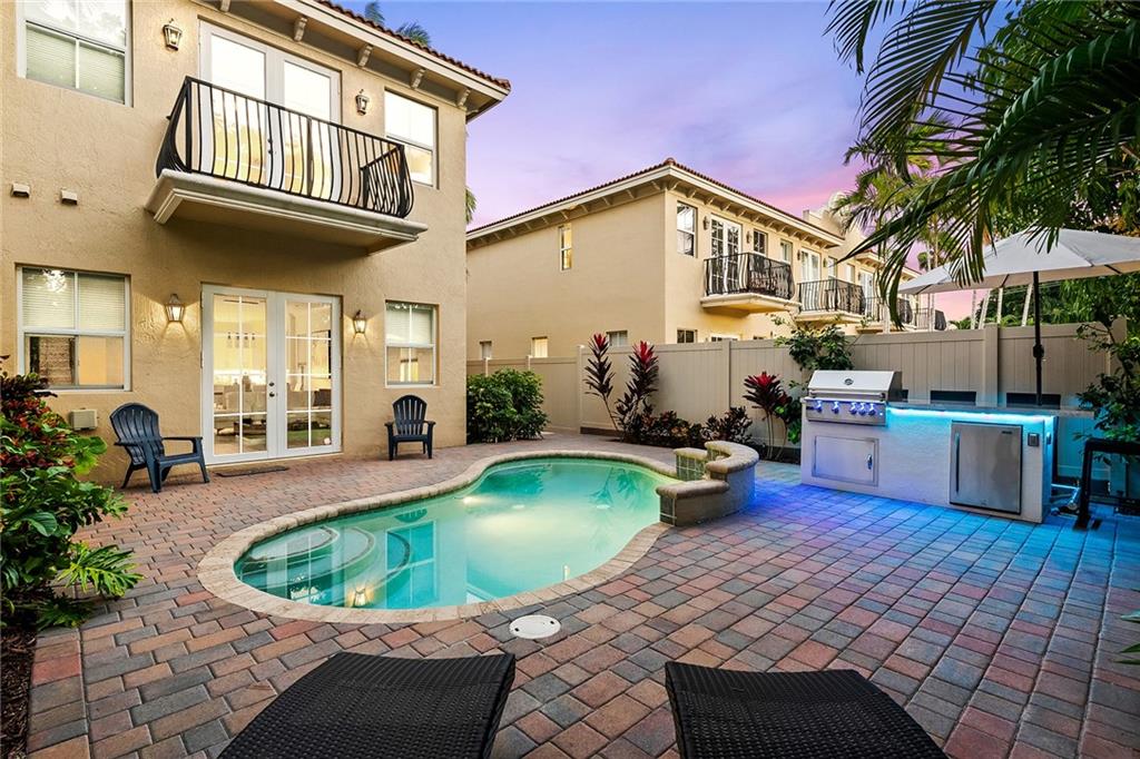 Corner Townhome, updated & inspired by contemporary design. Ideal for today's lifestyle w/a spacious & luminous open flr plan, enhanced by vol. ceilings & modern accents. The open kitchen w/tremendous counter space & snack bar overlooks the dining area, custom bar & great rm. French doors open to the oversized tropical backyard, a lrg. free form pool, patio, & custom BBQ equipped w/an entertaining area for dining, lighting & bluetooth sound system. The spacious primary suite provides the ultimate retreat w/an open balcony overlooking the pool & patio area, 2 custom walk-in closets & spa inspired bathrm w/a Jacuzzi & large walk-in shower. The Jr. Primary suite has 2 open balconies & the 3r br. is currently used as an office. Mins to shopping, restaurants, parks & the beach. Sq ft from BCPA