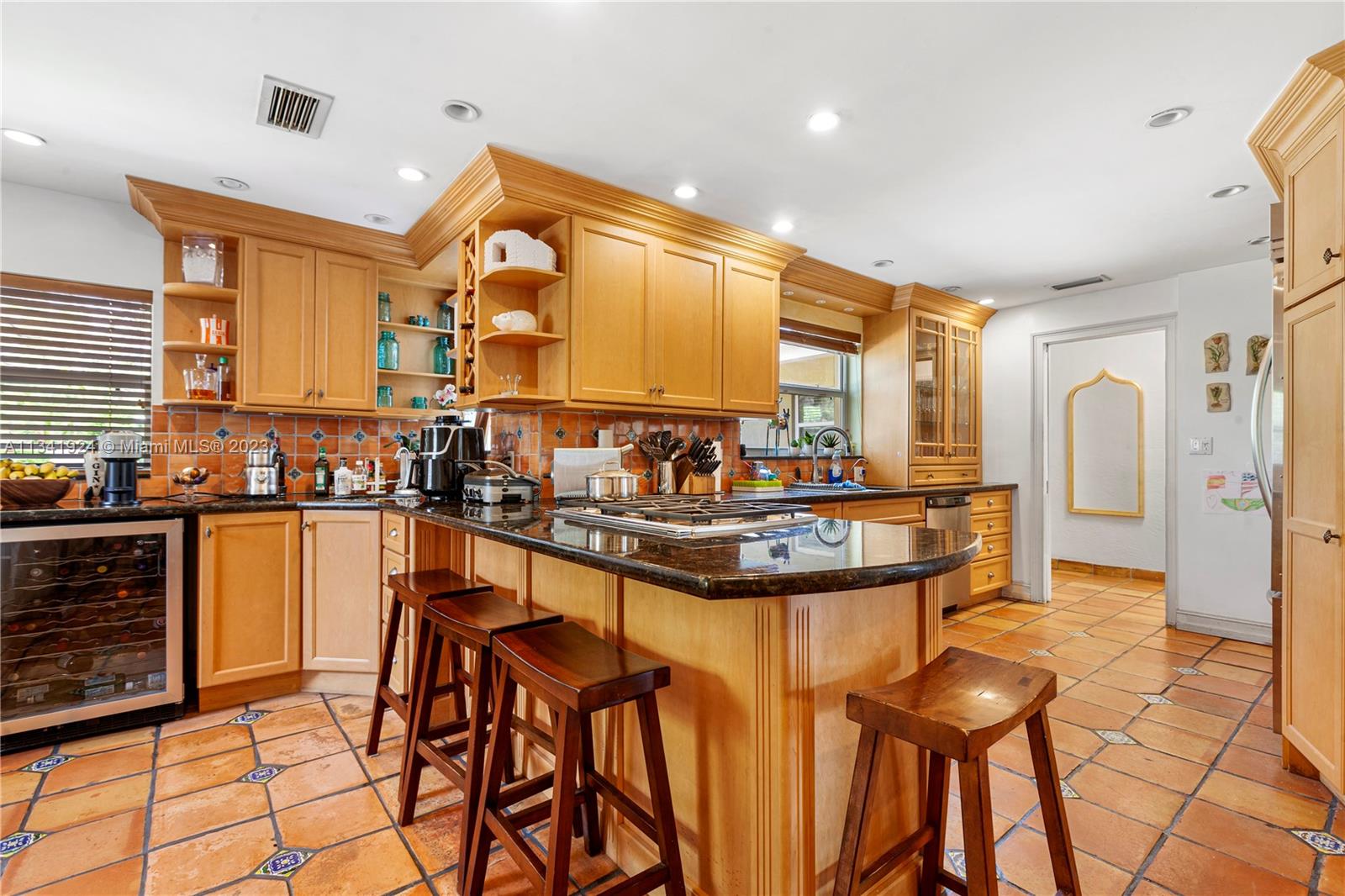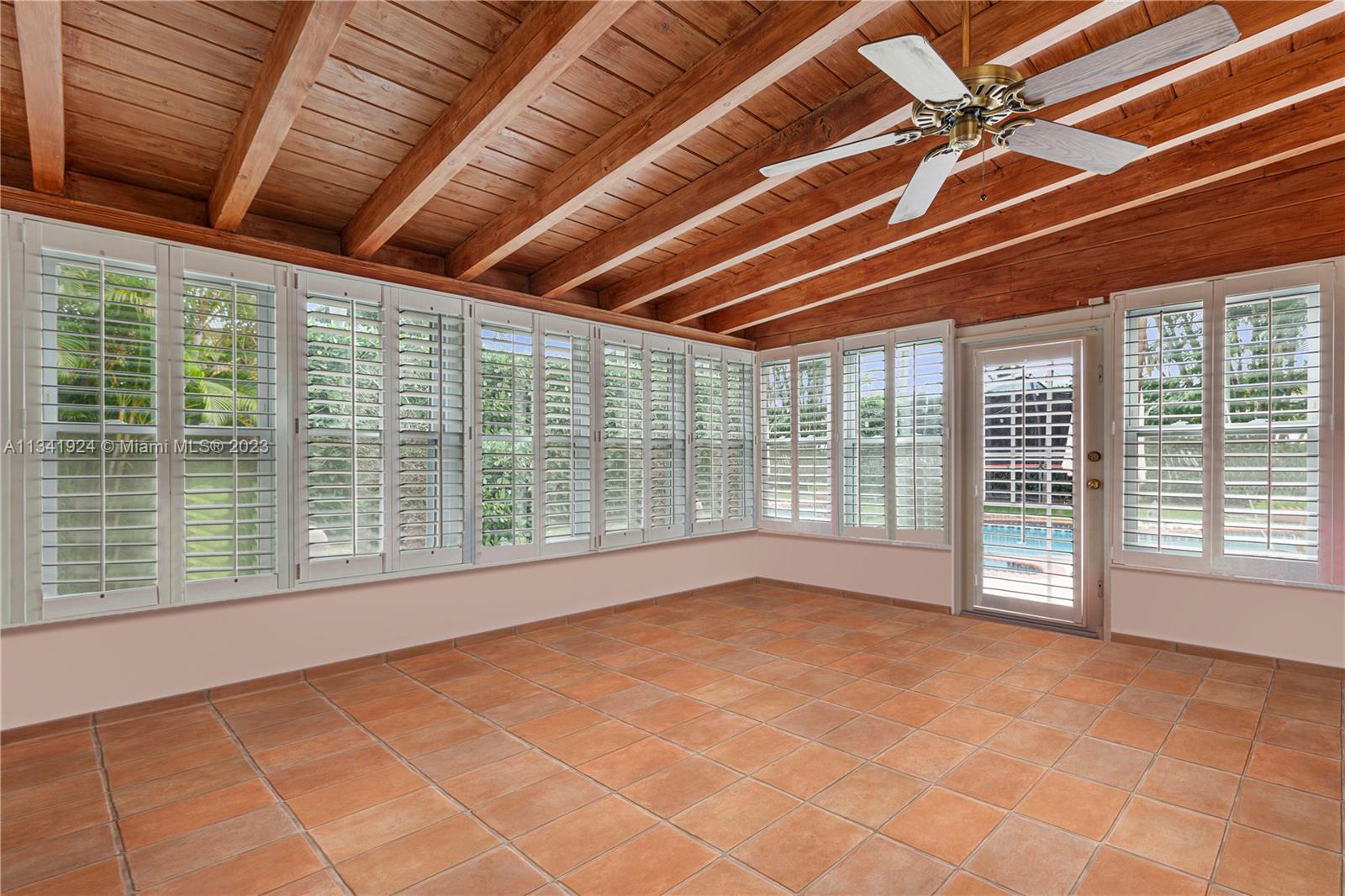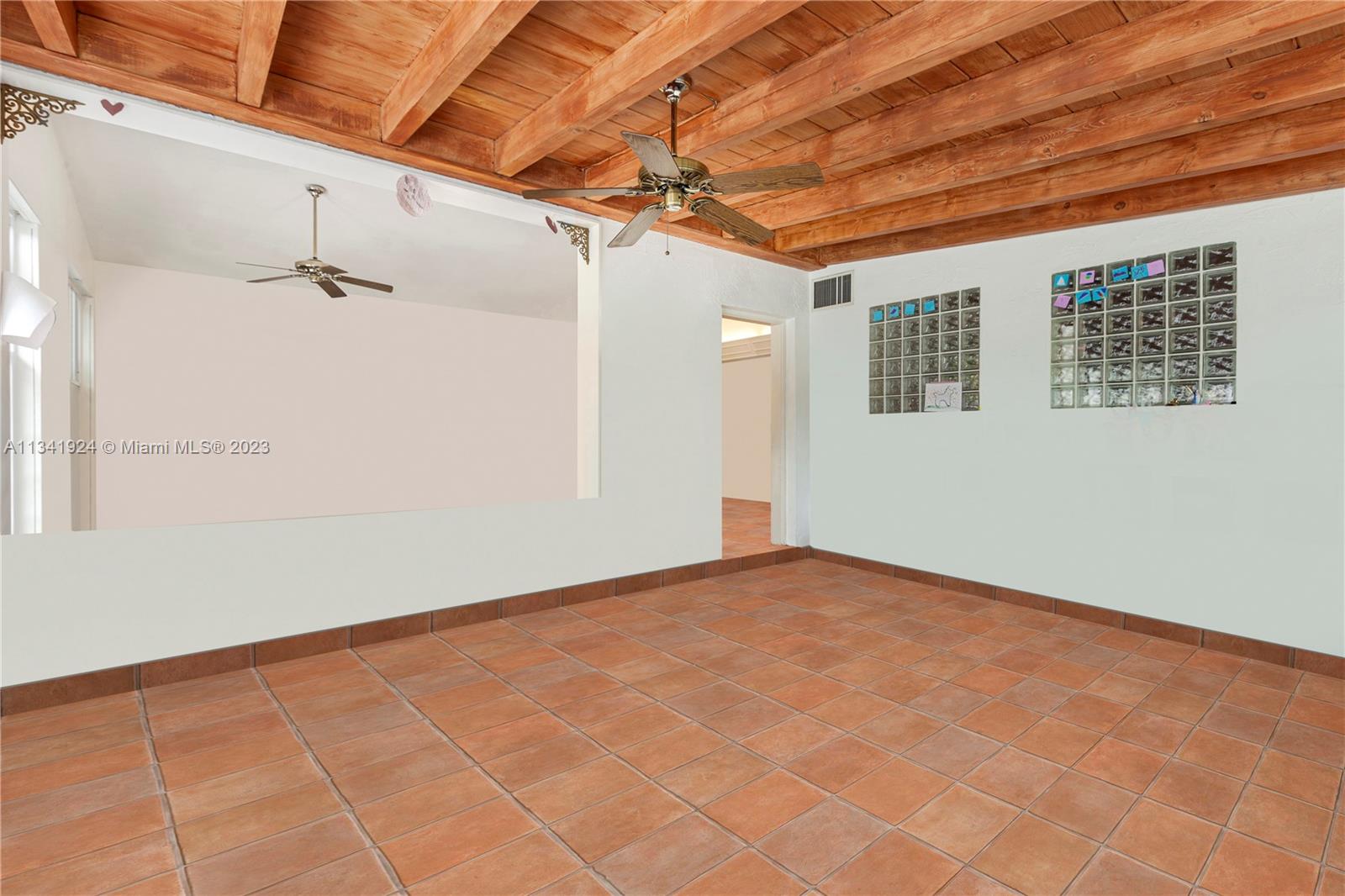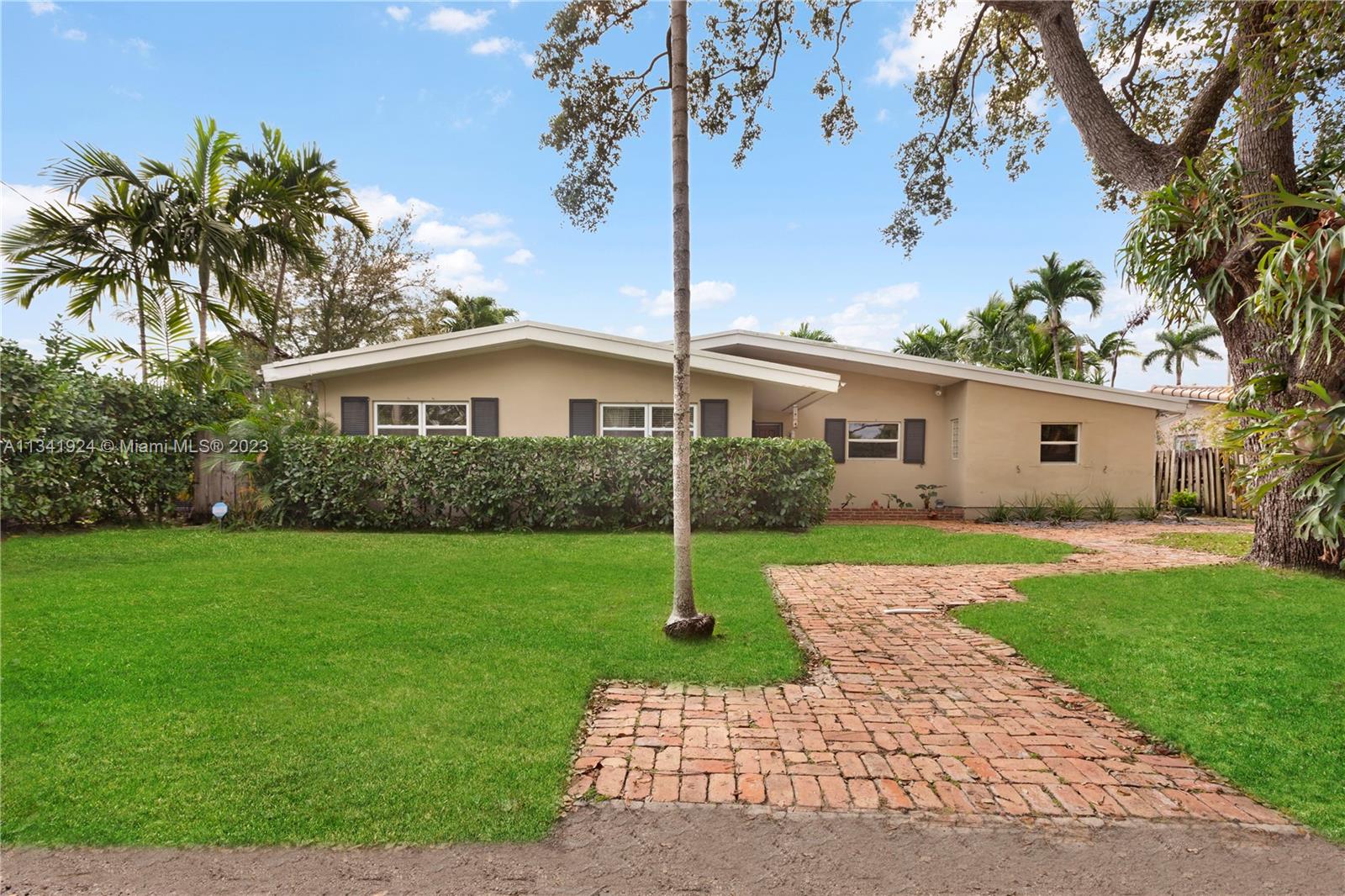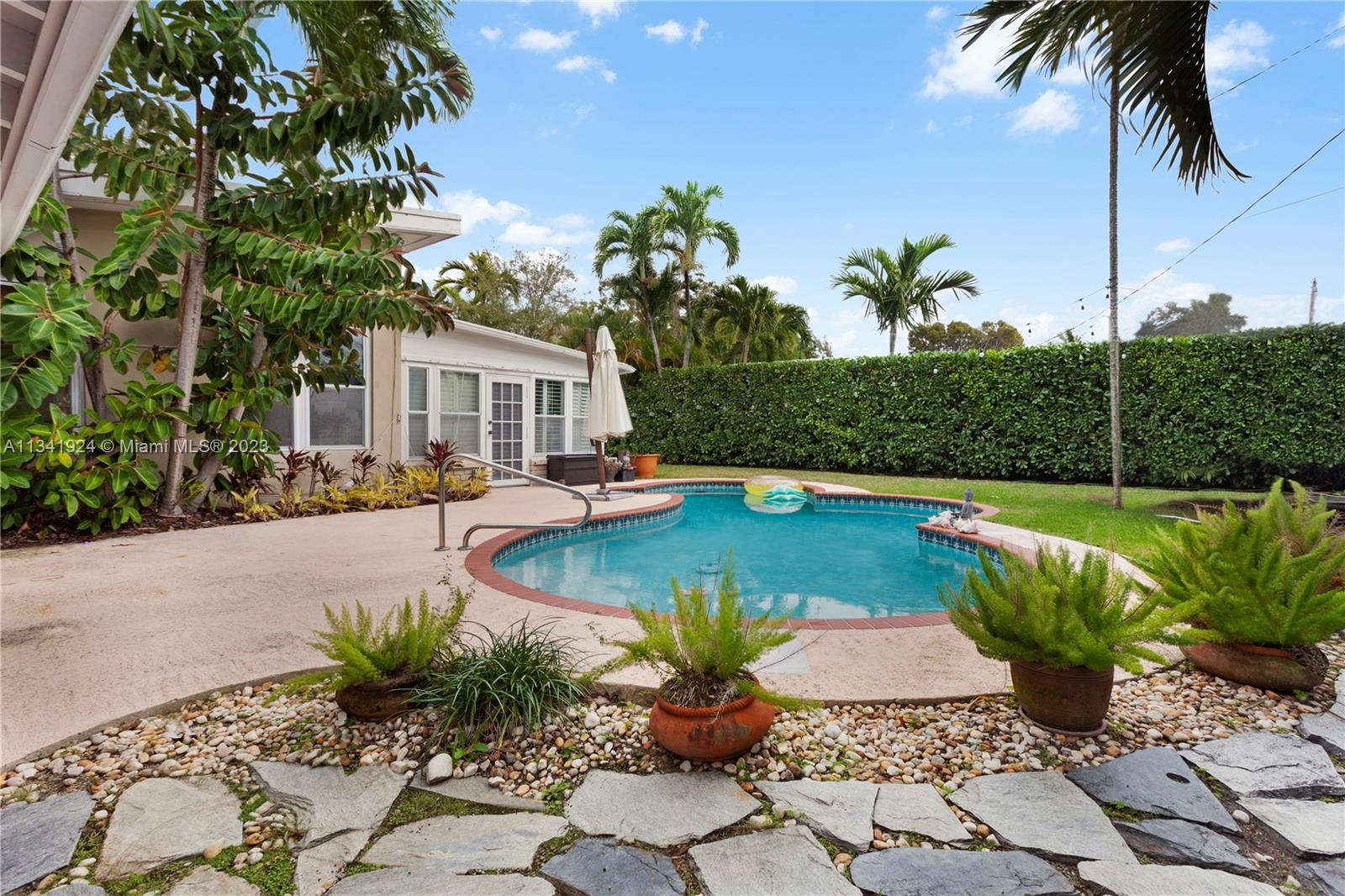 Mid-century ranch-style residence in coveted eastern Miami Shores location. Nestled between US1 and Biscayne Bay, this spacious 1950s 3-bed + den home has winning features: open plan living & dining spaces with vaulted ceiling, large kitchen, terra cotta floors, ceiling fans, big windows, and gorgeous exposed wood beams in the sun-filled Florida room. Expansive landscaped backyard with a beautiful kidney-shaped pool and deep shaded cabana area make this home ideal for indoor/outdoor entertaining. Close to schools, supermarkets, restaurants, shopping, houses of worship, sports facilities and golf course. Minutes to the Miami Design District, Bal Harbour and Aventura Mall. Easy access to the airport. Sold as is, currently tenant-occupied, CASH ONLY. Showing by appointment only.