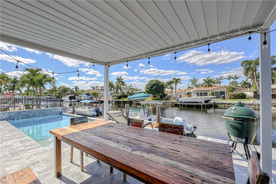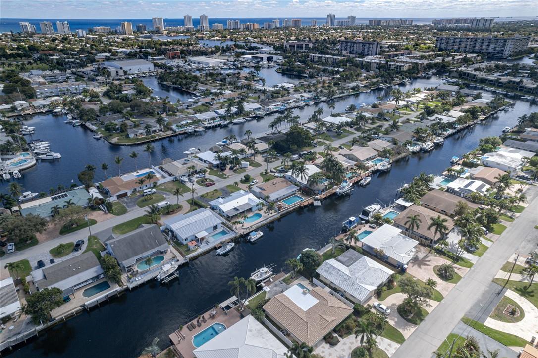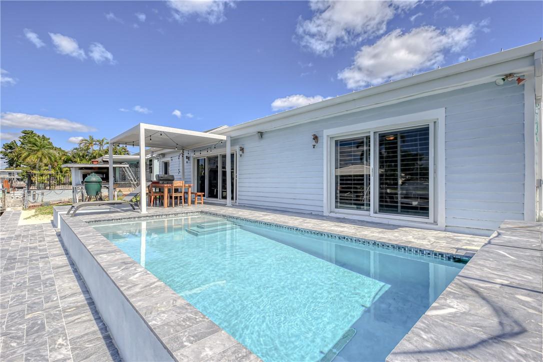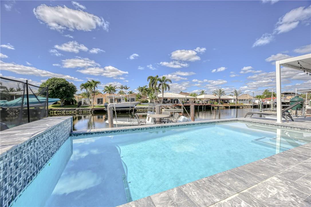 SNUG HARBOR: Situated on 70 feet of water, this home features 4 bedrooms, 2 bathrooms, 1 car garage, pool & is fully remodeled! Only 1 bridge at Federal Highway. Travertine floors throughout, recessed lighting, Plantation shutters, crown molding+++. Open kitchen has bar seating for 6, stainless appliances, leathered granite, built in pantry, 6 burner gas stove & more! Multiple living areas including dining & family room offer great space & wonderful water views. Spacious master w/ walk in closet, sliders to the pool, large shower & double vanity. Fenced yard, custom pergola, large covered patio, heated salt pool. Fully upgraded w/ impact windows & doors, upgraded electrical, metal roof 2022, AC 2022. All ages, no HOA, rentals OK. Enjoy waterfront living at its finest!