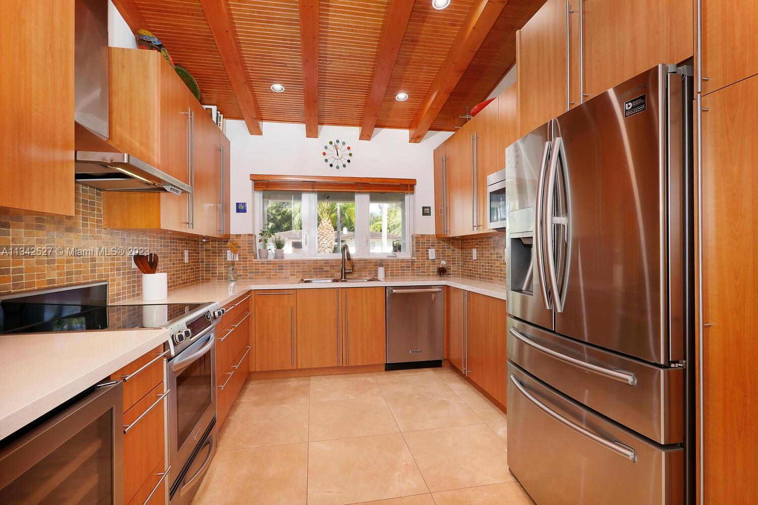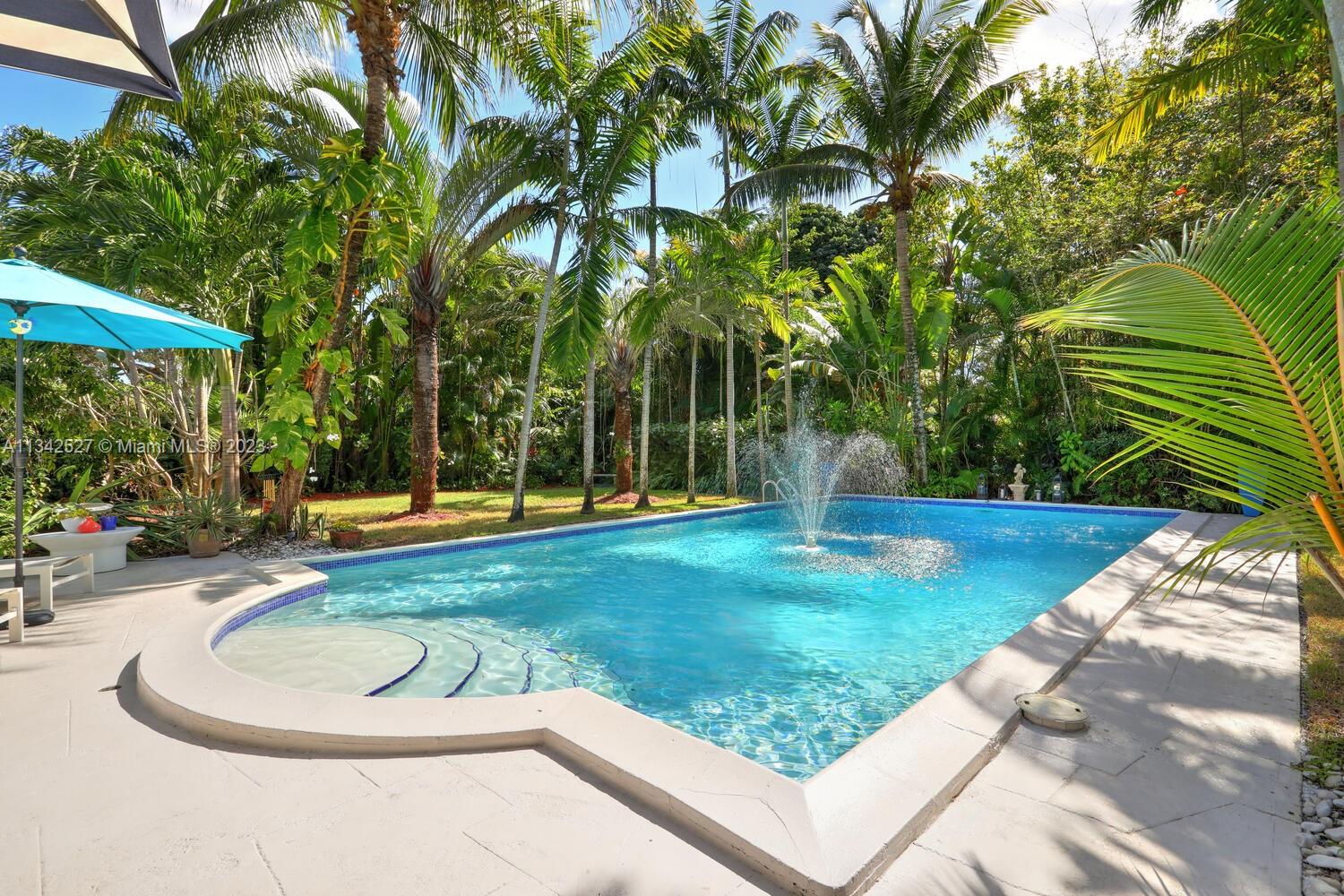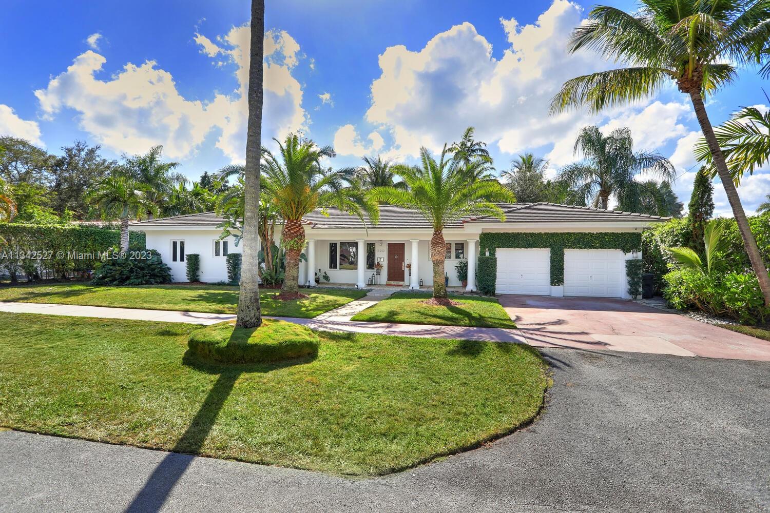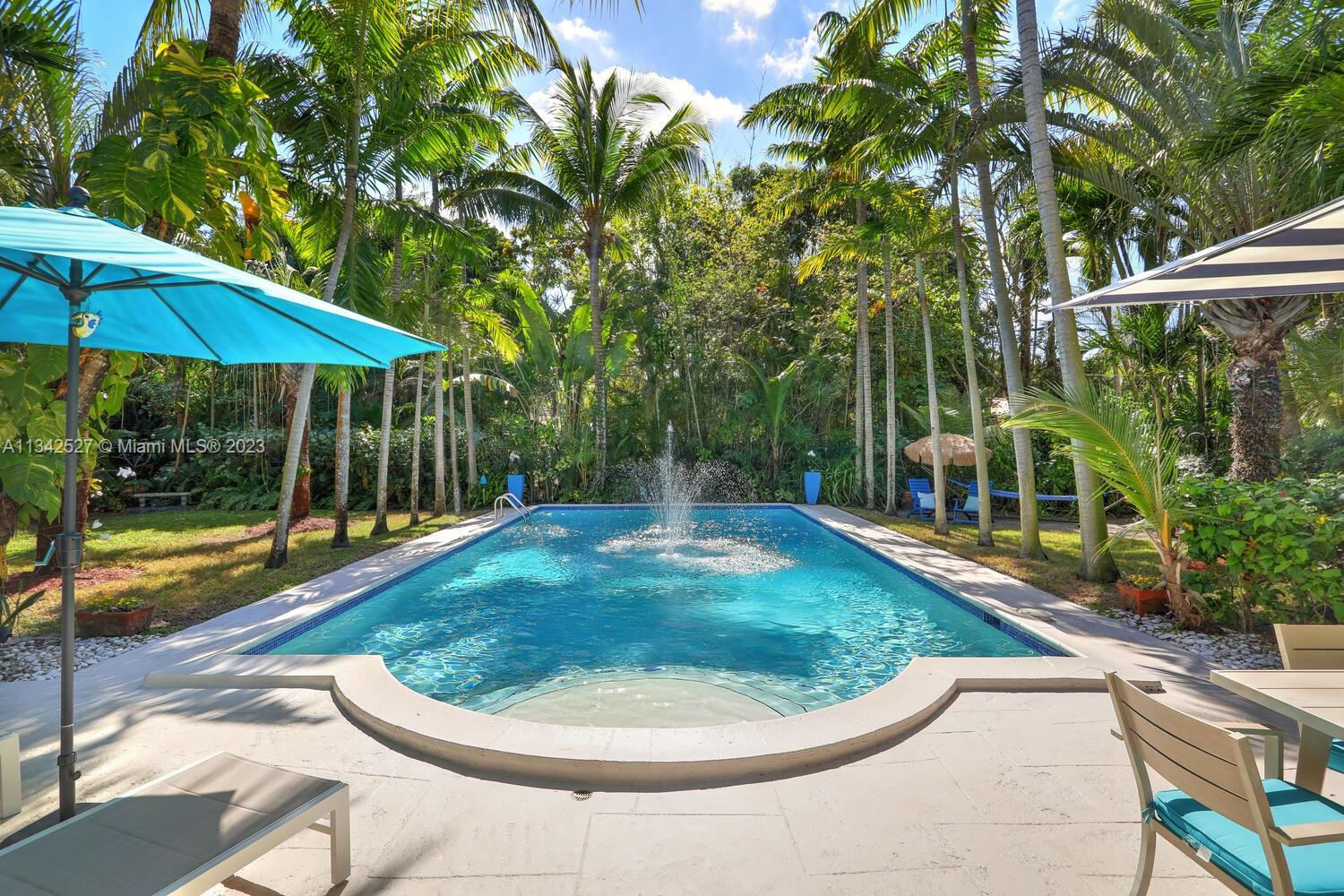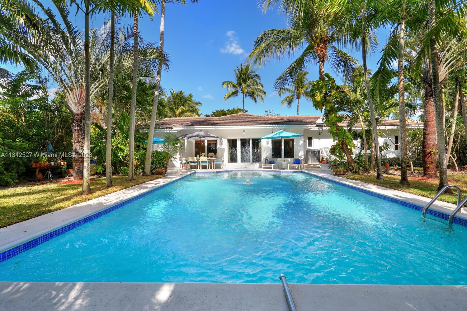 Lovely Bermuda-style inspired home set on large 12,500 sqft lot with lush tropical landscaping surrounding 25K gallon saltwater pool, located in the highly coveted South Gables neighborhood. Completely rebuilt in 2005 according to the South Florida Building Code including new roof, impact glass casement windows and doors, and all new interior infrastructure. This beautiful home features open floor light-filled living spaces with cathedral wood ceiling, elegant Crema Marfil marble flooring and stunning views of the pool and secluded garden area. Modern-style kitchen with wood cabinetry, quartz countertop and energy saving stainless steel appliances. Ample land for home expansion. Home features ADT/Ring alarm system with closed circuit cameras and large air conditioned two car garage.