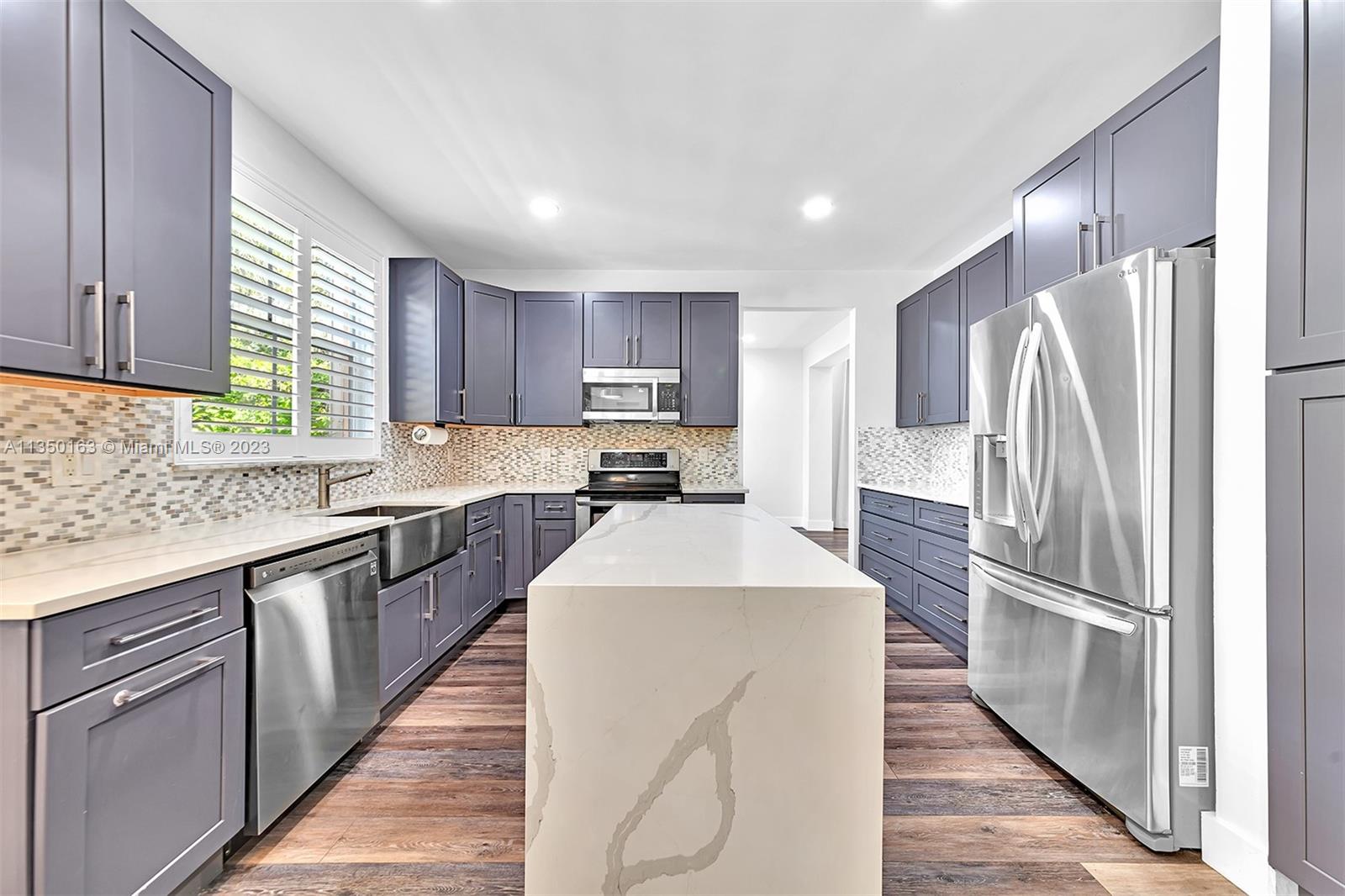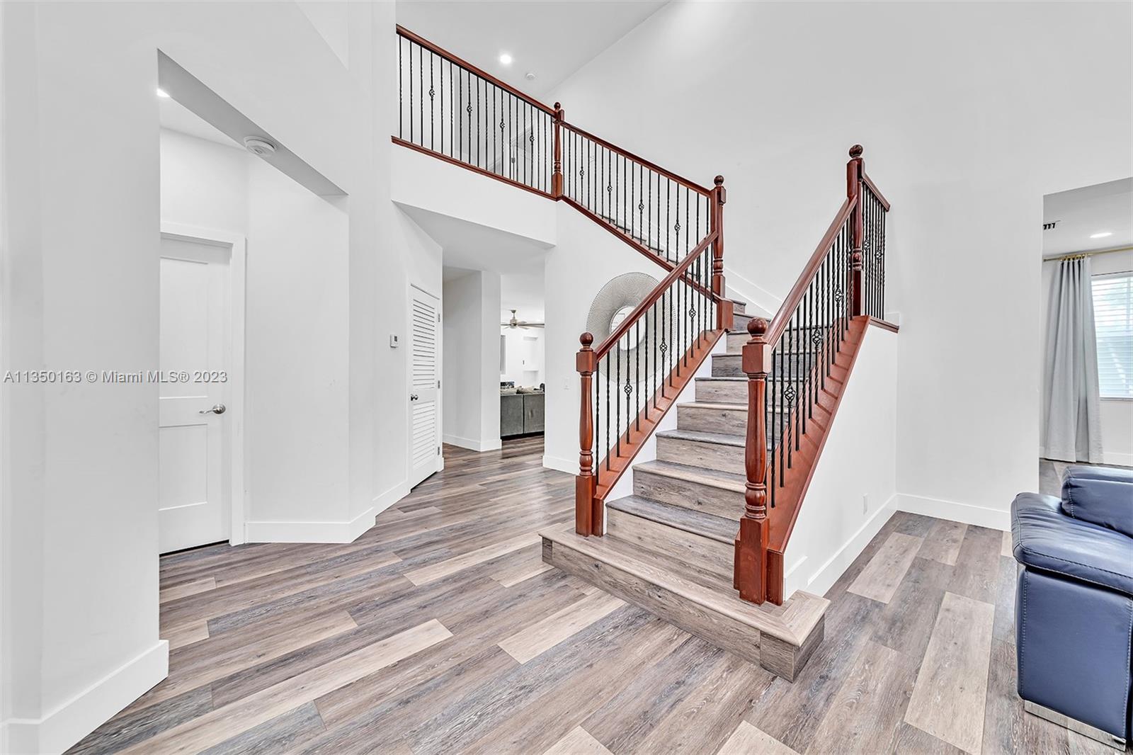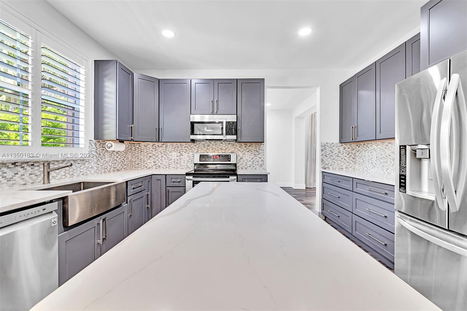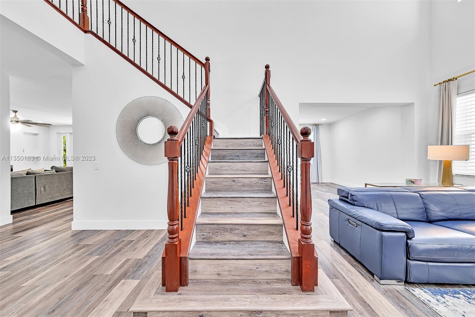 This exquisitely remodeled 6 bedroom/4 bath pool home is located in one of the most desirable neighborhoods in Weston and offers high end appointments throughout.The main floor opens to a sun-filled great room with soaring ceilings and features a gourmet kitchen with modern cabinetry, farmhouse sink, upgraded quartz countertops, waterfall quartz island, stainless-steel appliances and glass tile accents. Formal dining room, large family room with fireplace. One bedroom and bath on the first floor. Large owner's suite features walk-in closet. The master bath features seamless/frameless glass shower doors and dual sinks. Additional amenities include a private fenced backyard with resort style pool, covered patio and 3-car garage. A/C 2017. 24hr Guard Gated Community. A rated Weston schools.
